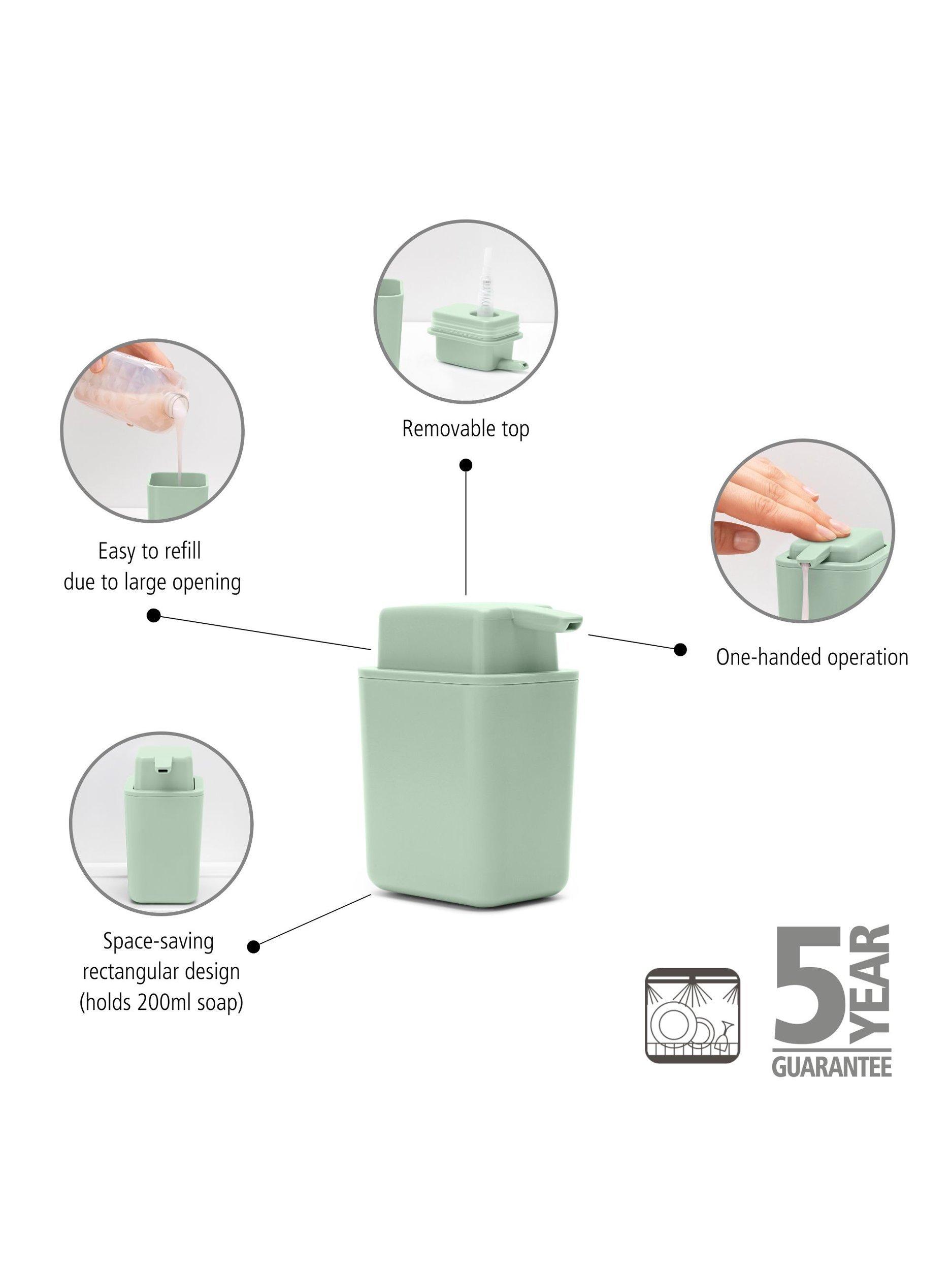 It has a handy space saving rectangular design and clean, non-drip soap pump that's easy to use and operable with one hand with no slipping and no scratching.