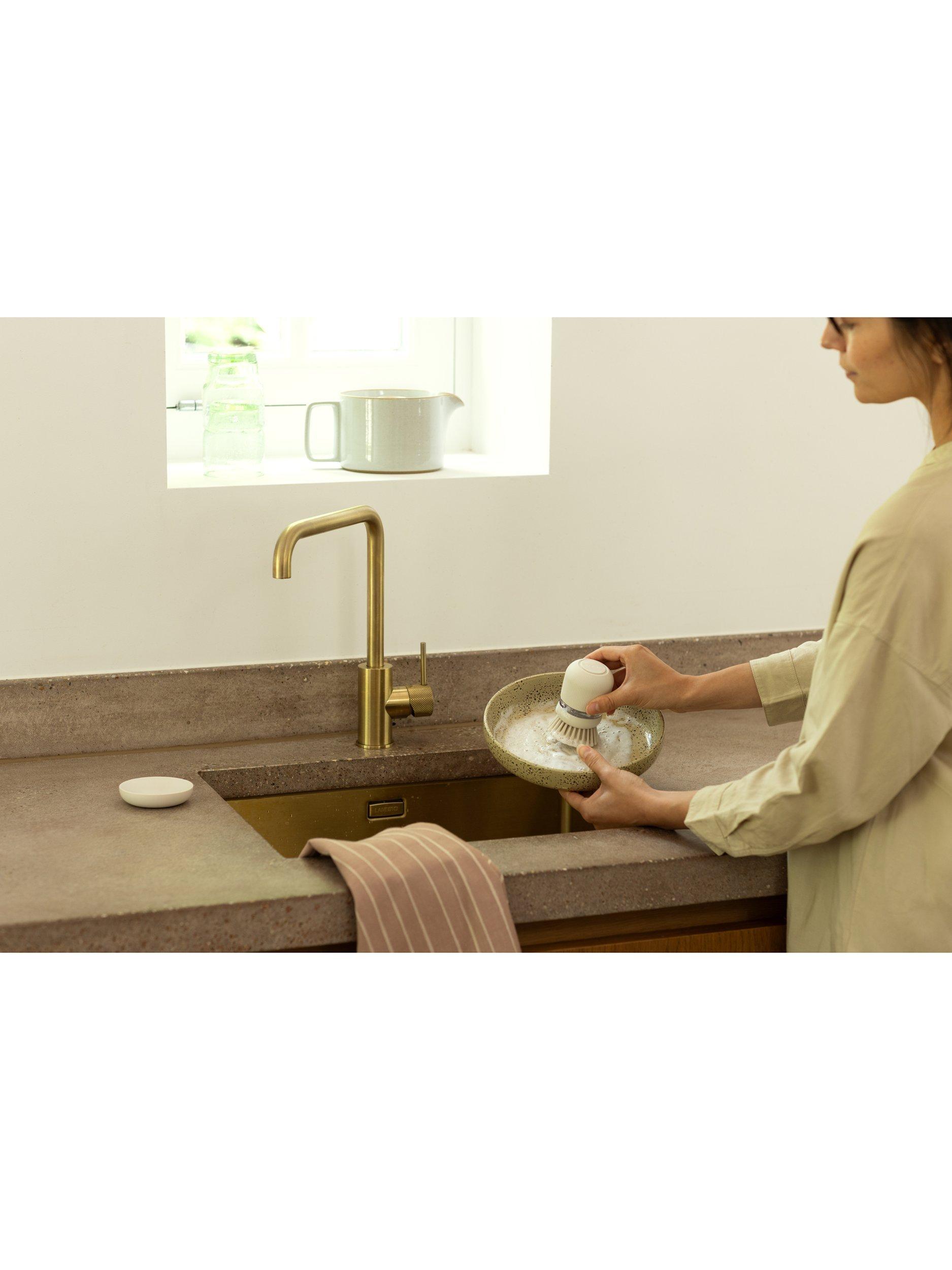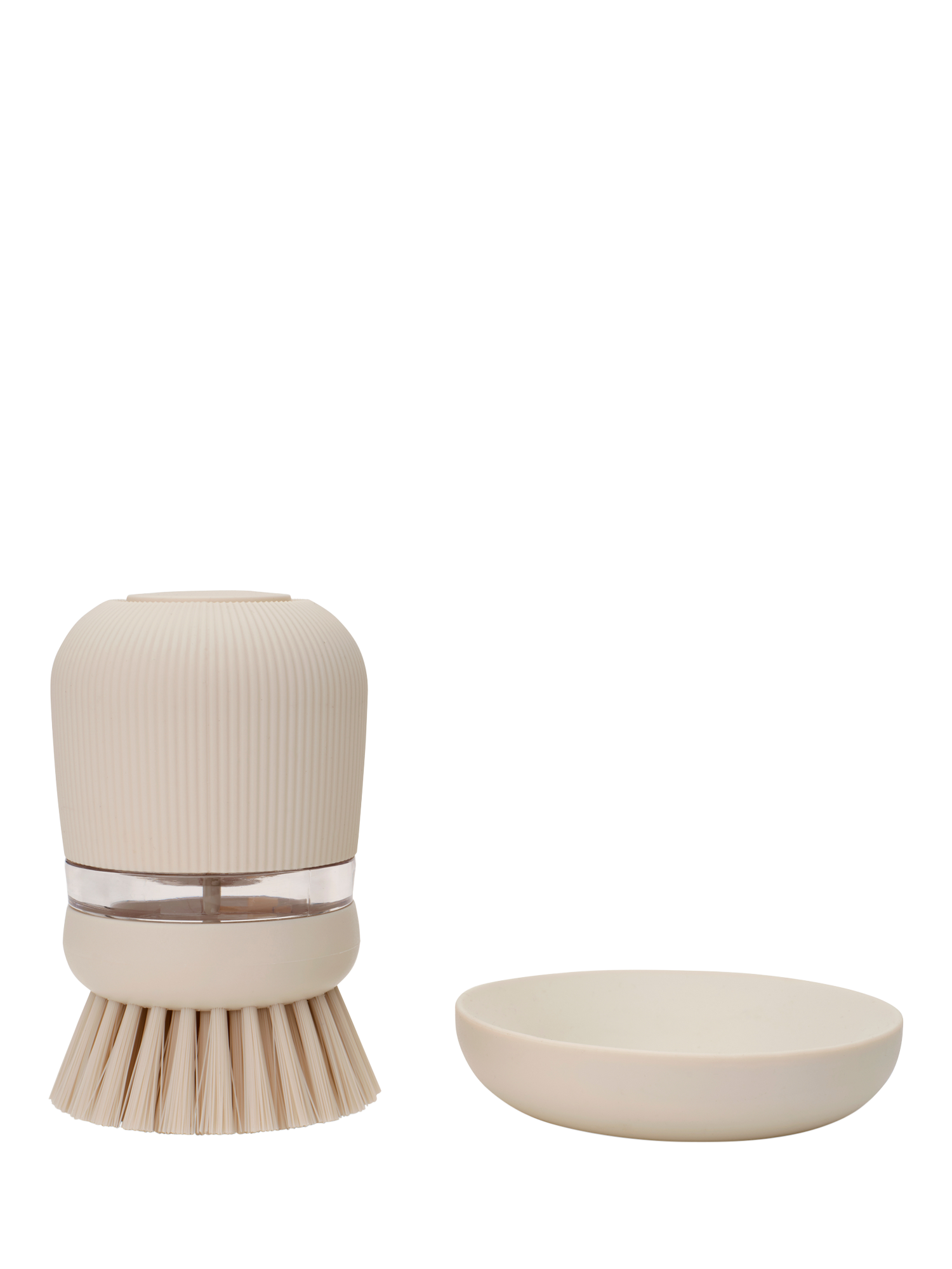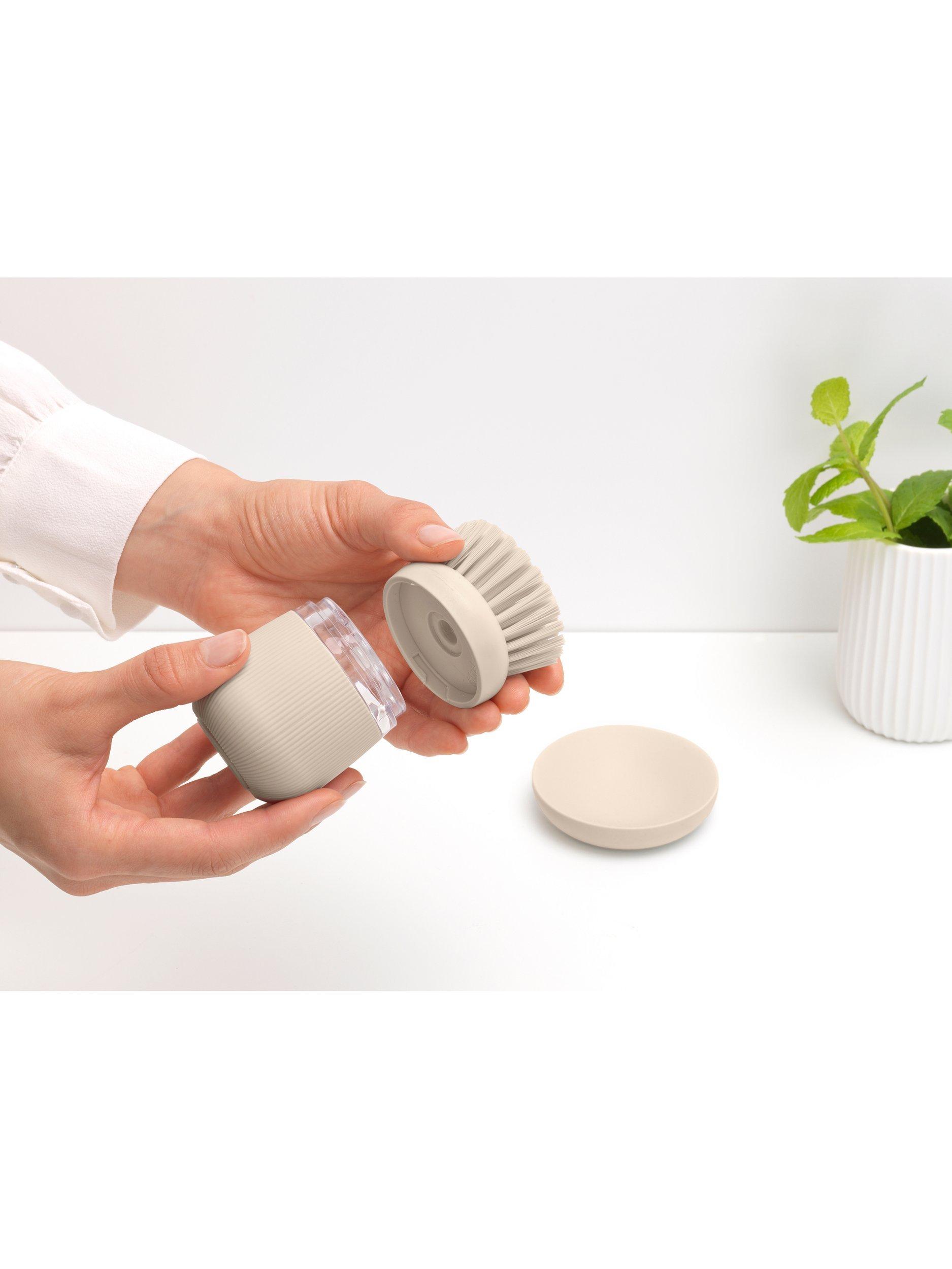 Brabantia's durable soap dispensing dish brush gives you instant scrubbing power while the neat storage stand catches excess water.