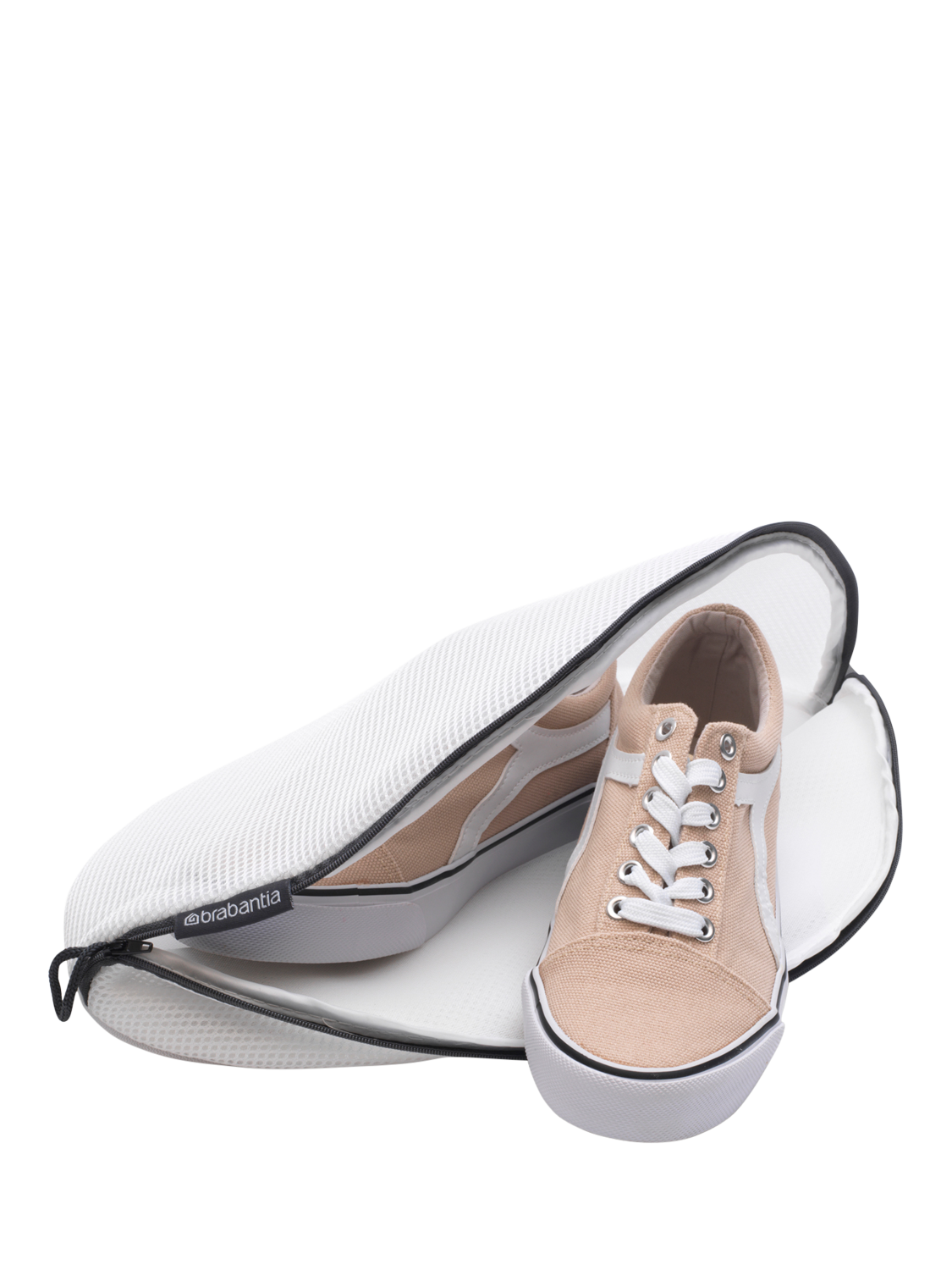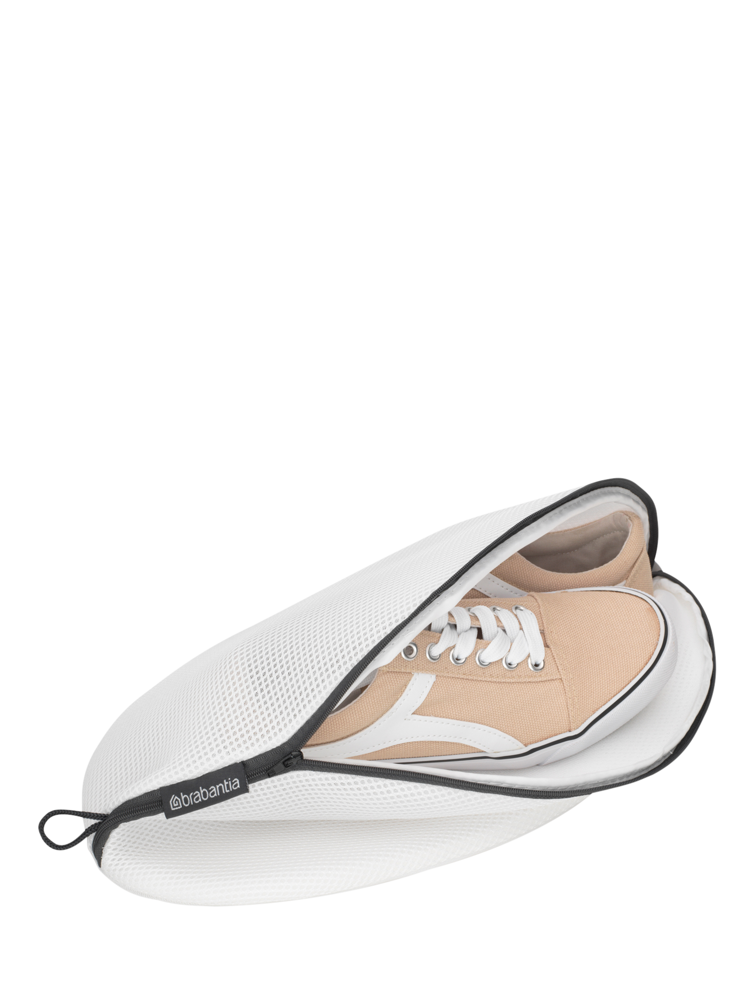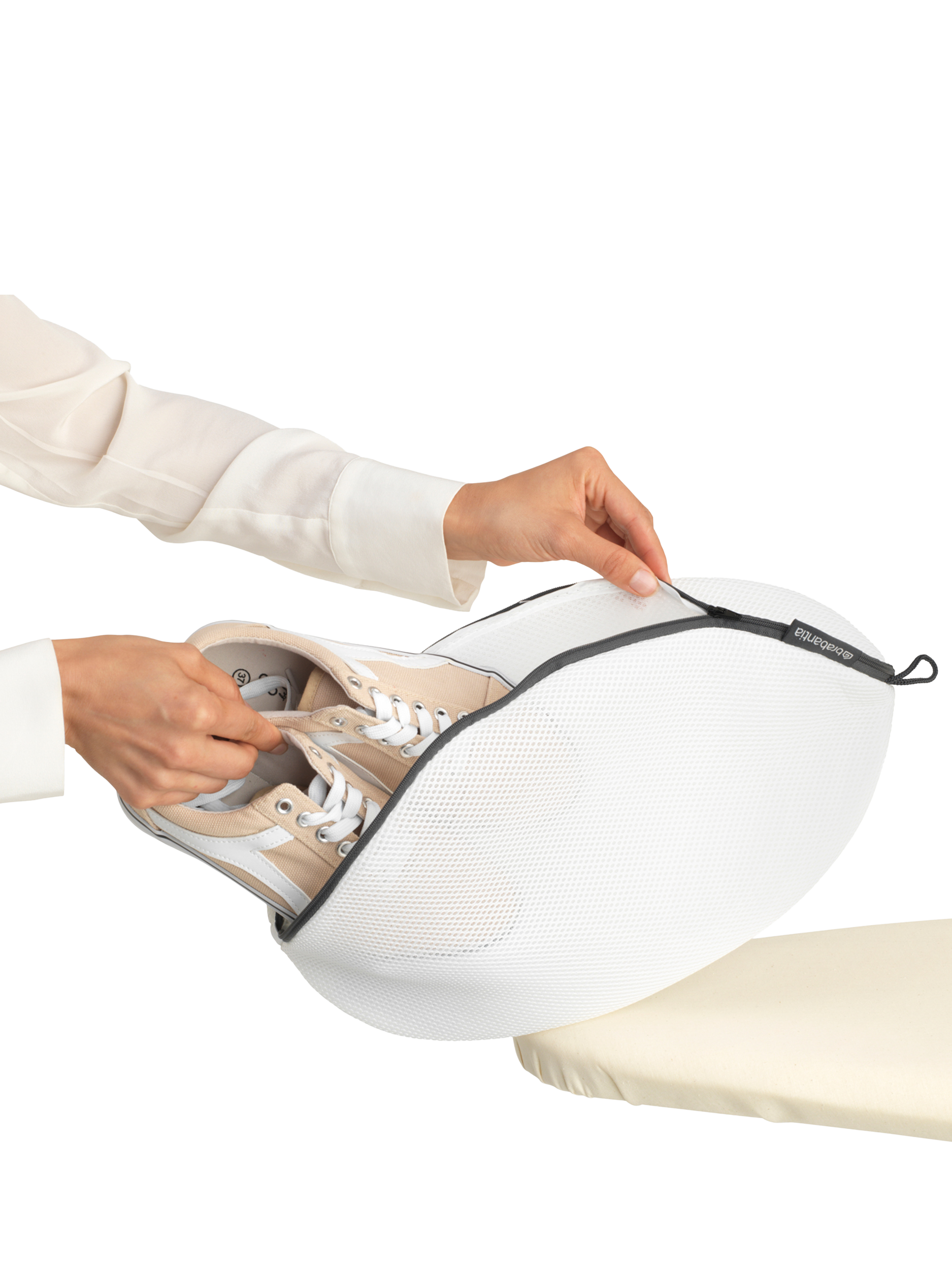 A strong mesh bag protecting washable slippers, trainers and other footwear when washing, rinsing or spinning.