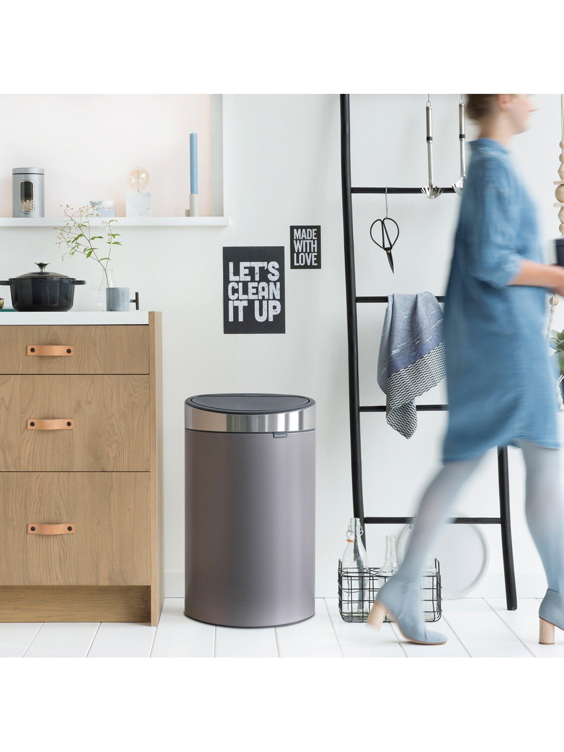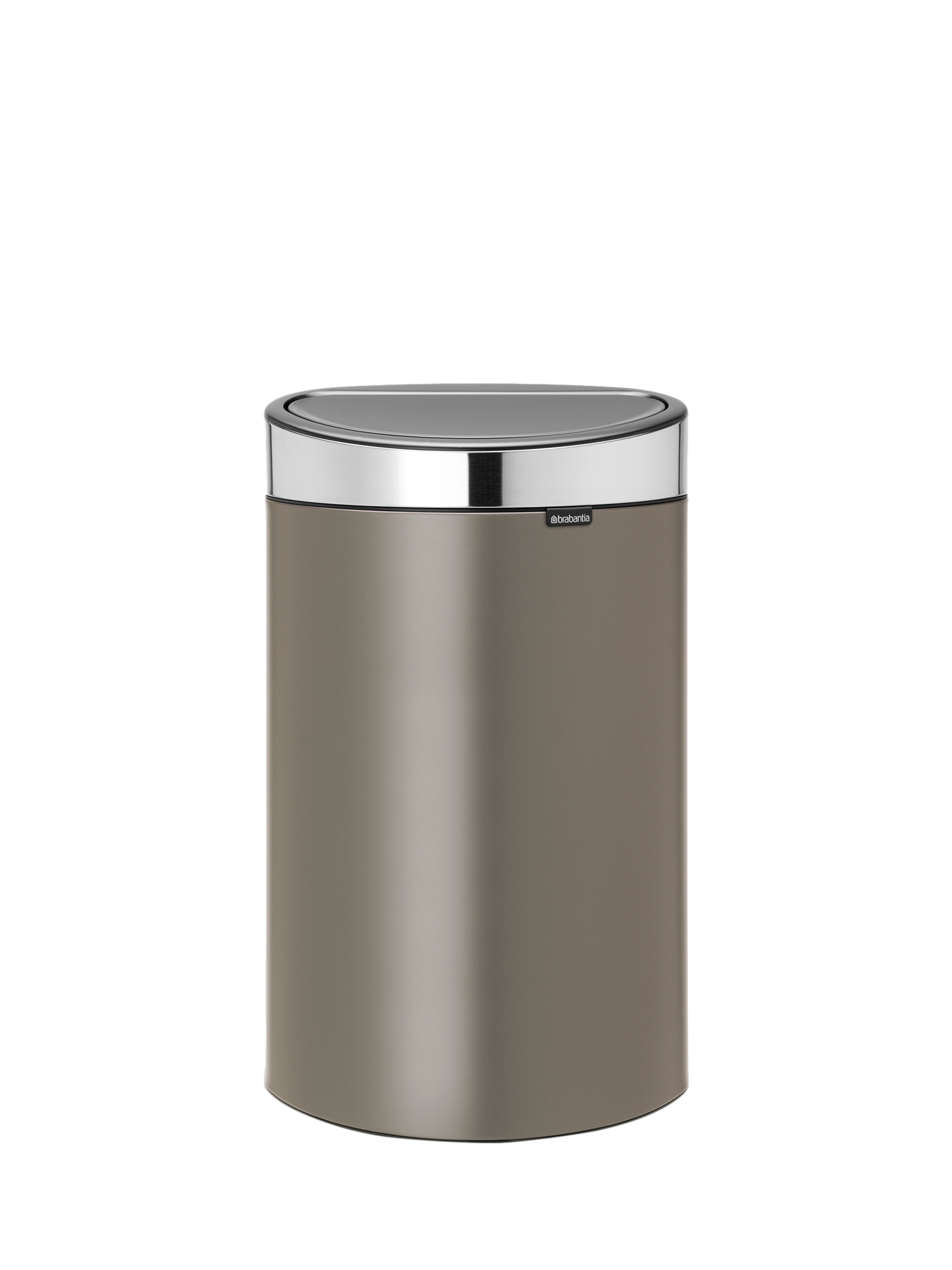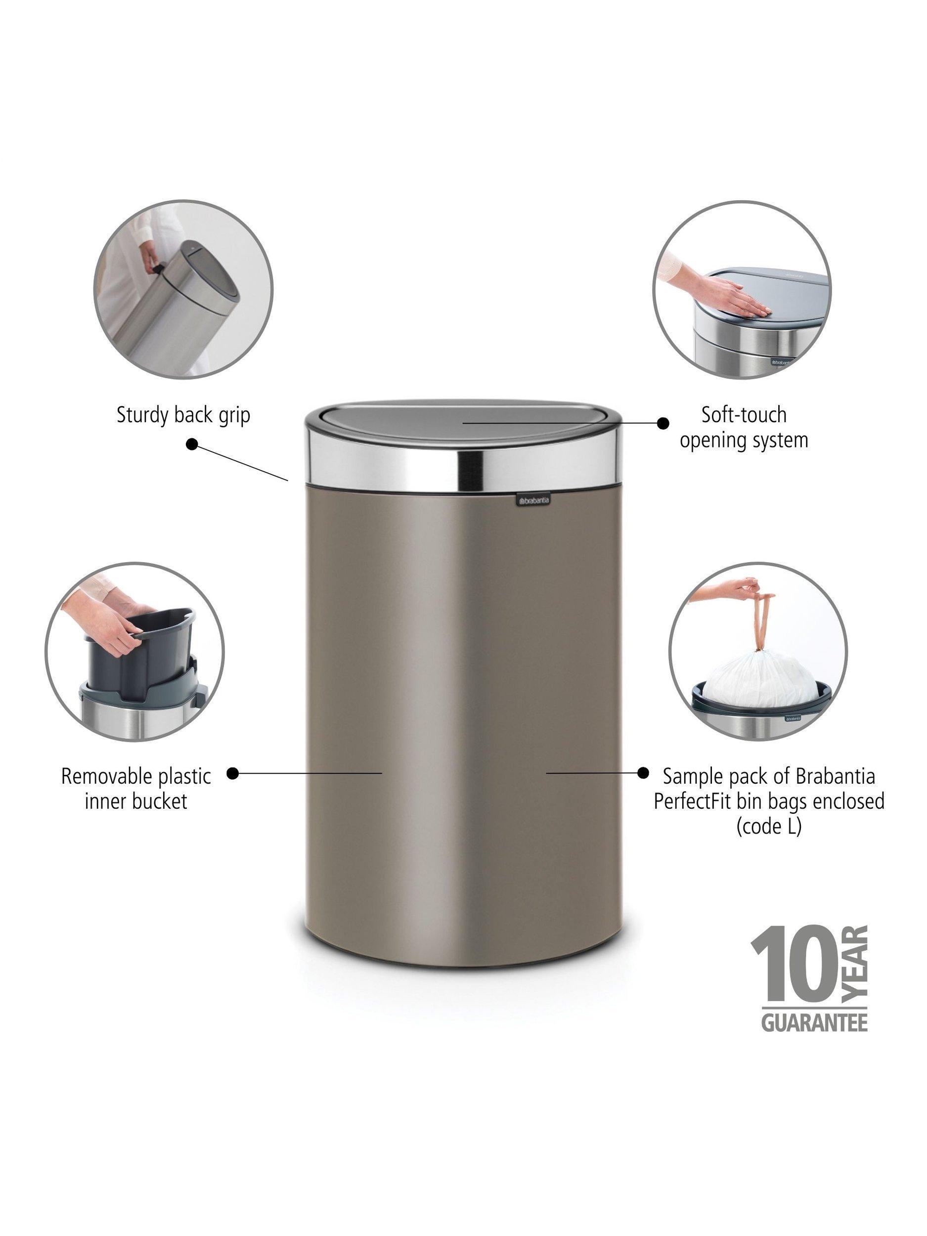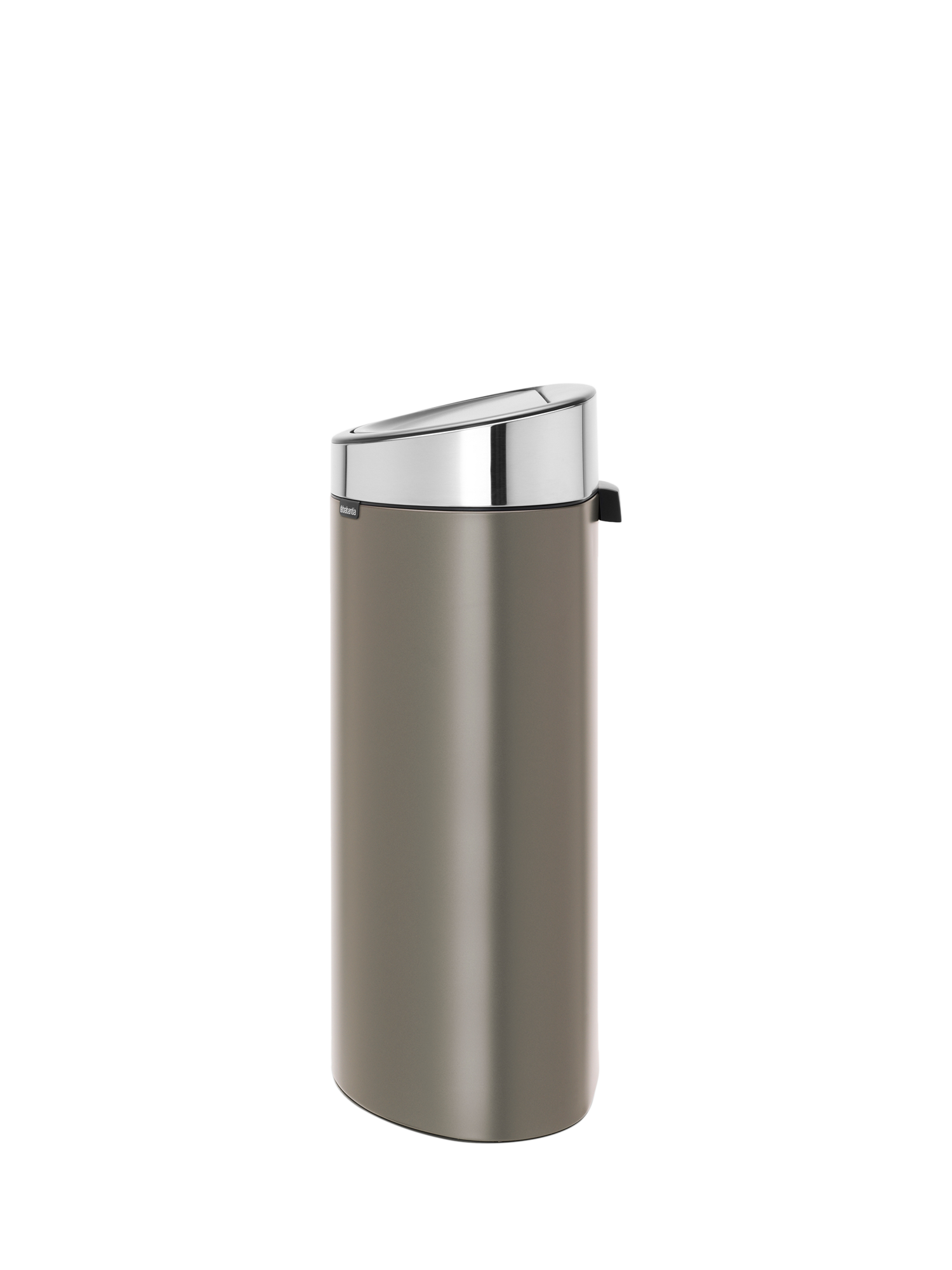 - Chrome plated, plastic and lacquered parts can be cleaned with a damp cloth and an all-purpose cleaning agent. Clean stainless steel with a micro-fibre cloth and glass cleaner. Do not use aggressive or abrasive products or products containing chloride.Brabantia Touch Bin 30 litre with plastic bucket, White with white lid. Easy and light operation, Brabantia's unique 'soft-touch' closure. Easy to empty the bin, removable lid unit. Easy to empty and clean, removable plastic inner bucket. Match