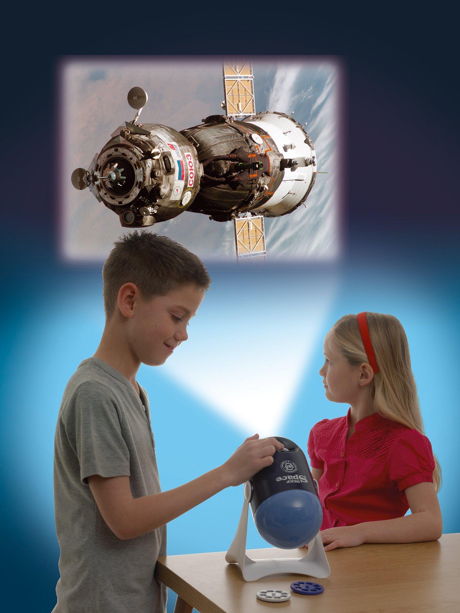 Swivel the unit around and use the high quality projector to view 24 colour NASA and Hubble Telescope photographs of spacecraft, astronauts, planets and nebulae from three changeable slide discs. The unit projects images up to one metre wide and still maintains clarity. Twist the lens head to focus the images on your wall or ceiling and turn the slide discs to change the photograph. Plus, unlock the secret code online to learn about the night sky and read fascinating information about each NASA photograph. This is a great gift for budding space explorers.