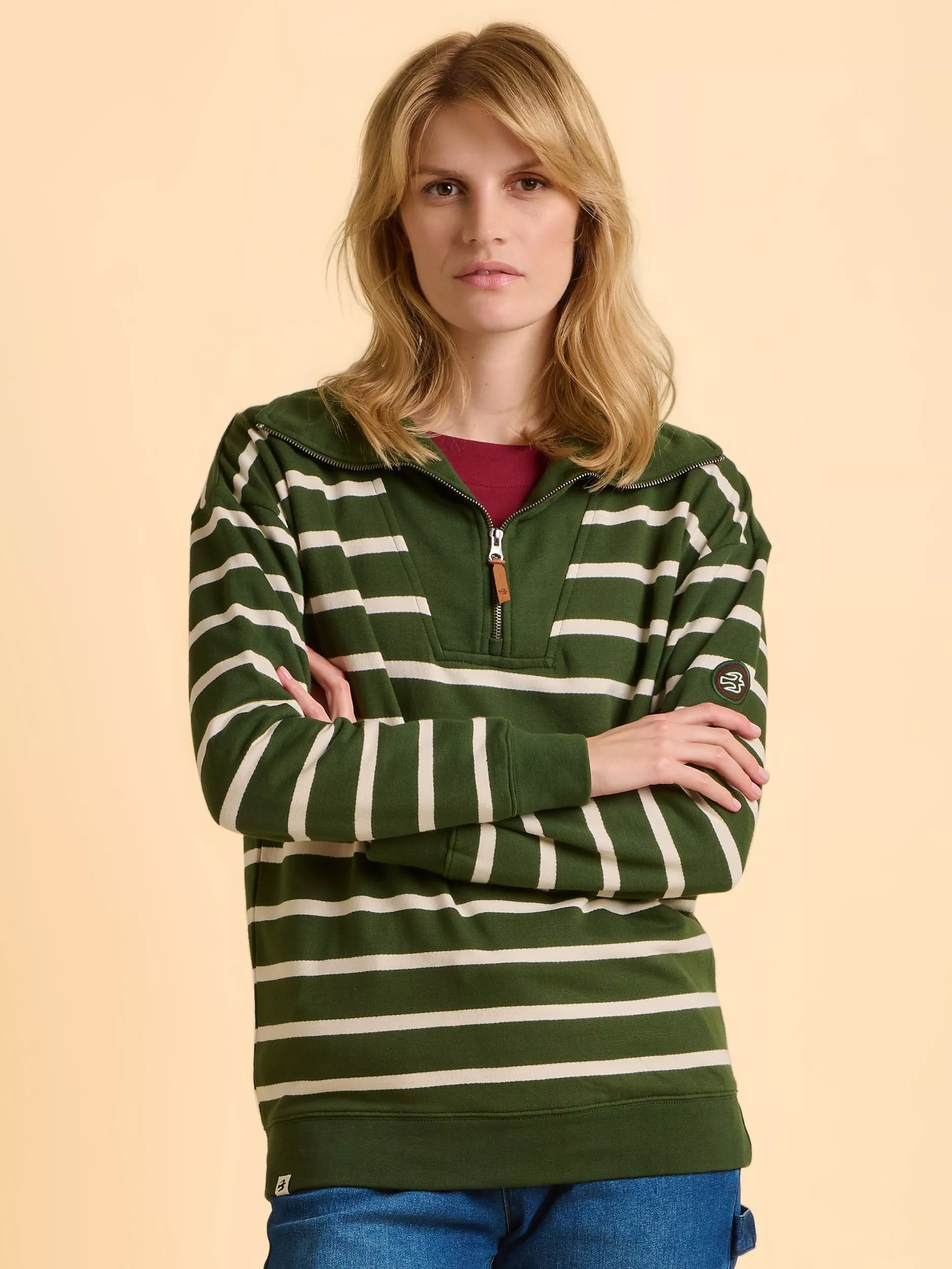 A soft, fine-knit zip neck sweatshirt that keeps you warm and comfortable, with classic stripes for a touch of character. Perfect for relaxed days or adding warmth to your favourite outfit. Easy to care for and always reliable.