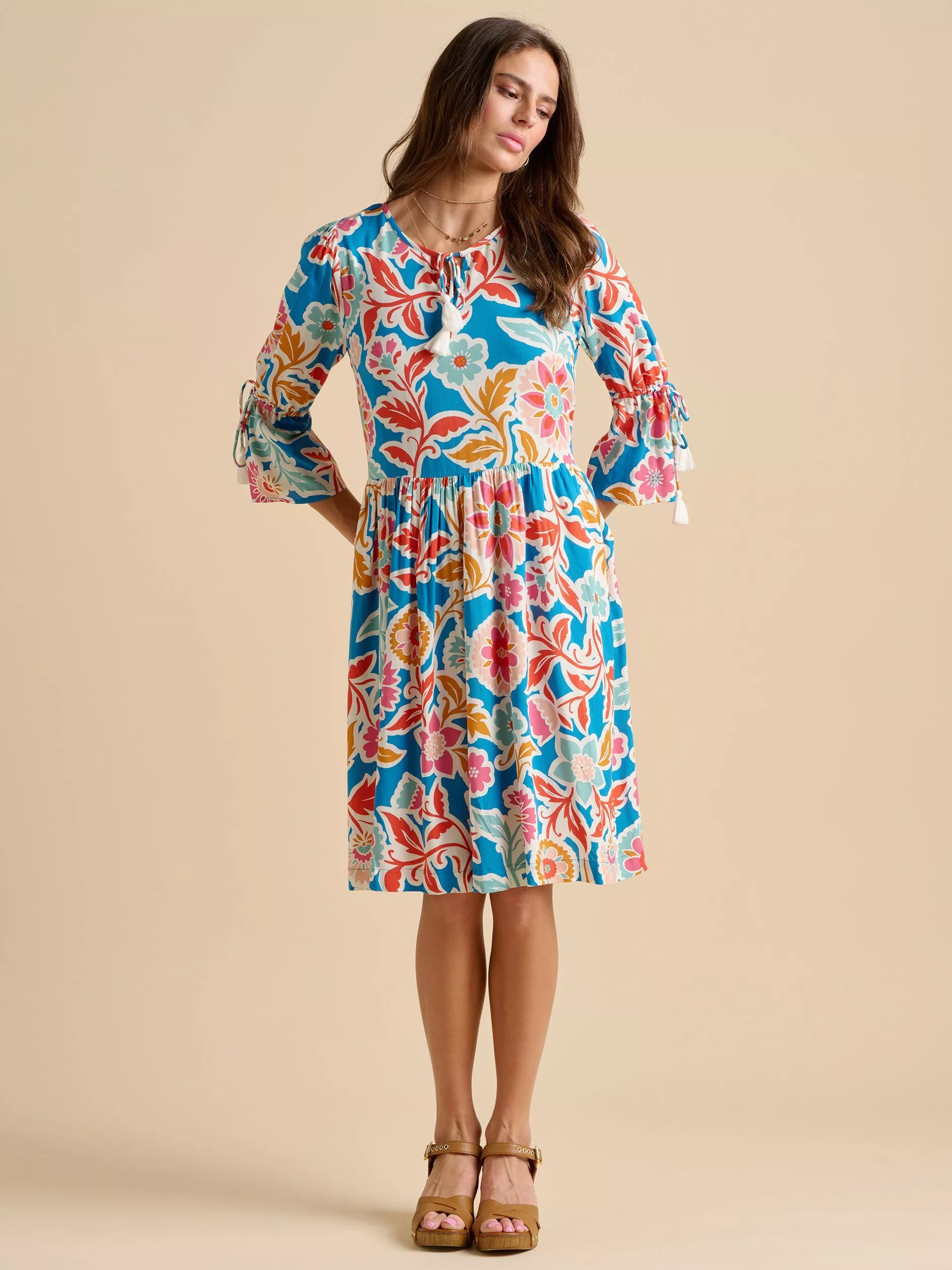 This vibrant knee-length dress is all about bold colours and joyful details! With tassel neck ties, a gathered waist, and a relaxed fit, it captures the essence of summer. Whether you're headed to a picnic or to dip your toes in the sea, pair it with sandals and a straw hat.