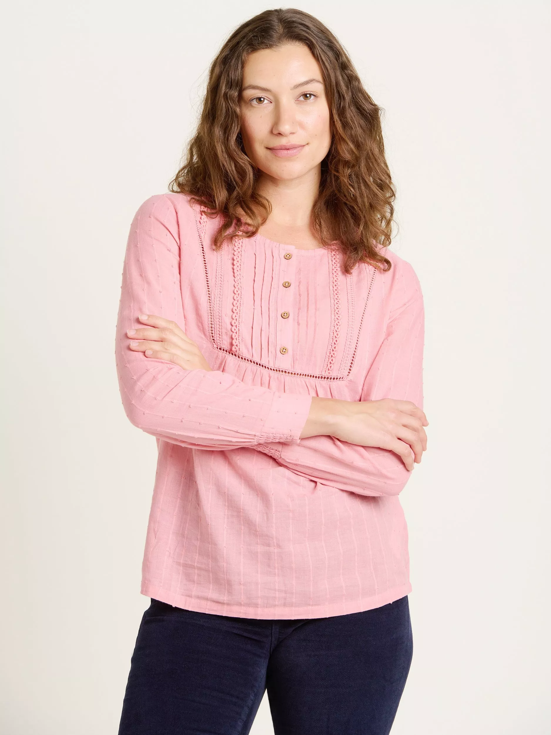 Introduce a pop of colour into your wardrobe with the Brakeburn Hive Blouse. Featuring a lacey, button-up yoke and a full-length sleeve, this cotton top works with a pinafore dress or layered up with knitwear and a pair of jeans. Wear for autumn breaks away or staycations closer to home.