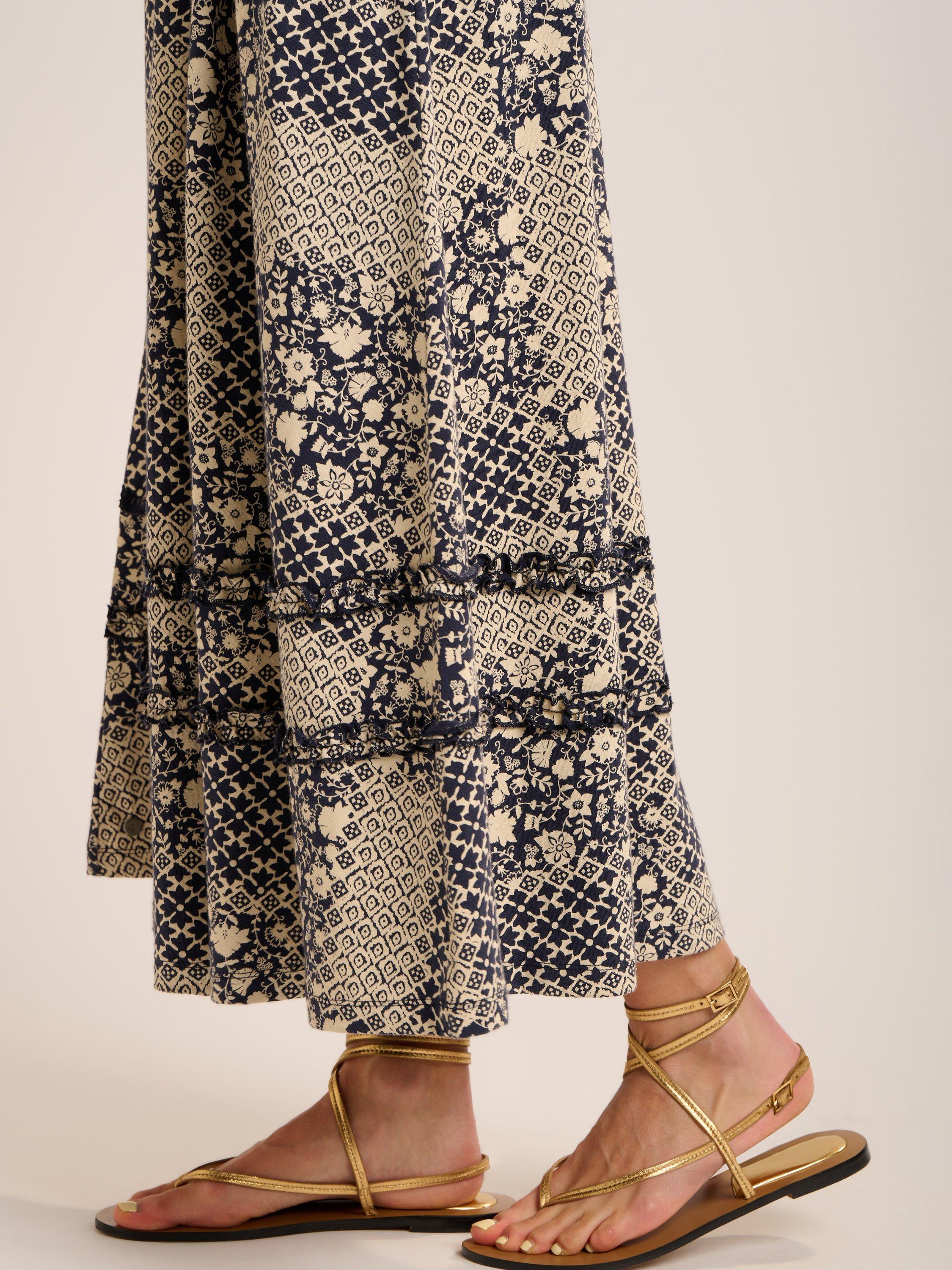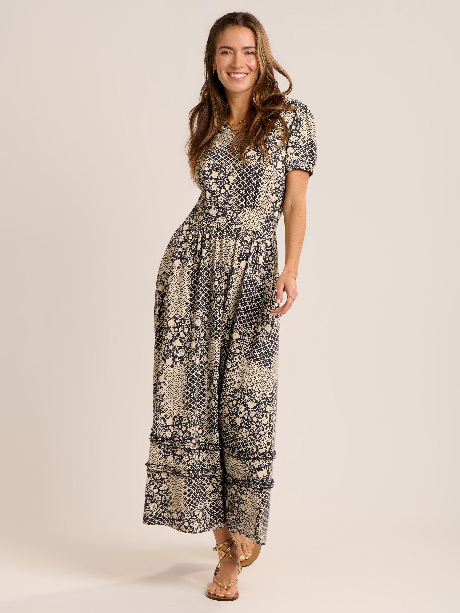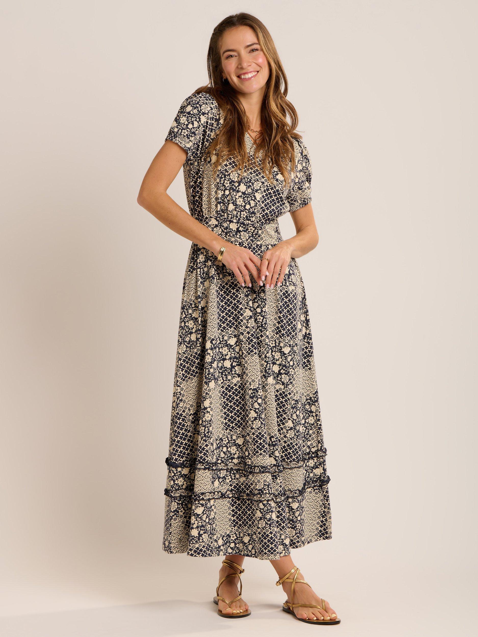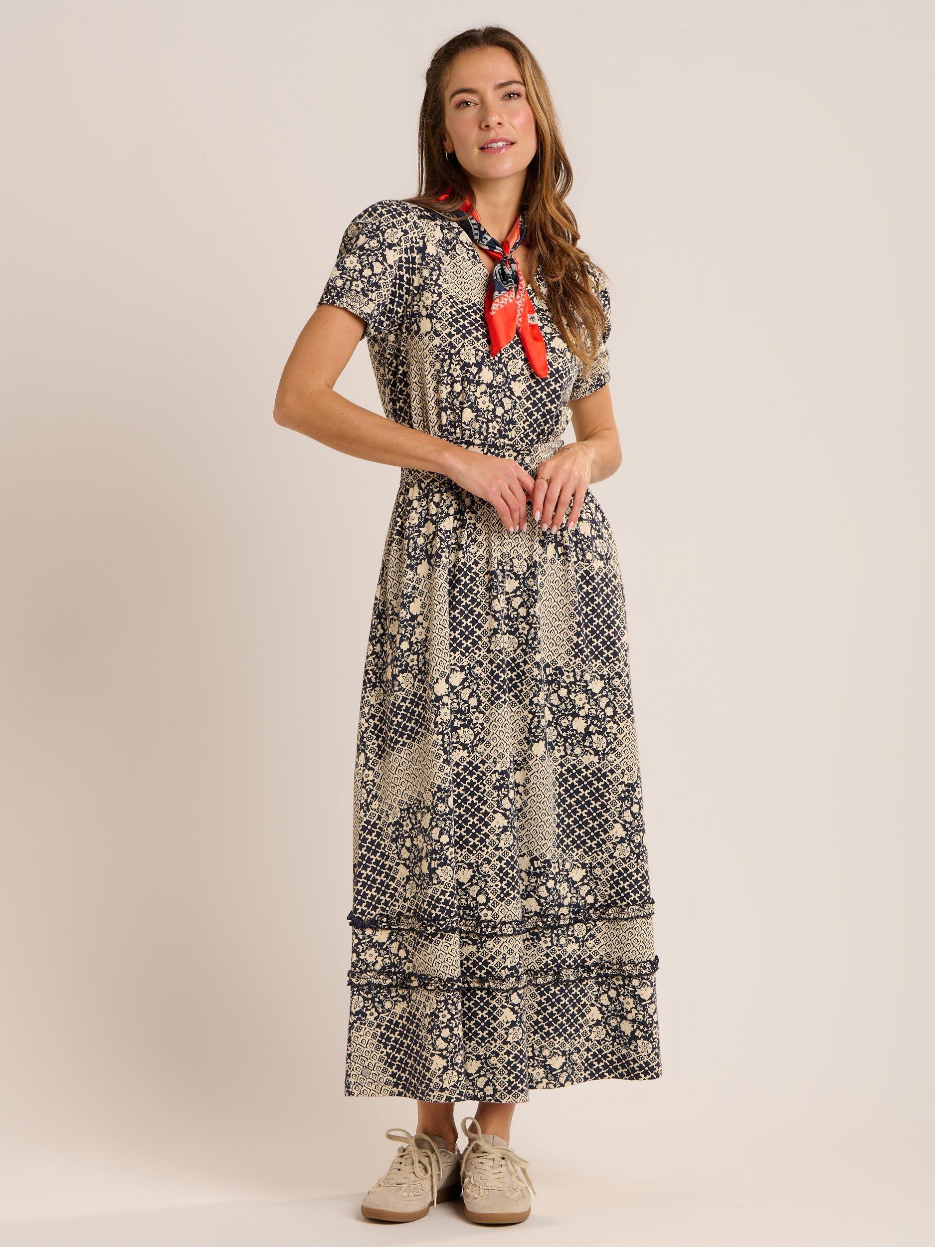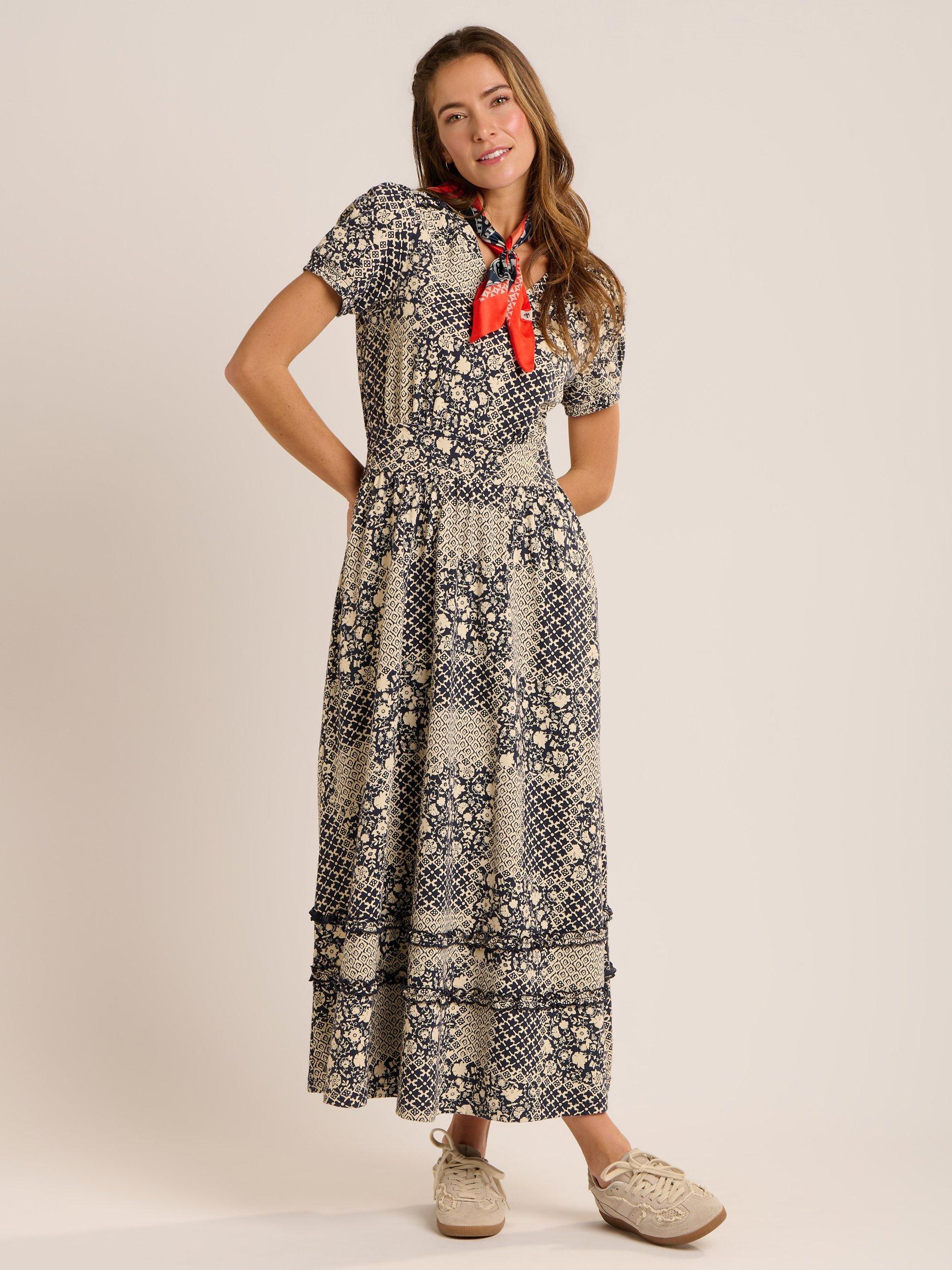 The stunning Katerina slub jersey 'V' neck dress is back again. This season in a beautiful patchwork print. It features a puffed sleeve with elasticated smocking cuff, deep waist band with elastication at the back and pretty ruffles in the shoulder and skirt. It looks great with Sandals in the sun or trainers for a cooler day.>[?