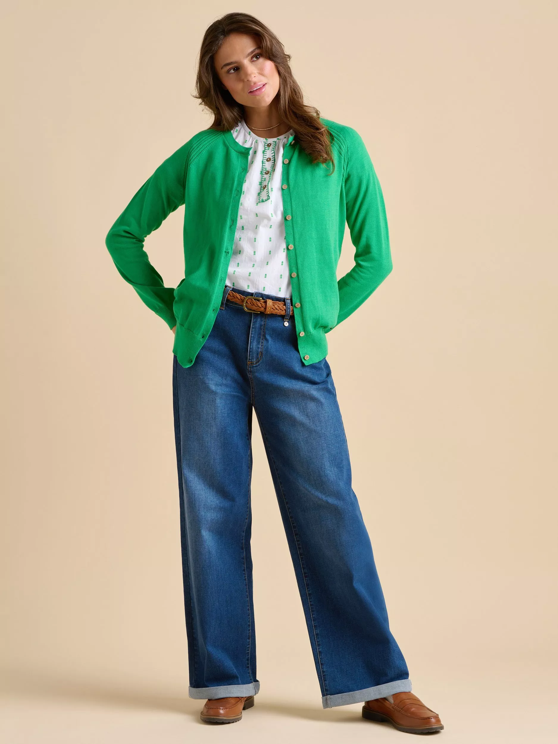 This cardigan brings a burst of colour with its lightweight, breathable knit - perfect for layering. The fitted waist creates a flattering silhouette while the wooden buttons hint at a nature feel. Pair with a white tiered skirt and green hair accessories.
