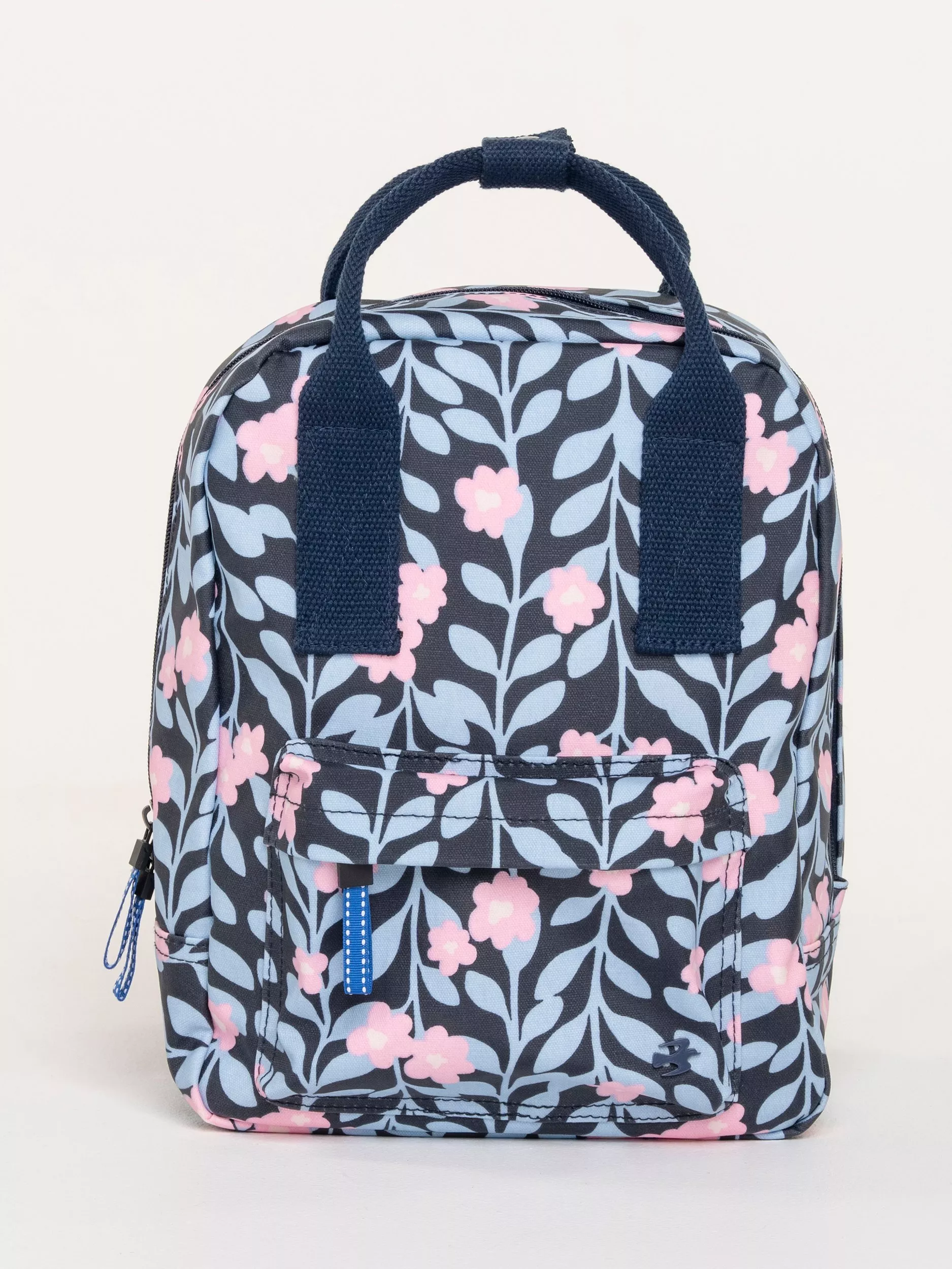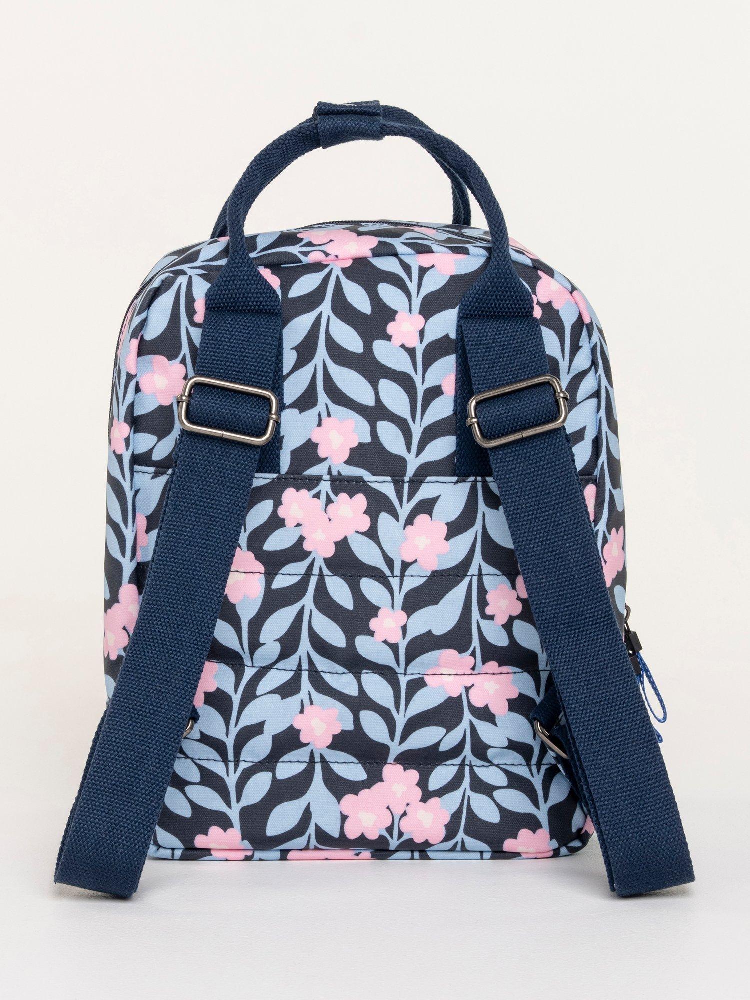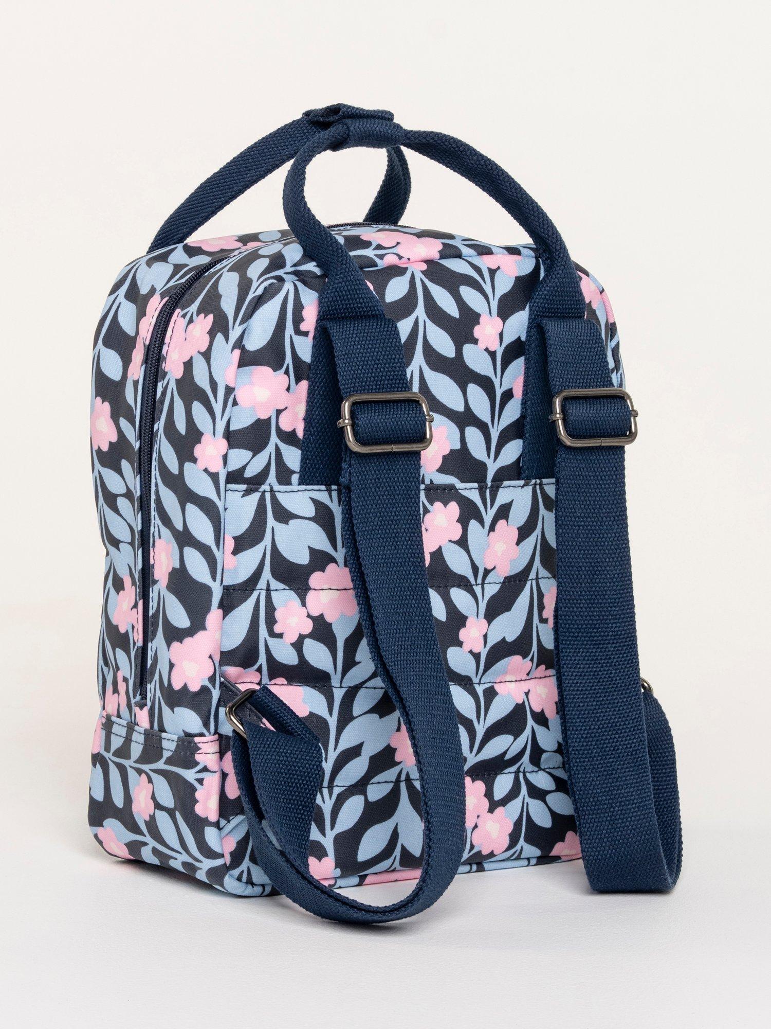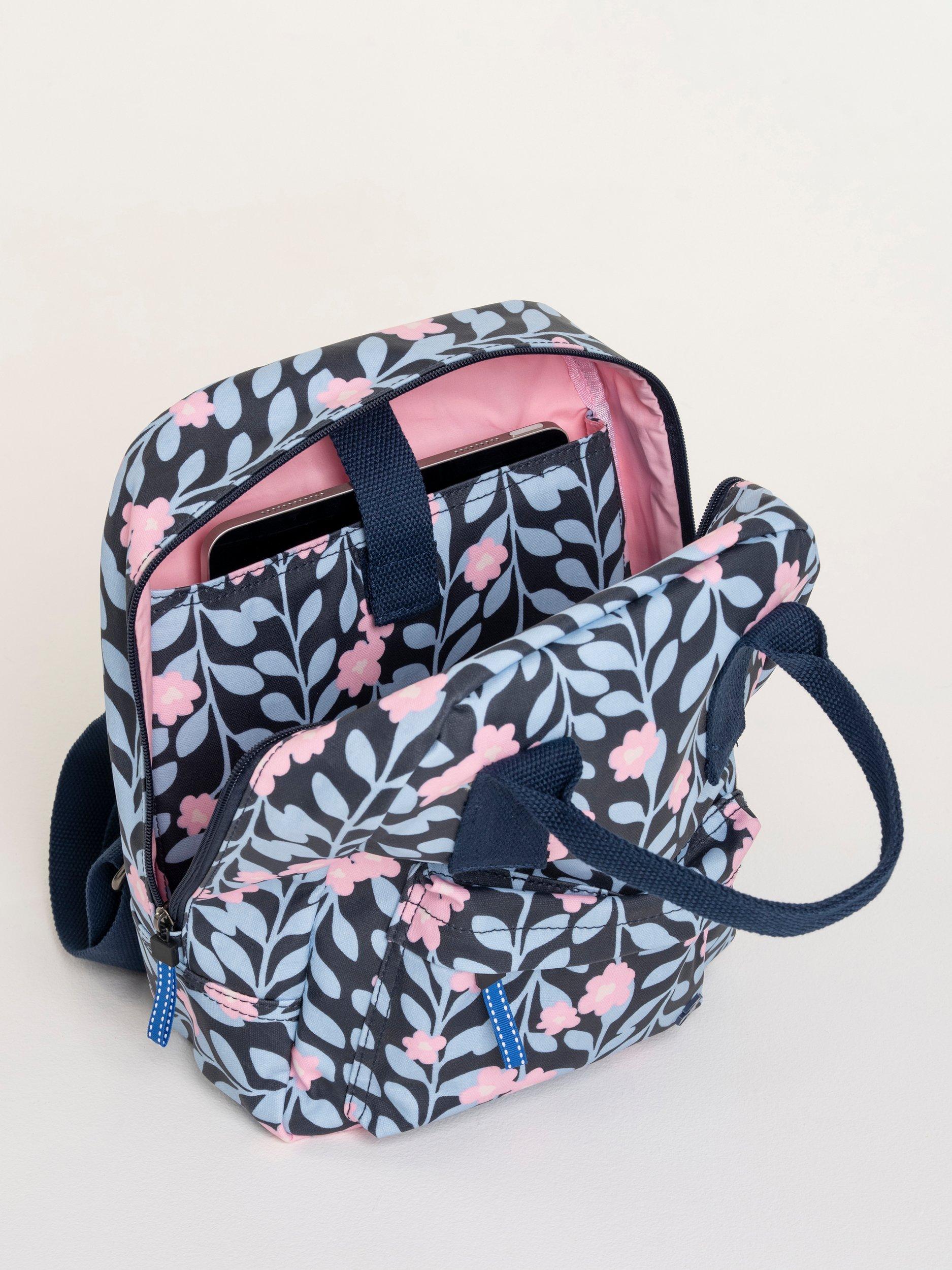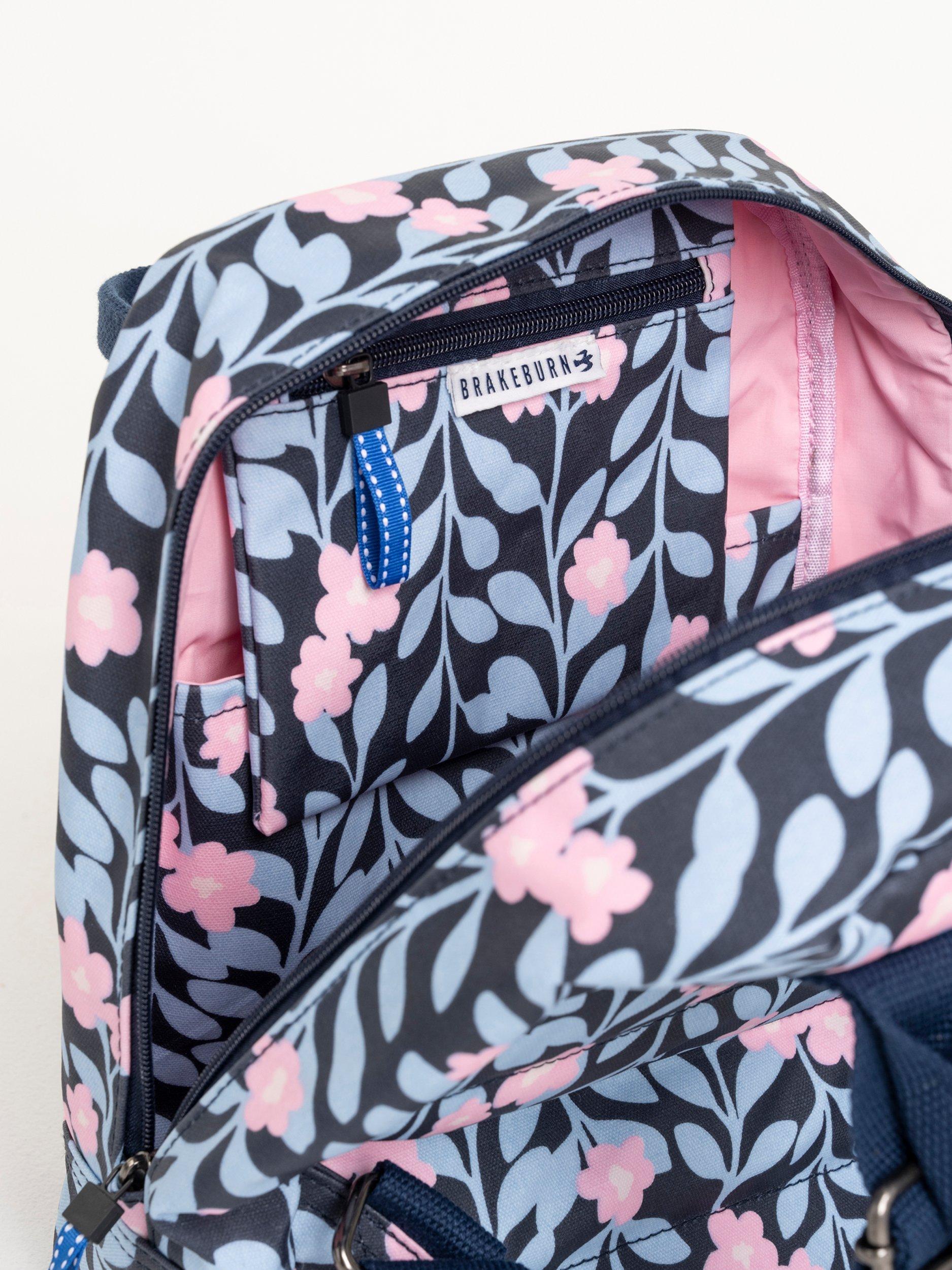 A backpack made from heavyweight coated cotton canvas in an in-house designed "midnight vine print", combined with coloured hardware and a textured adjustable strap. The Midnight vine backpack is the perfect bag and size for everyday use. It has an external front zip pocket, a hidden back pocket for your valuable items, and internally it has a padded small laptop/tablet sleeve, slip pocket and zip pocket. Finished with an anti-brass metal "Brakeburn branded bird" and zip pulls.