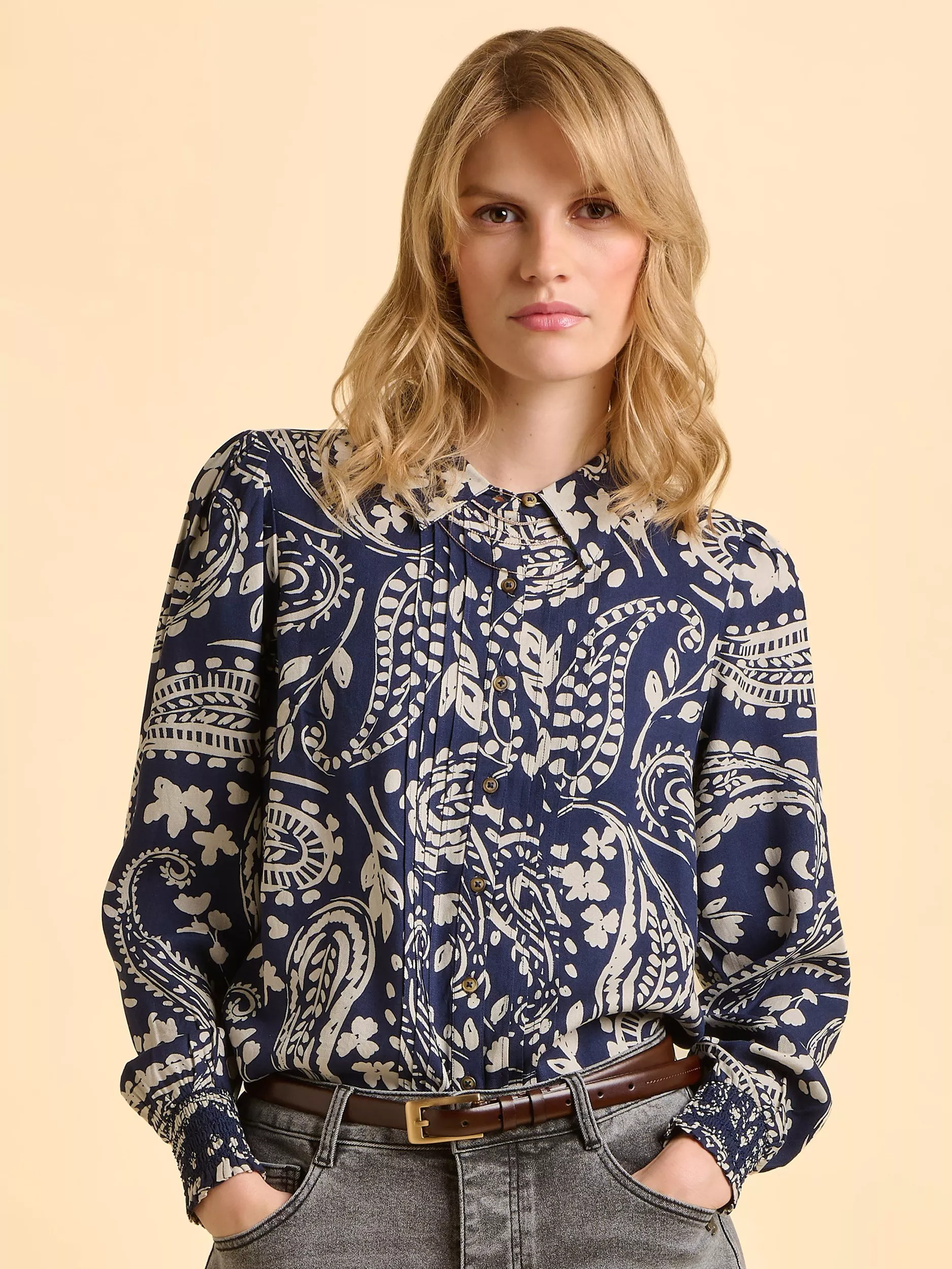 The Patti Blouse makes a statement with its large navy and cream paisley print. Featuring ruched cuffs with delicate frill edging, a classic shirt collar, and pleated panels down the front. Pair with timeless denim to let the blouse take centre stage.