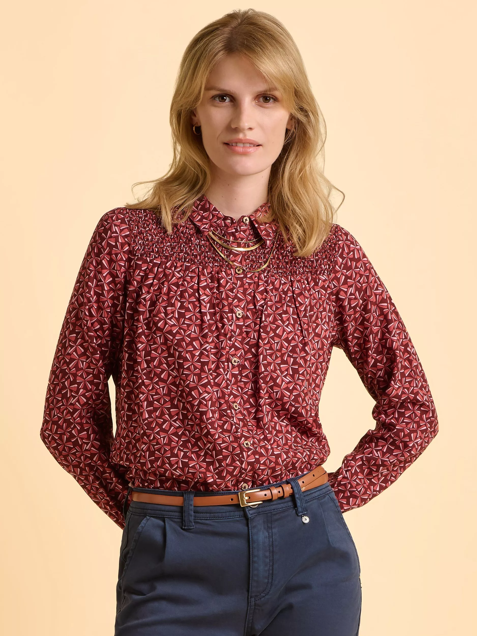 Make a statement in the Sabine Blouse. Featuring a bold geometric print in pink and burgundy tones, ruched shoulders, gathered cuffs, and light wood buttons, this lightweight piece is a standout choice. Tuck into a midi skirt and pair with boots for a smart day-to-night look.