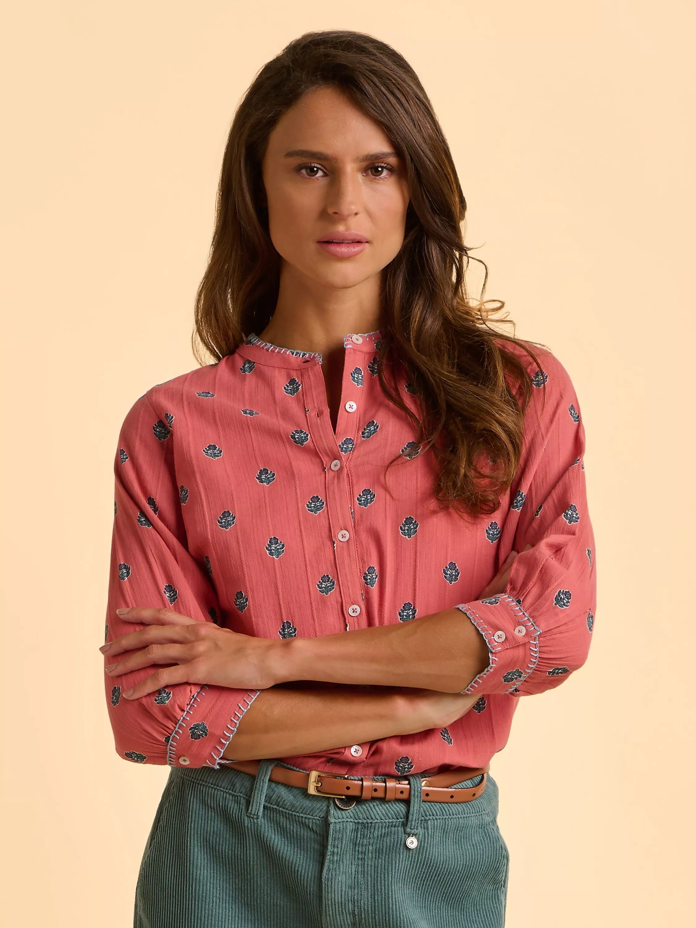 The Sara Blouse is light, bright, and full of charm. Made from 100% cotton with a textured floral print, it features gathered ¾ sleeves with contrast overlock stitching and double button cuffs. Finished with pearlescent buttons, subtle darts and side slits - it pairs perfectly with your favourite light denim.