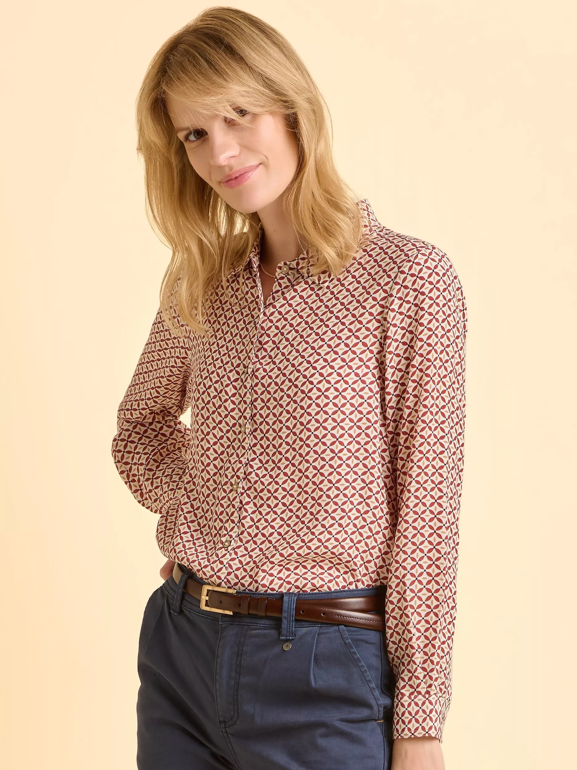 The Simone Blouse fuses relaxed florals with a clean silhouette. Featuring long button‑cuffed sleeves, lightweight fabric that encourages movements, and elegant broderie detailing, it’s a statement piece. Style with metallic heels or chunky boots, depending on the occasion.