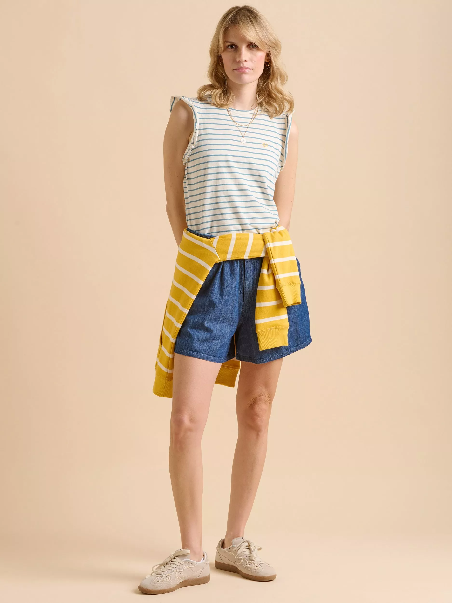 A classic stripe T shirt with sleeves that set it apart. Whether you're heading off for a hike or just running errands, this flutter-sleeve top elevates a simple outfit into something with a little extra wow. Pair with chinos and a cropped jacket.