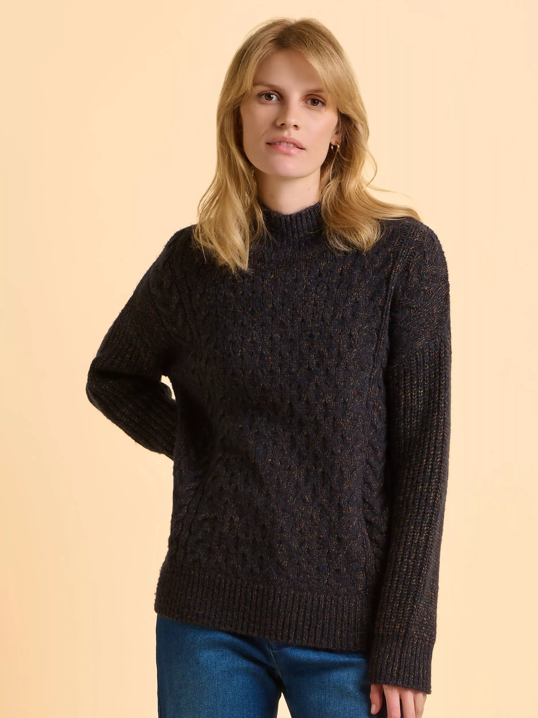 Meet your new winter-ready essential - a soft navy knit flecked with mustard yellow and sage green for a subtle hint of colour. Featuring a ribbed neckline, cuffs, and hem, this jumper wraps you in cosy comfort without the bulk, perfect for keeping the cold out on chilly days.