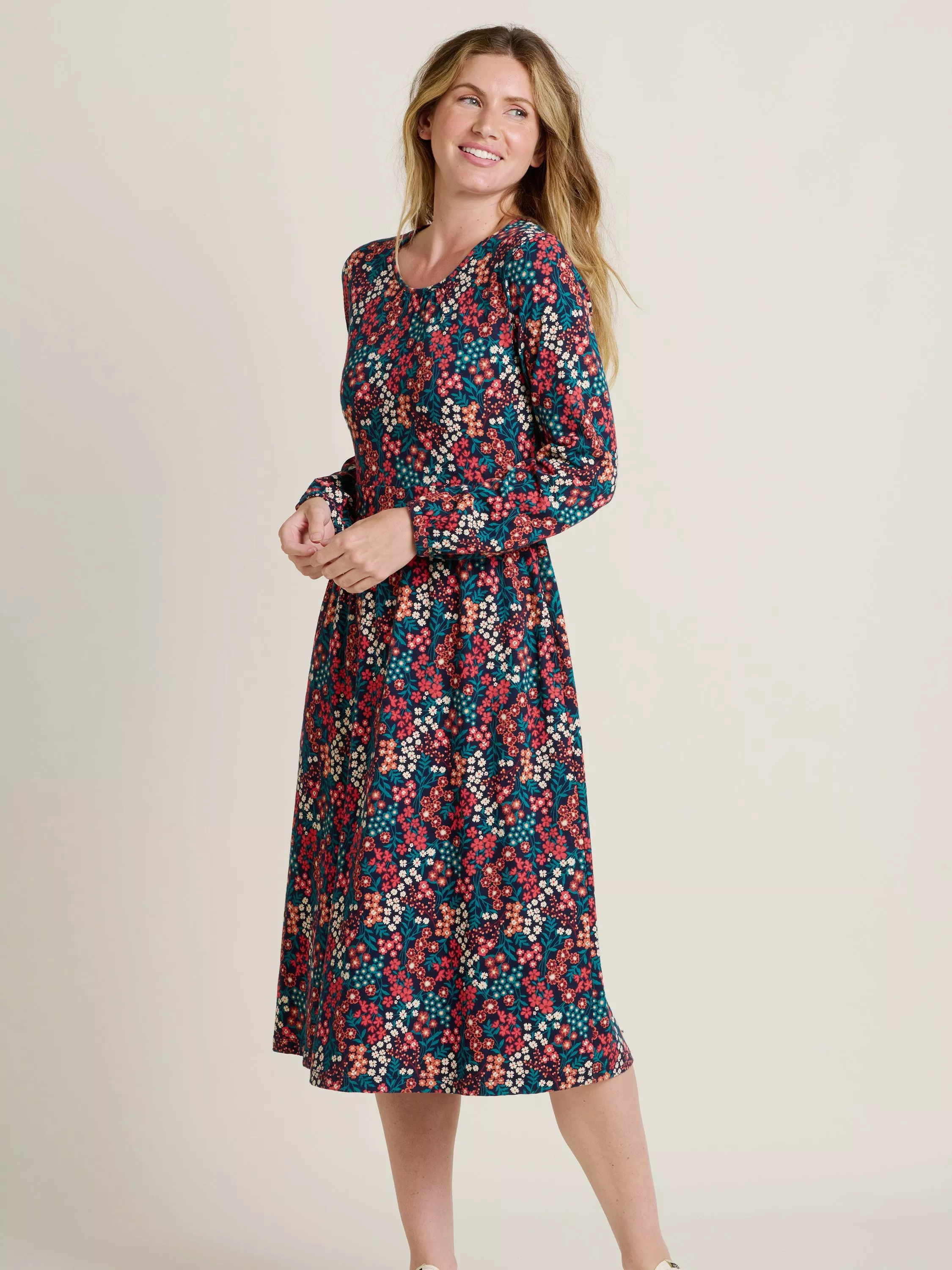 The Winter Ditsy Midi Dress delivers cheery florals in jewel-like tones. Its soft jersey fabric, full-length sleeves and shirring at the back fits and drapes the body with room for movement. This is a day dress for relaxed weekends moseying around artisan markets or having brunch with friends. Wear with a green button up cardi and your favourite boots.