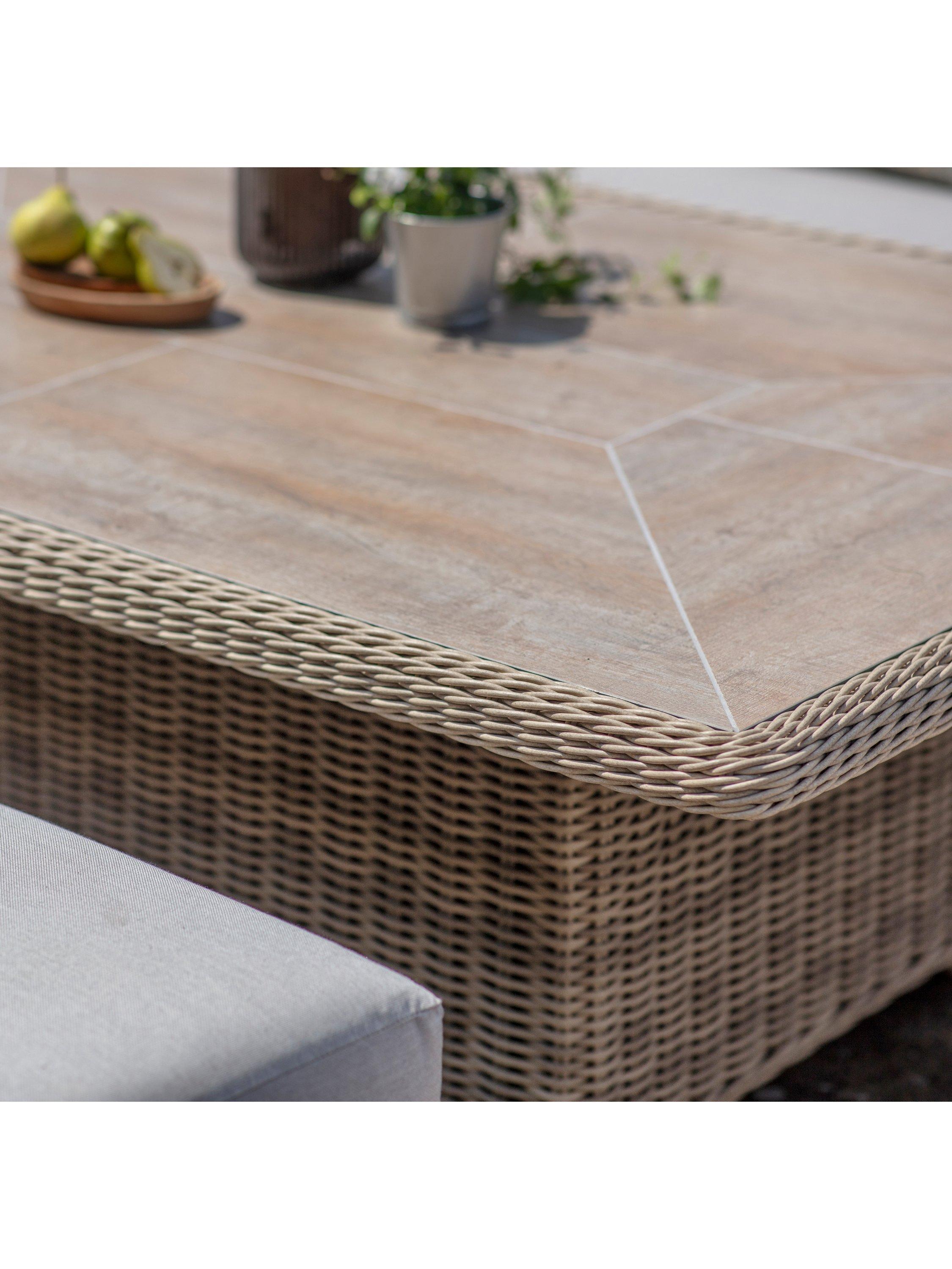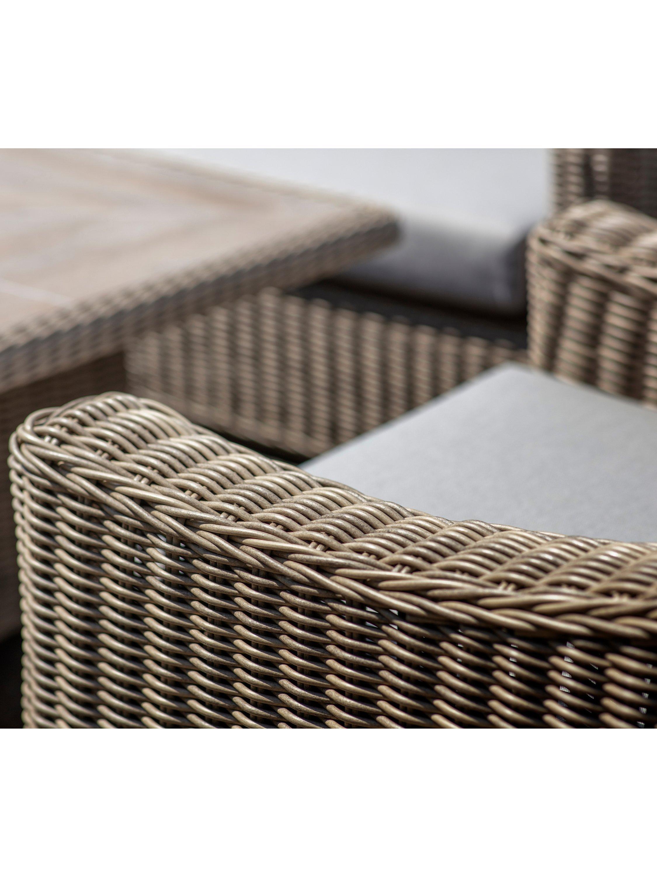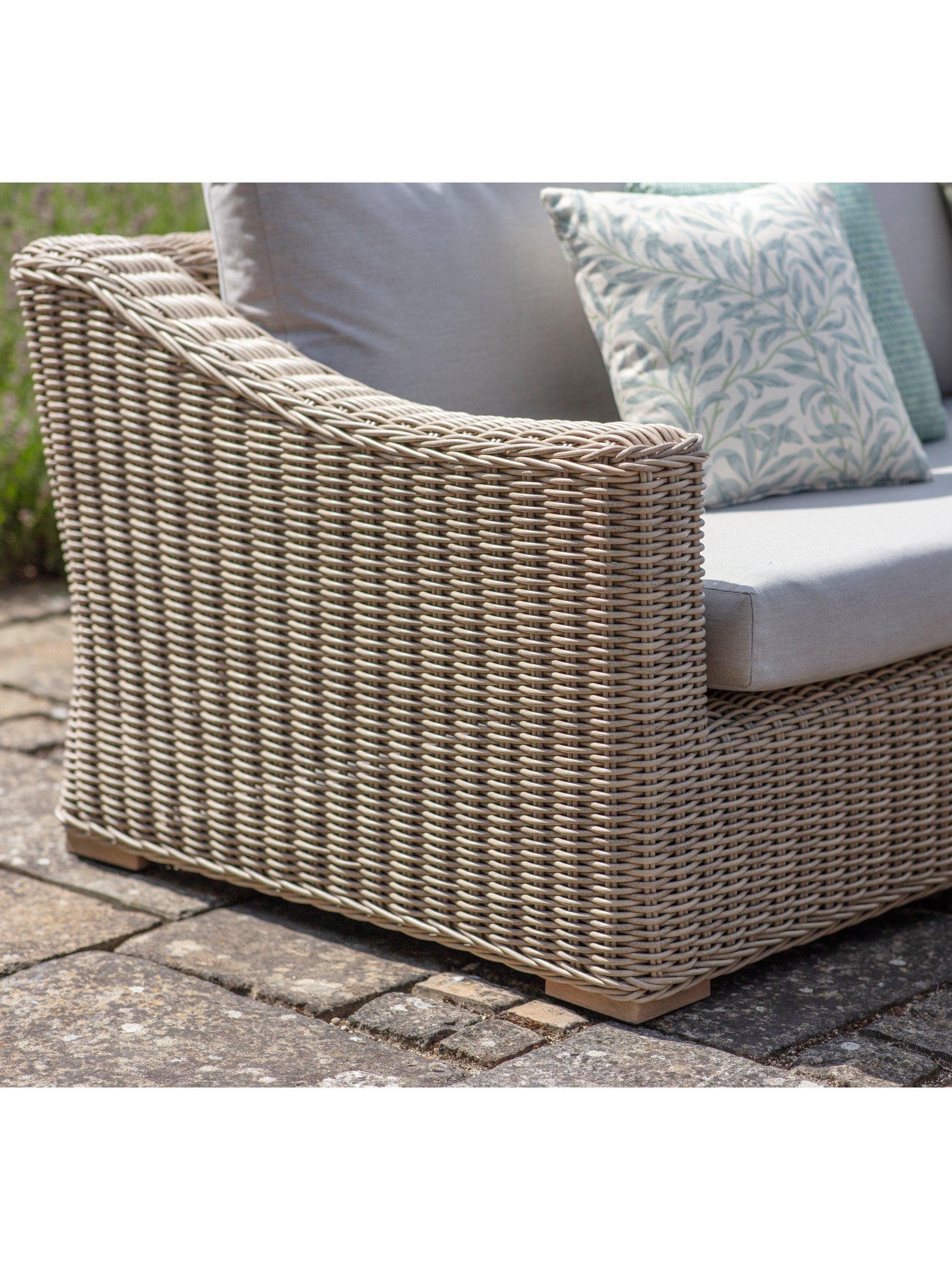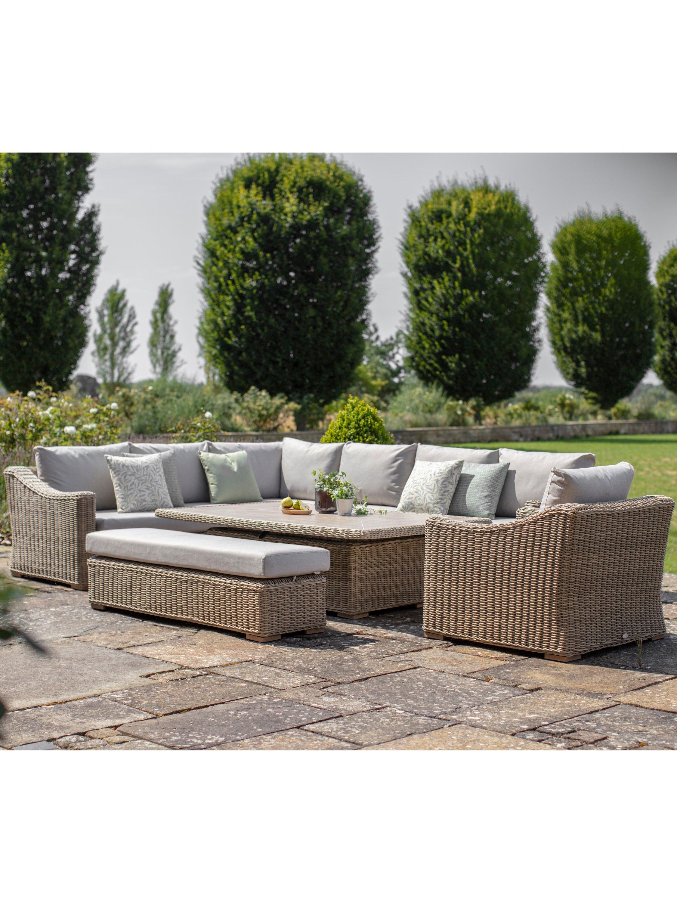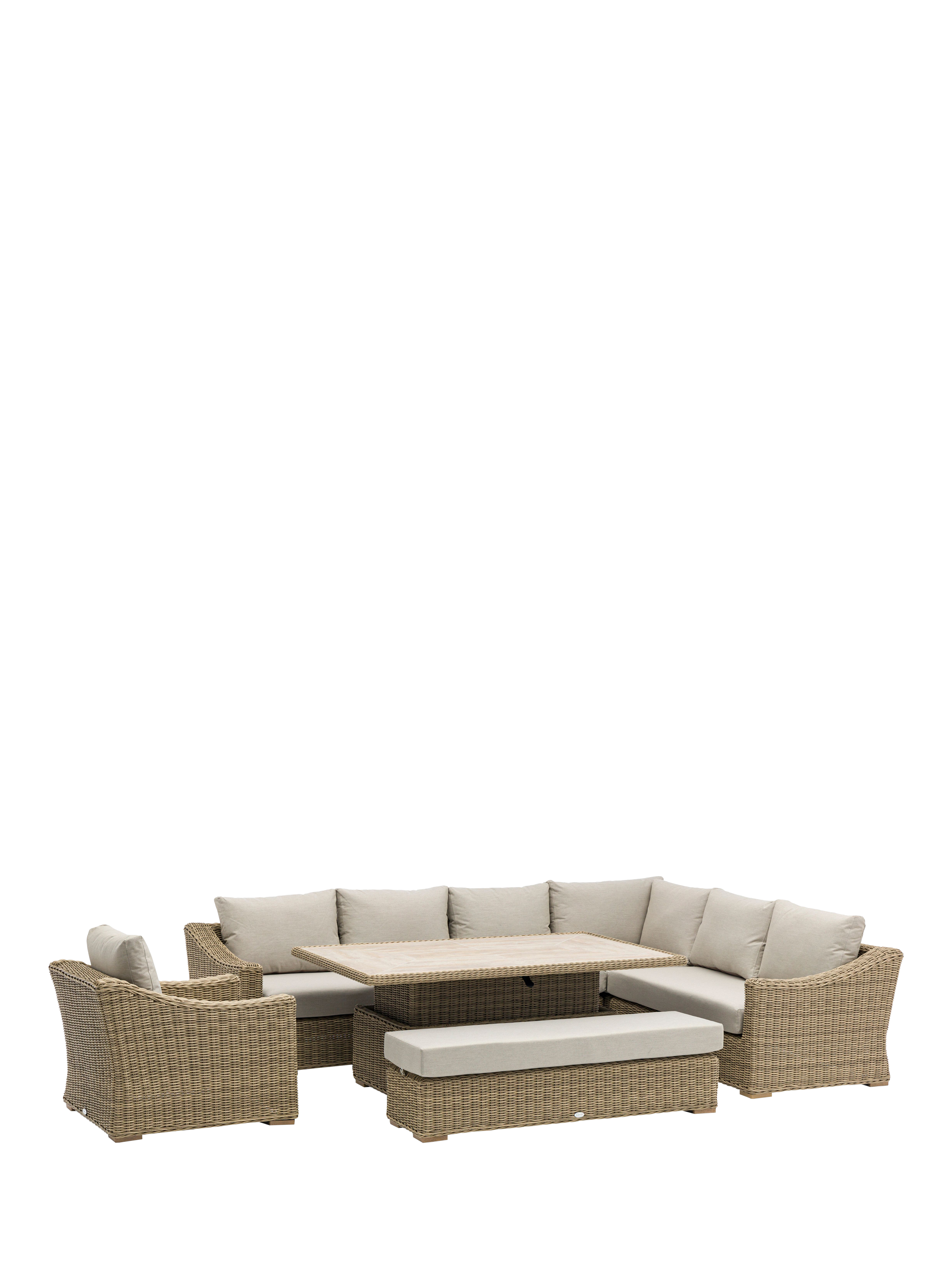Made from all-weather outdoor rattan, seating includes an L-shaped five-seater sofa, double bench and single armchair, all with season-proof cushions.