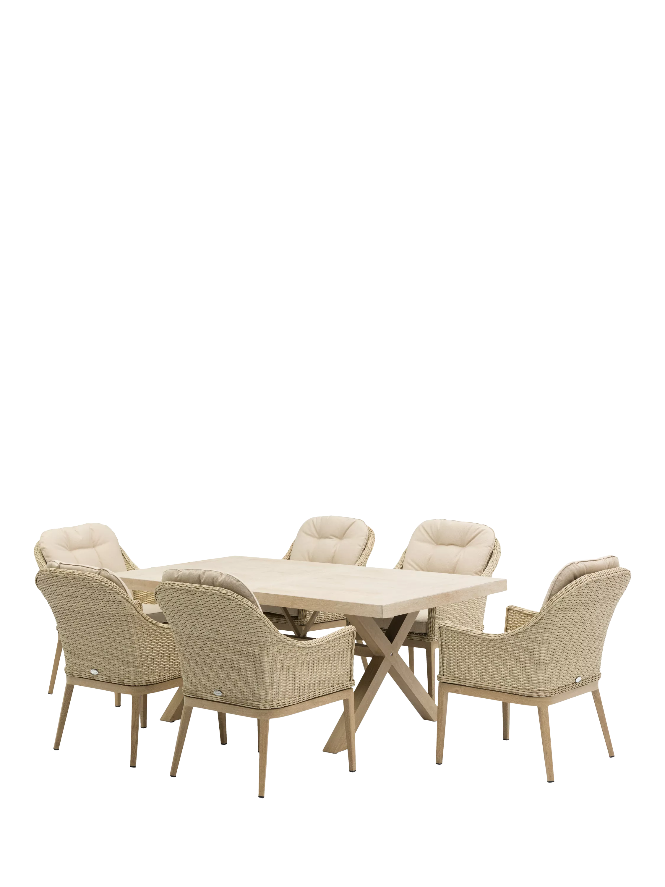 Six eye-catching dining chairs feature gently curved outdoor rattan seats on contrasting wood-effect aluminium legs. The refectory-style table has an easy-to-clean ceramic wood-effect top.