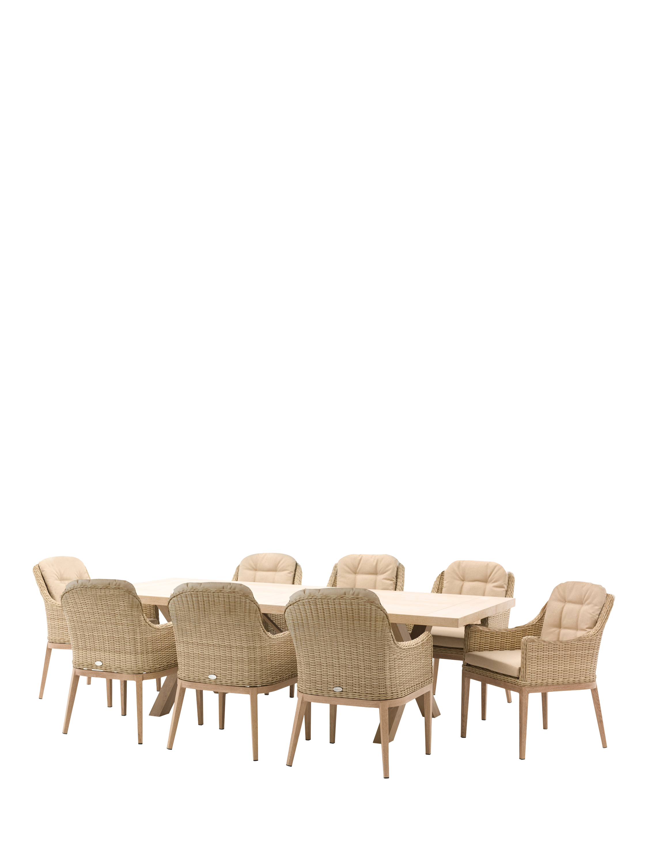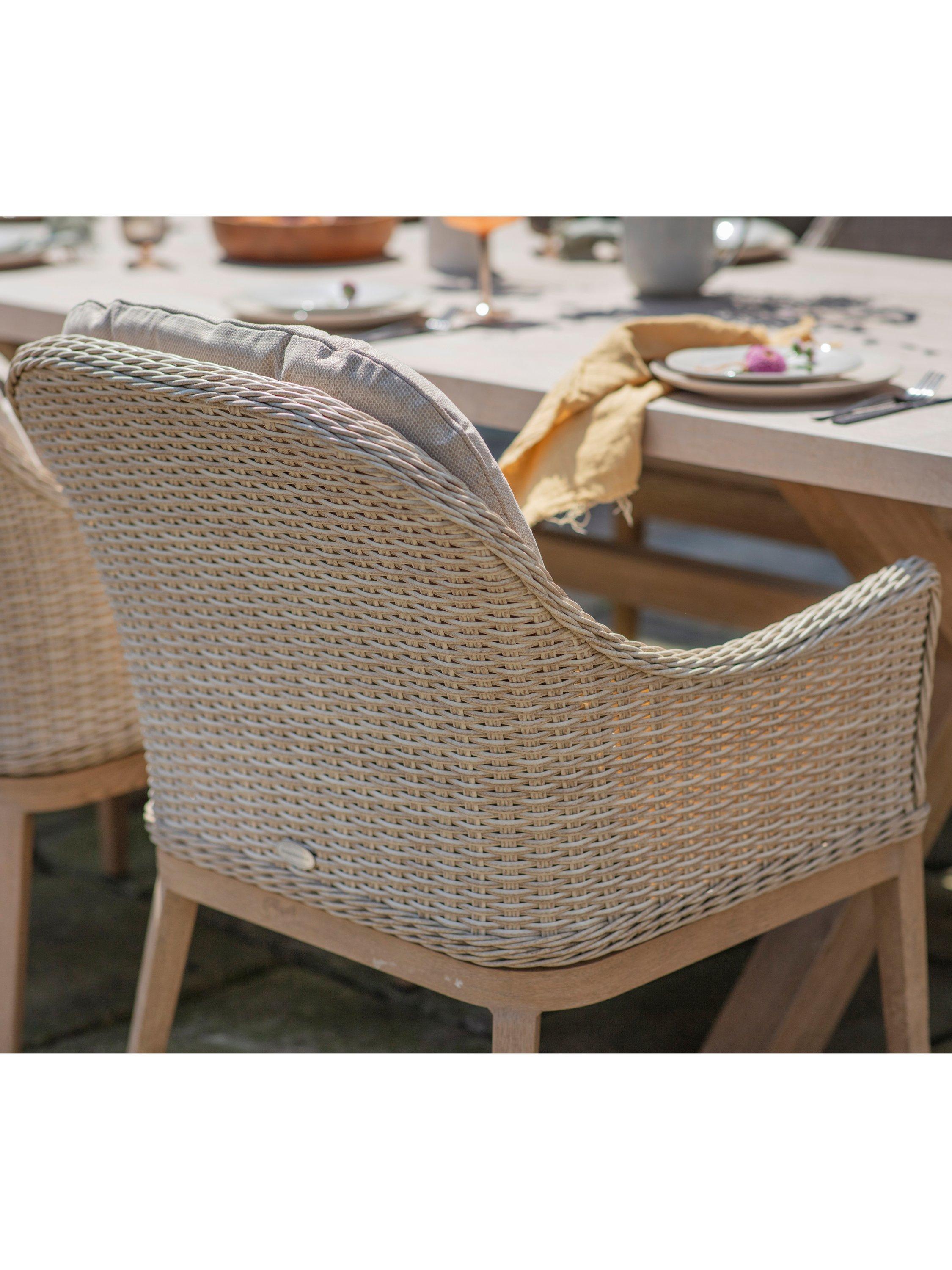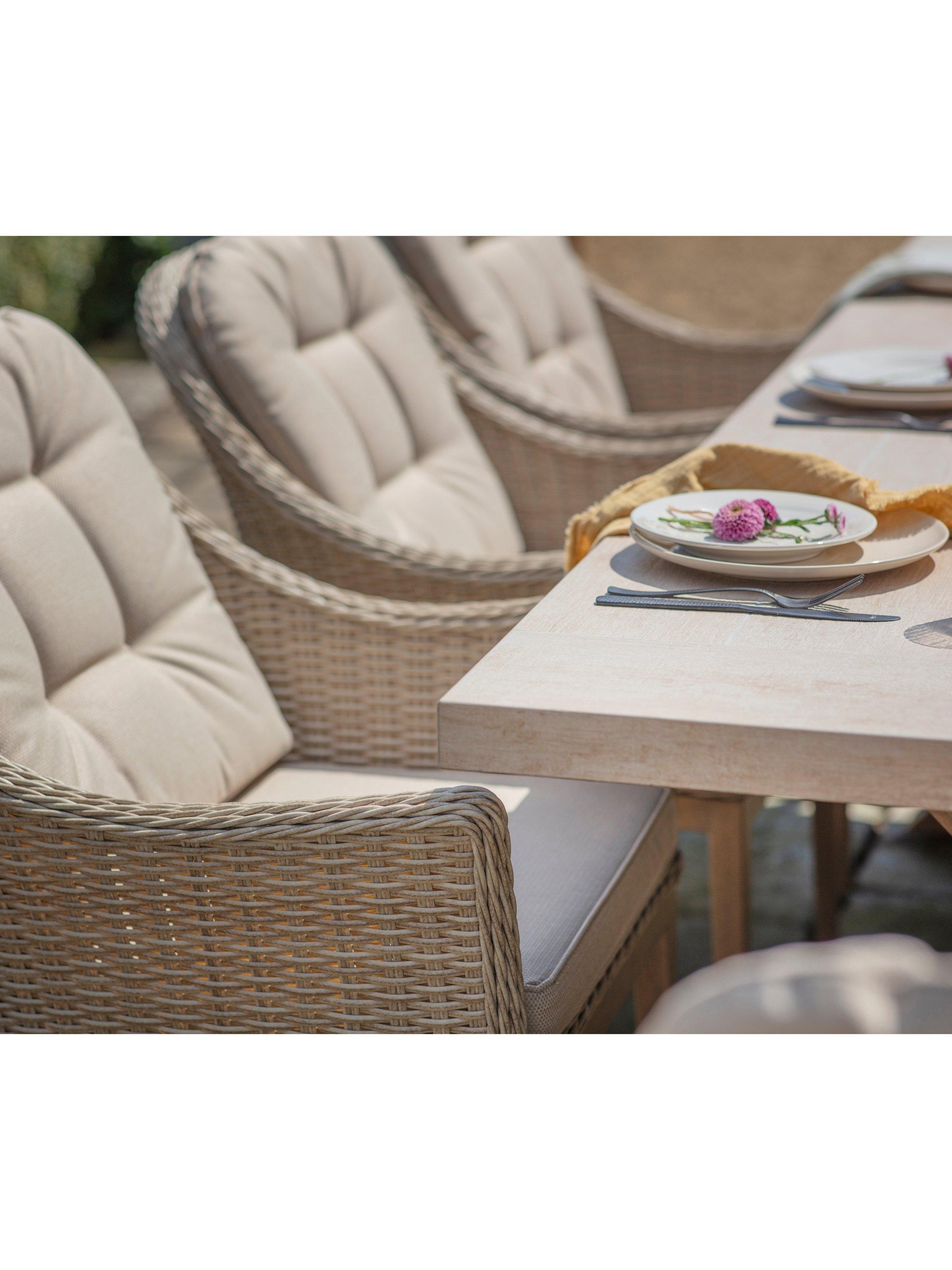Eight eye-catching dining chairs feature gently curved rattan seats on contrasting wood-effect aluminium legs. The refectory-style table has an easy-to-clean ceramic wood-effect top. Removable seat and back cushions are made using Bramblecrest's innovative Eco fabric and they retain the hard-wearing, season-proof quality that is synonymous with the brand's outdoor fabrics and are UV-resistant too.