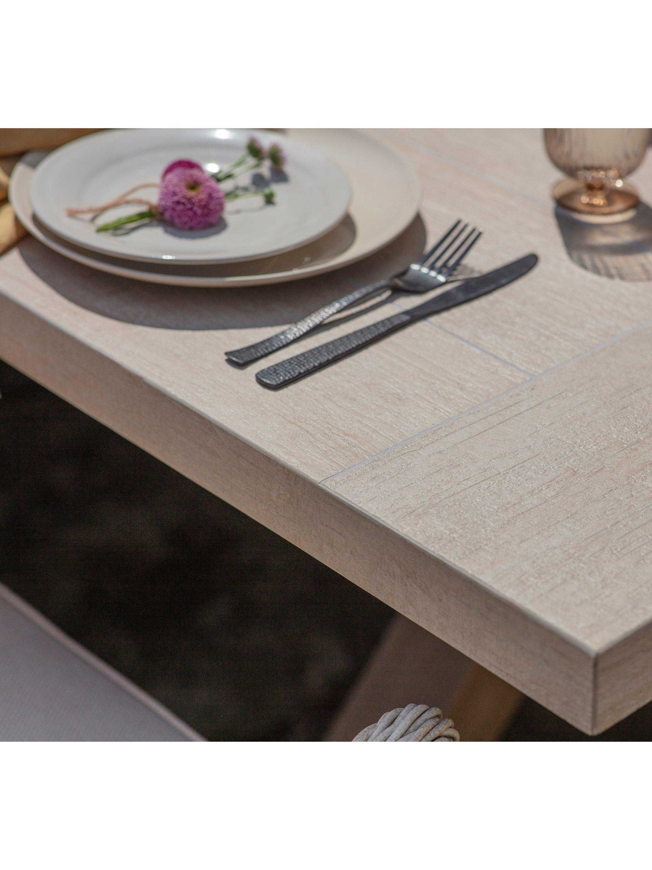 - Rectangular dining table with easy-clean ceramic wood-effect top and cross-frame base