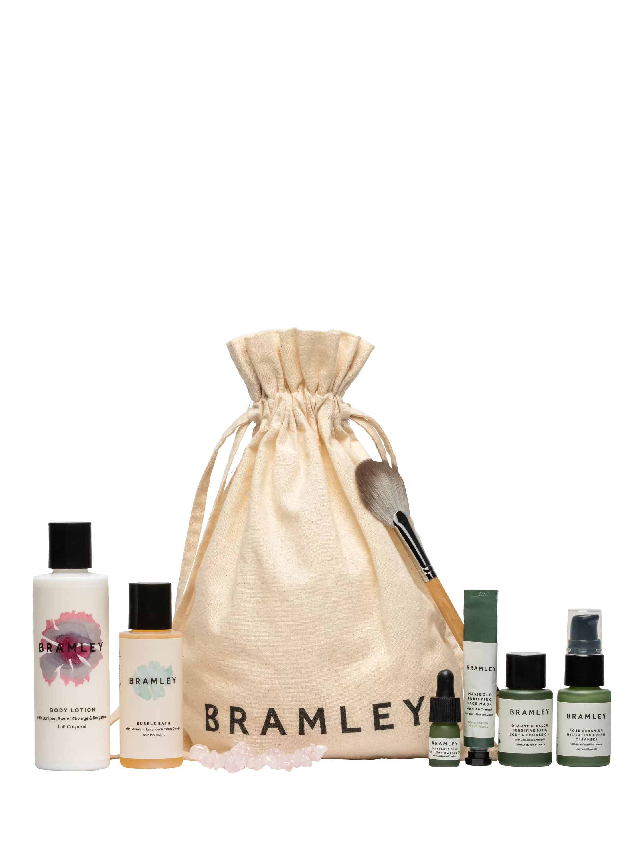 Your moment of calm, wherever you are. Bramley’s Spa in a Bag is filled with Bramley's most-loved essentials, including Rose Geranium Cream Cleanser & Marigold Purifying Face Mask, infused with soothing botanicals for a restorative escape — anytime, anywhere.