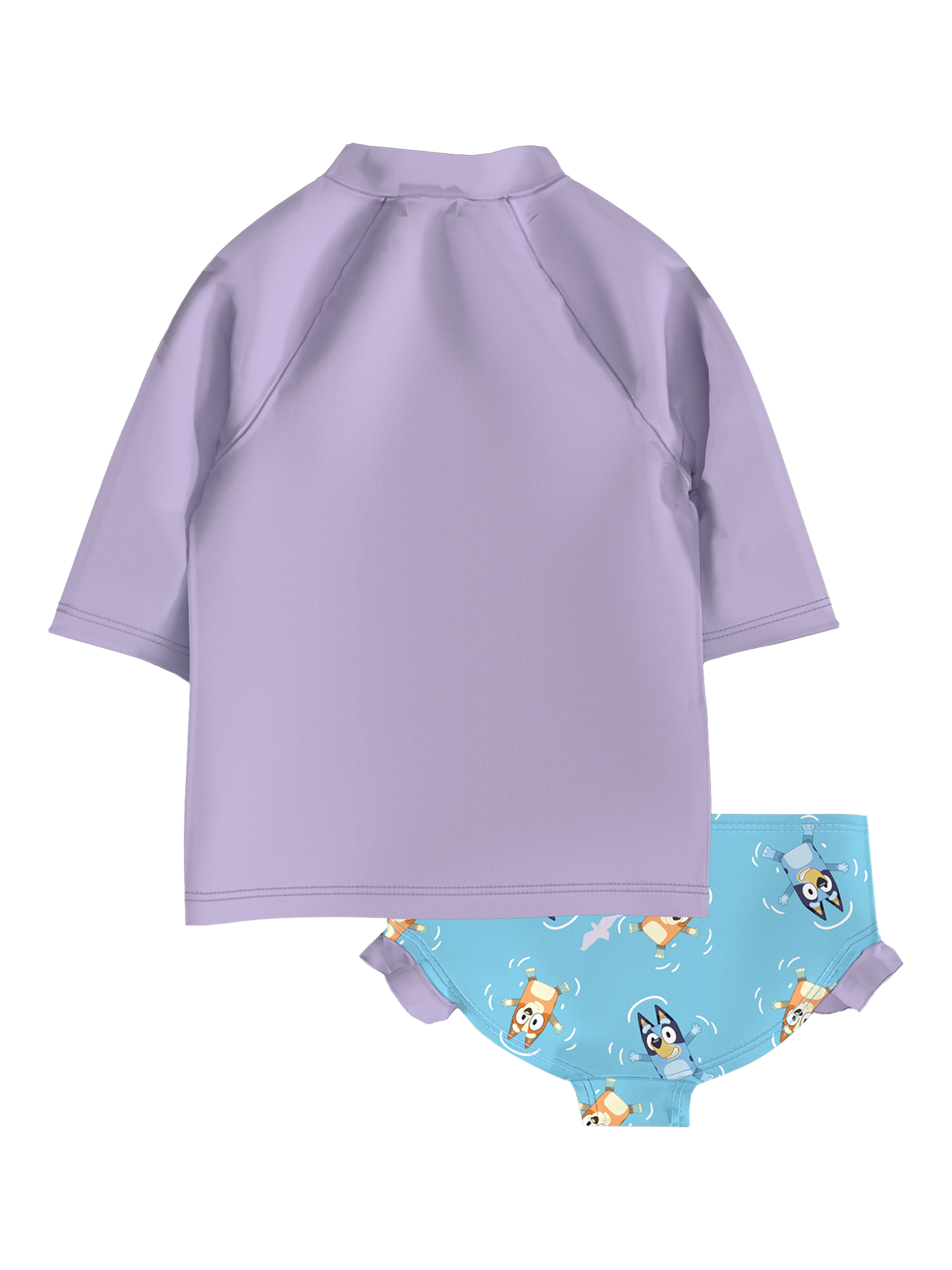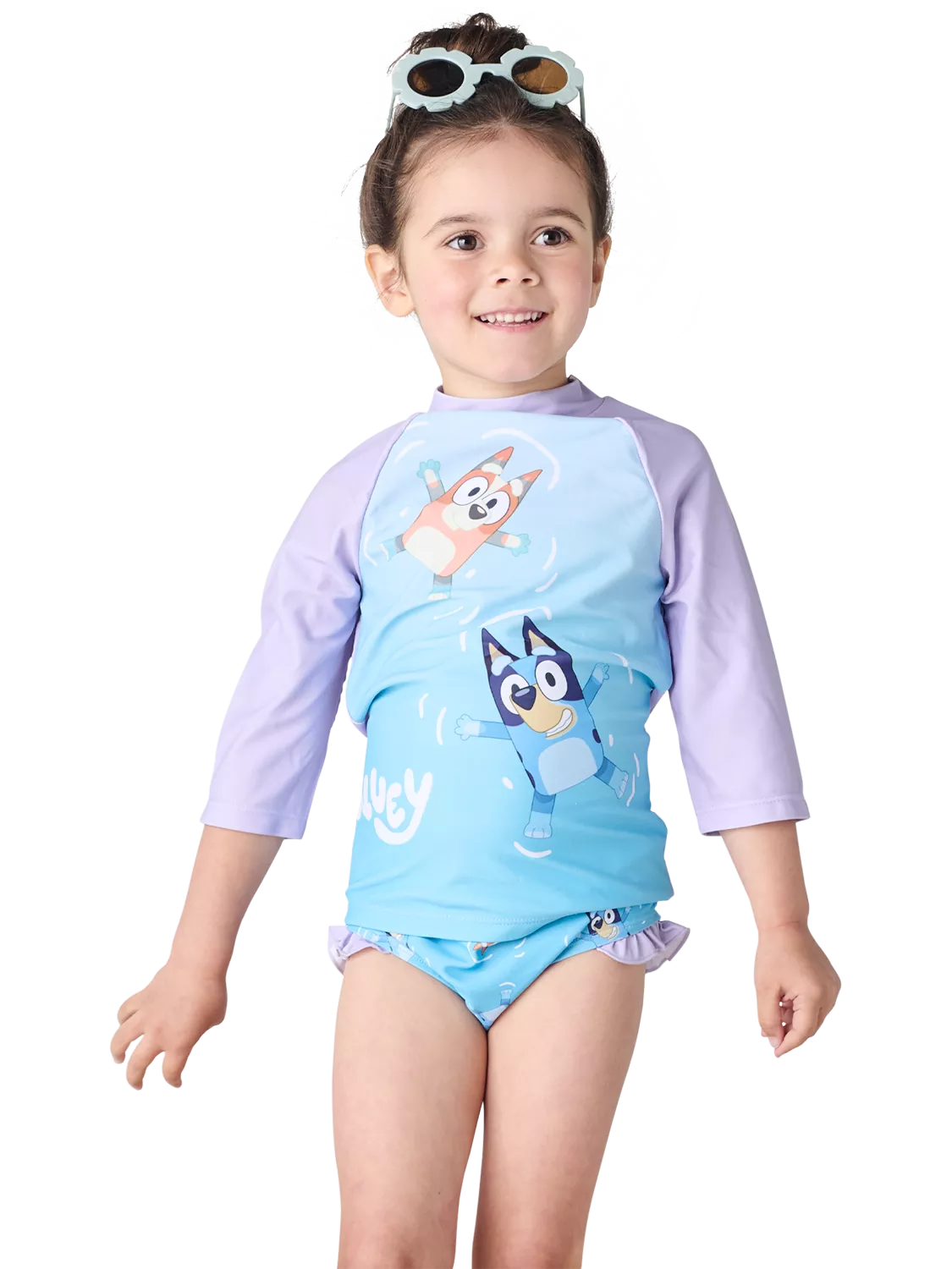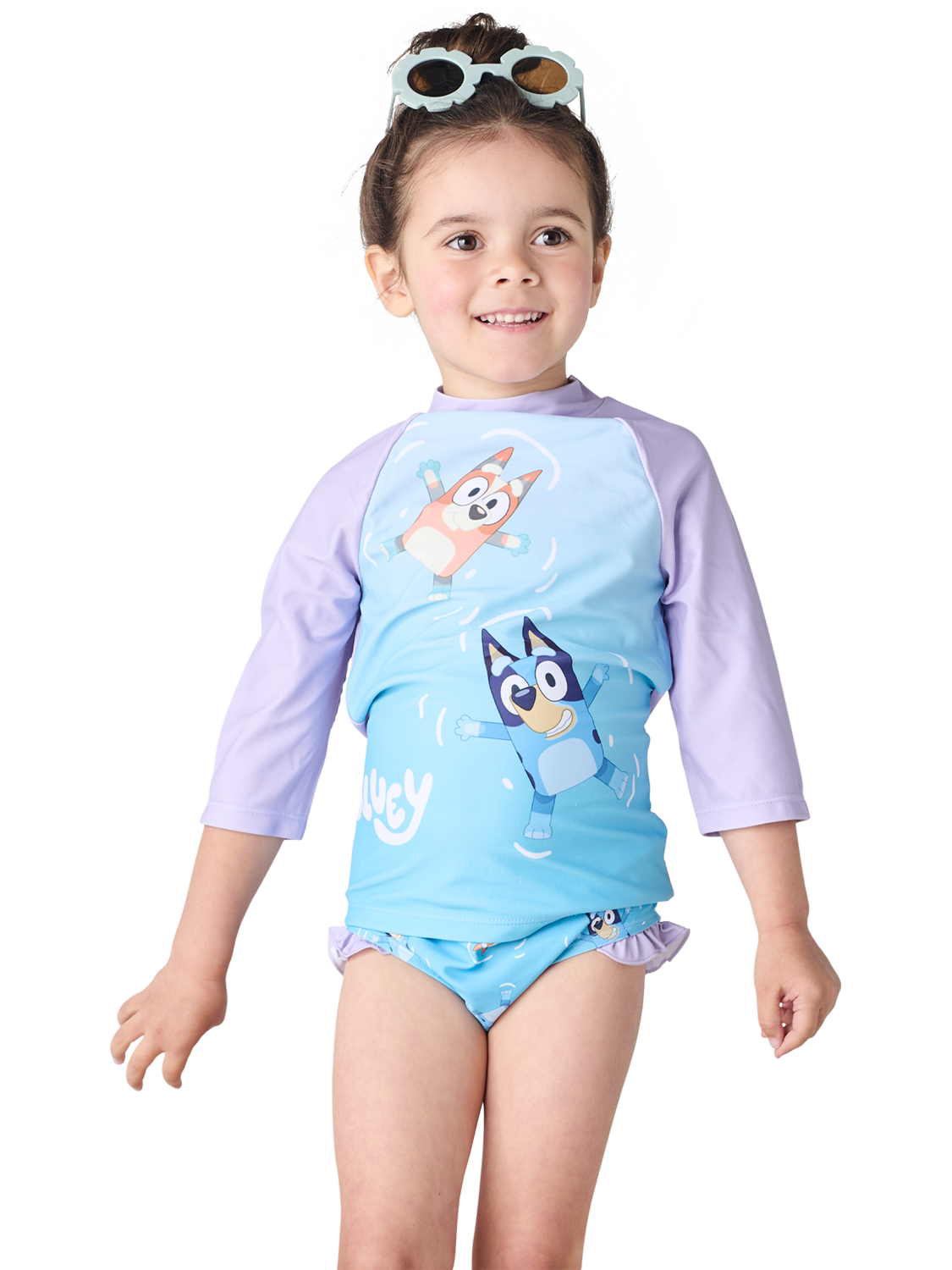 Make a splash with this Bluey swim set, featuring a playful Bluey and Bingo graphic on a comfortable, long-sleeve top with matching swim bottoms.