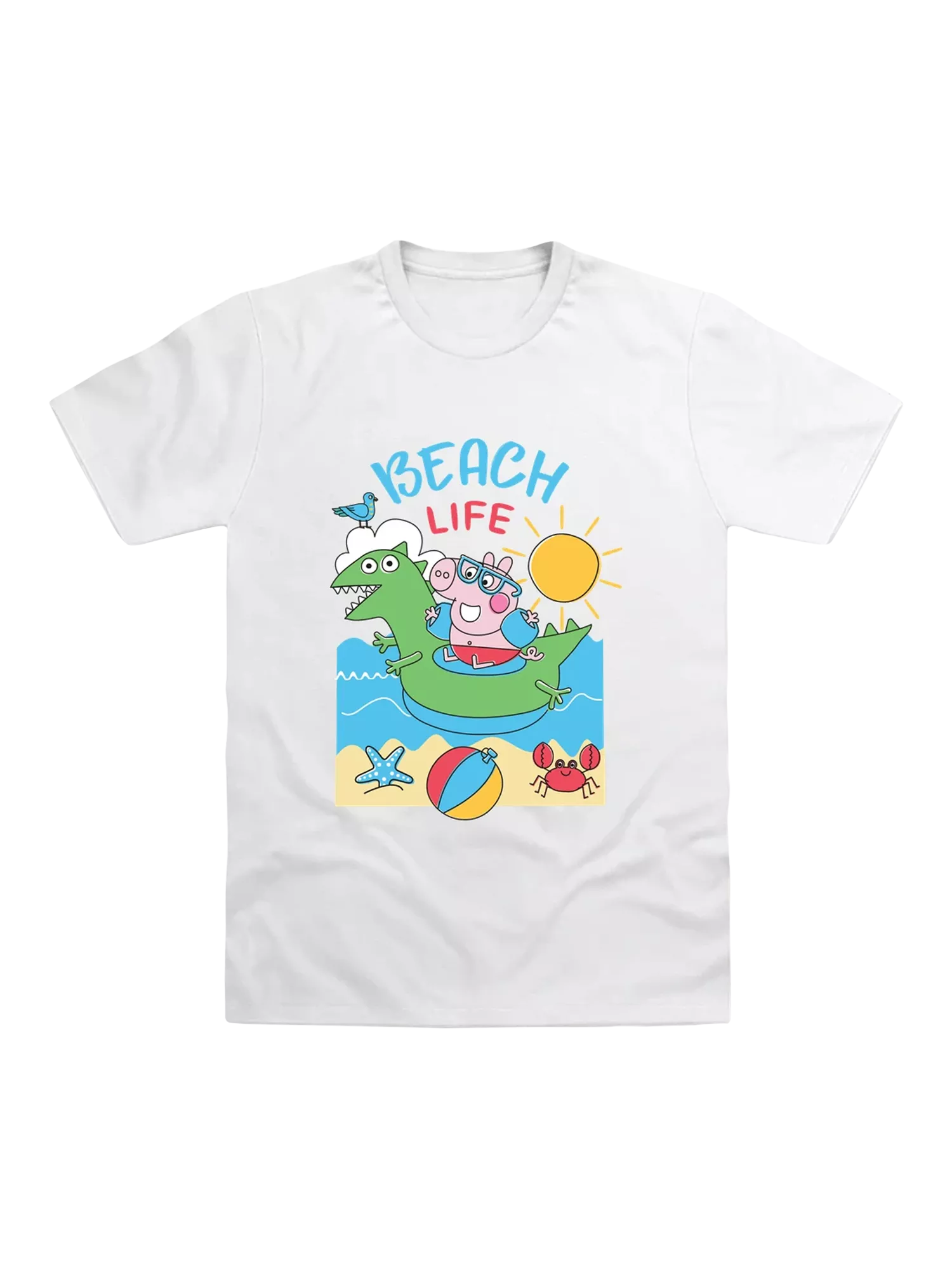 Bring the sunshine wherever you go with this fun Peppa Pig “Beach Life” t-shirt featuring George riding a dinosaur float in a bright beach scene. With playful artwork, cheerful colours, and comfy cotton fabric, it’s perfect for summer days and seaside adventures. A must-have for little ones who love Peppa Pig and the great outdoors!