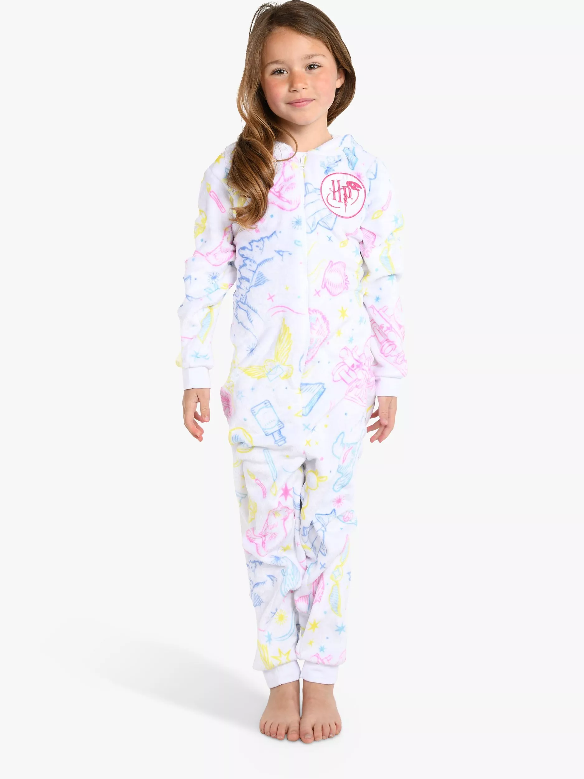 This onesie is a magical option for your little witch or wizard! This piece features a vibrant multicoloured all-over Harry Potter-themed print. The iconic Harry Potter badge is enchanted with pink glitter and a magical star to the hood! Perfect for getting comfy at the end of a long day of learning spells.