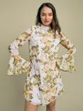 High Neck Fluted Cuff Sleeve Peony Print Mini Dress, Multi