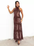 Linear Sequin Embellished Chiffon Maxi Dress, Chocolate