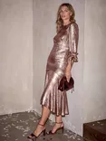 Mint Velvet Metallic Puff Shoulder Ruffle Bow Cuffs Midi Dress, Pink/Multi, Pink/Multi