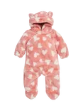 Baby Faux Fur Hooded Heart Print Pramsuit, Peach