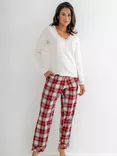 Rib Jersey Lace Trim Henley Top & Check Trousers Pyjama Set, Red/Cream