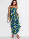 Strapless Shirred Bodice Maxi Beach Dress, Blue Tropical