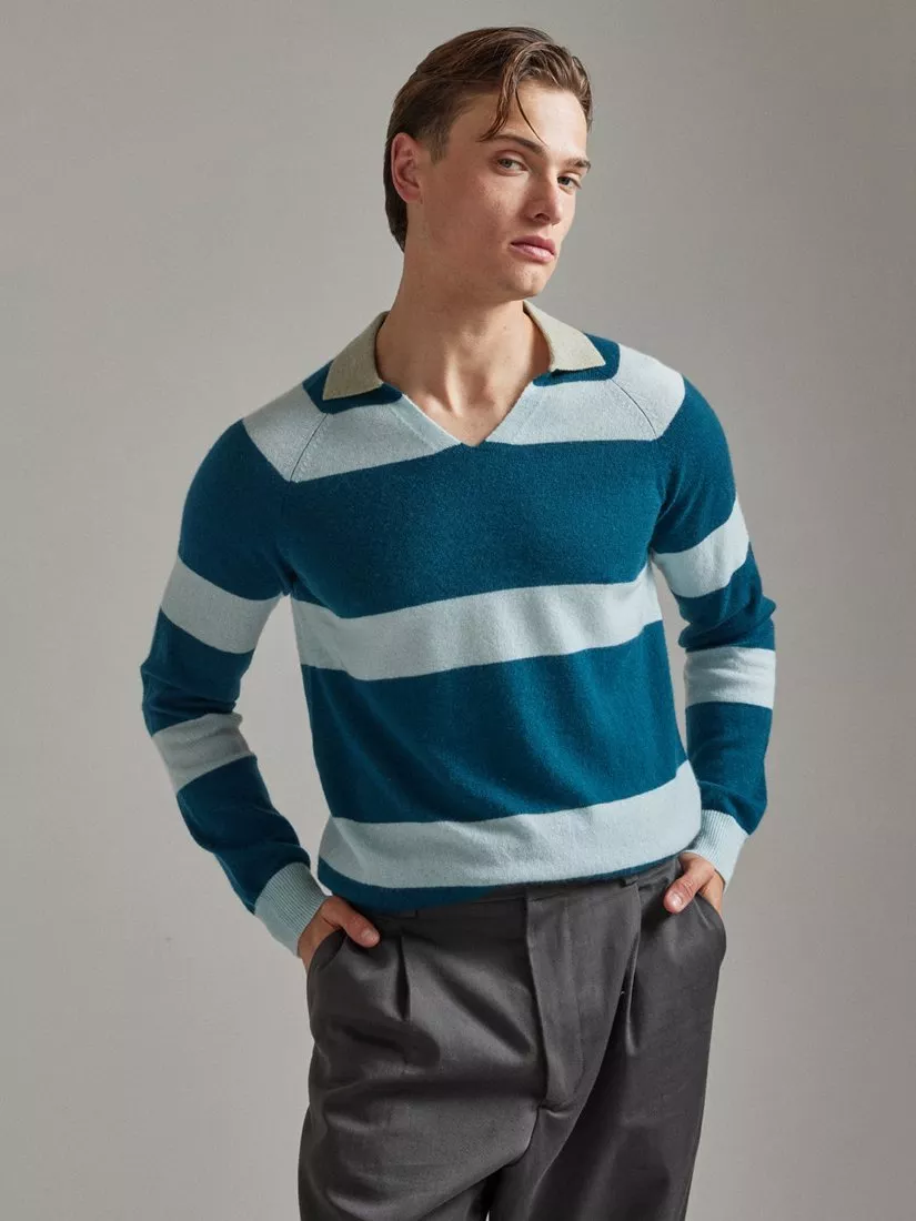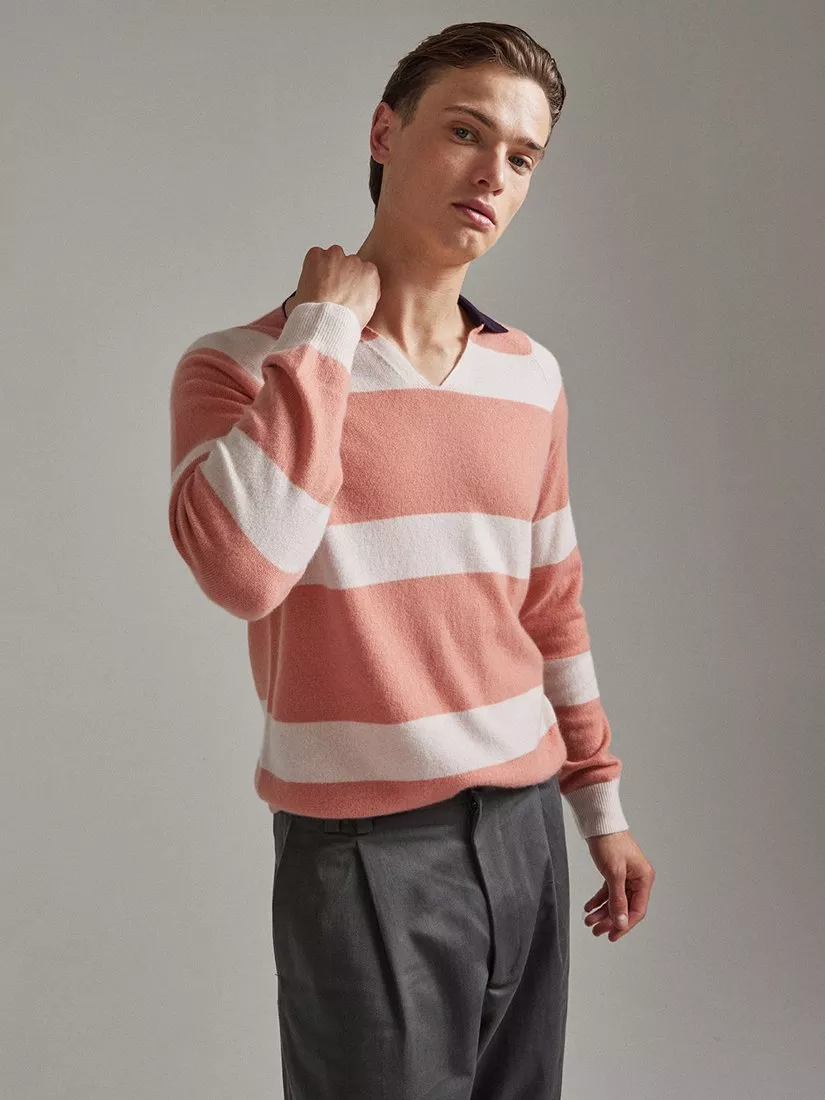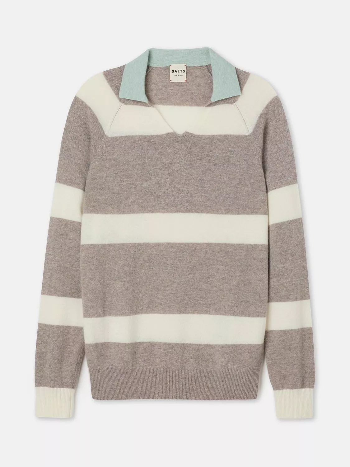 SALTSUnisex Split Neck Stripe Pure Cashmere Polo Jumper£215.00Sobert & Pale Pink is availableAqua & Peppermint is availableOatmeal & Soft White is available+ More colours available