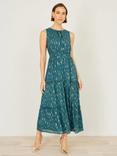 Foil Print Ruched Waist Midi Dress, Teal/Gold