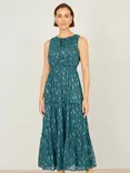 Foil Print Ruched Waist Midi Dress, Teal/Gold