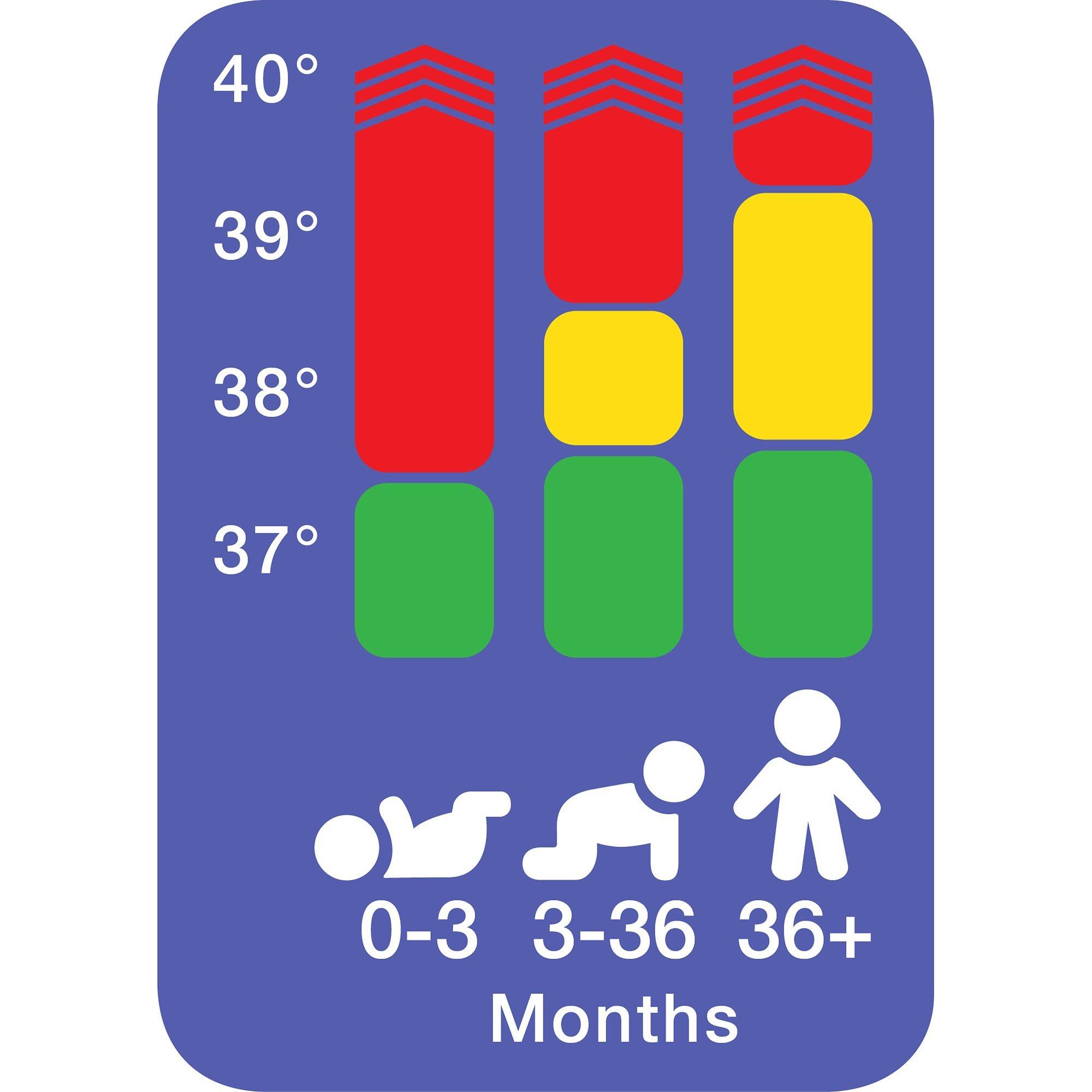 This thermometer from Braun helps to interpret the temperature for all ages and eliminate the guess work from the temperature reading. You can easily set the age with the ‘Age Precision’ button: 0-3 months, 3-36 months, 36 months -adult. Take the measurement and interpret the reading with the help of the colour coded display. Once the reading, a fast 8 seconds, has been completed, the thermometer will beep once to let you know it’s finished. If your little one has a fever, an alarm of ten beeps will go off to alert you. The memory recalls the last temperature reading.