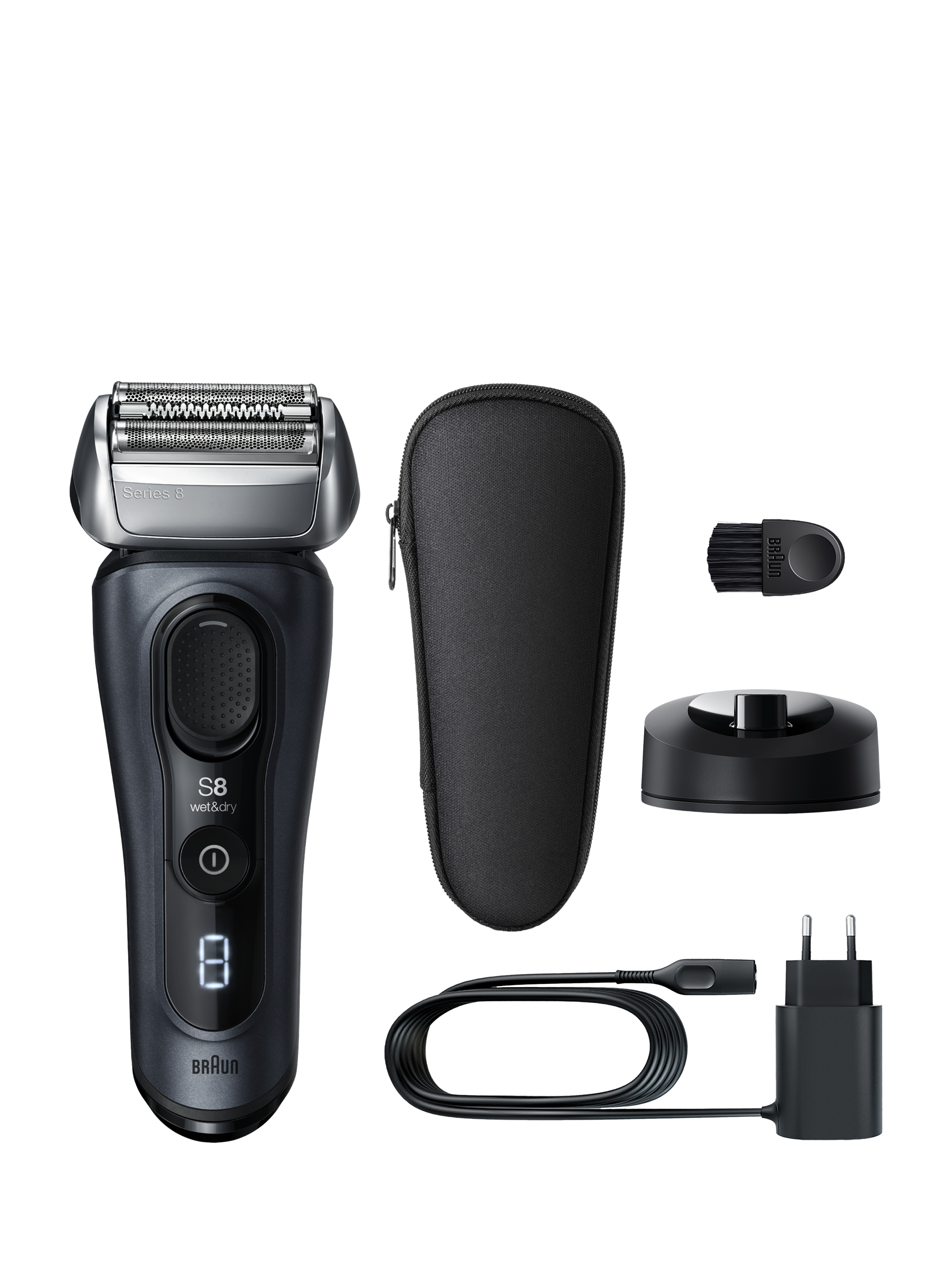 - 1x Electric shaver 1x Charging stand 1x Travel case 1x Charging cable 1x Cleaning brush
