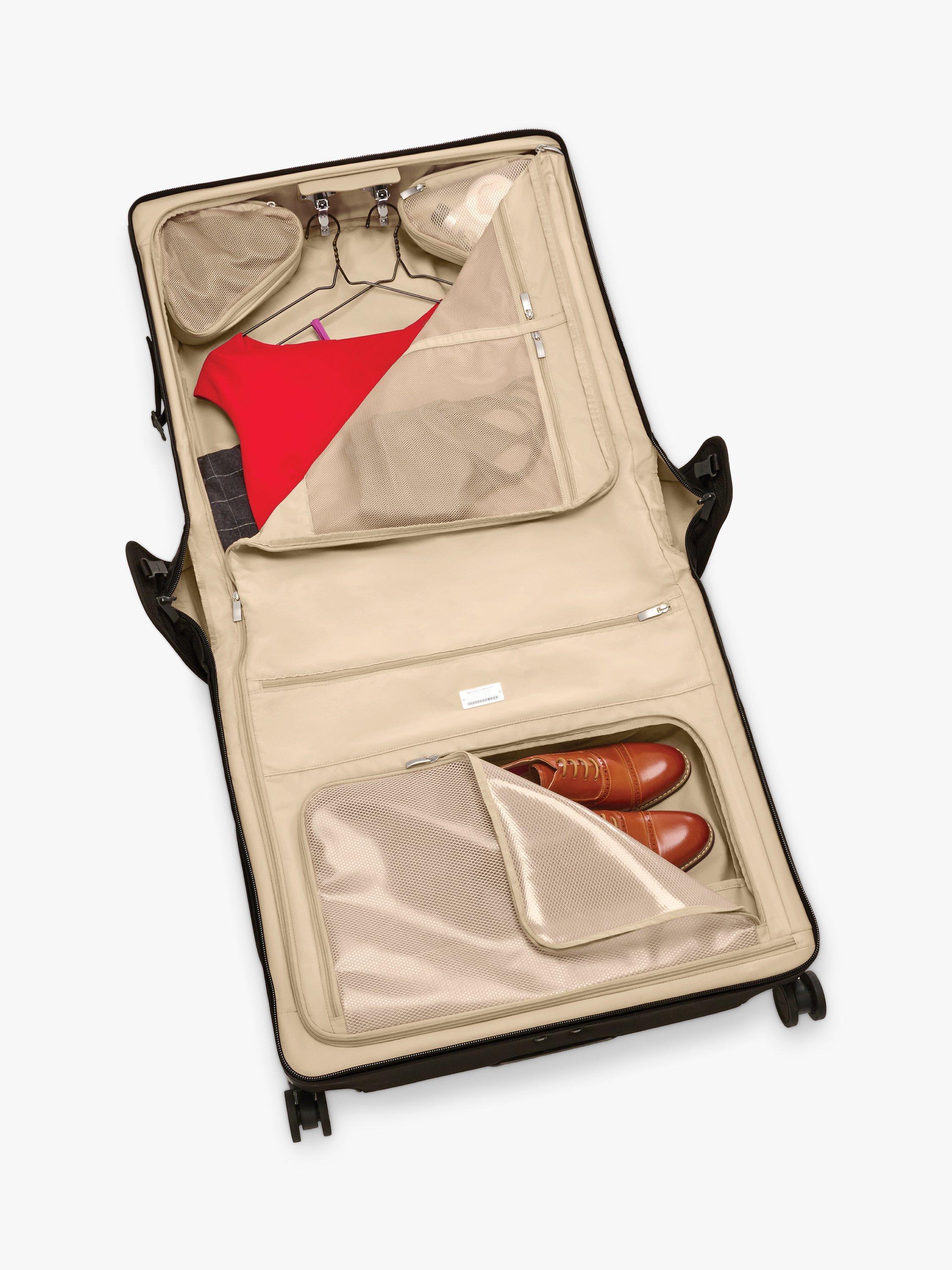The interior of the wardrobe carrier provides a divided gusseted front pocket, featuring a small section with key-keeper and a D-ring to hold hanging hooks. There's also a larger section for packing casual clothes, a jacket or shoes.