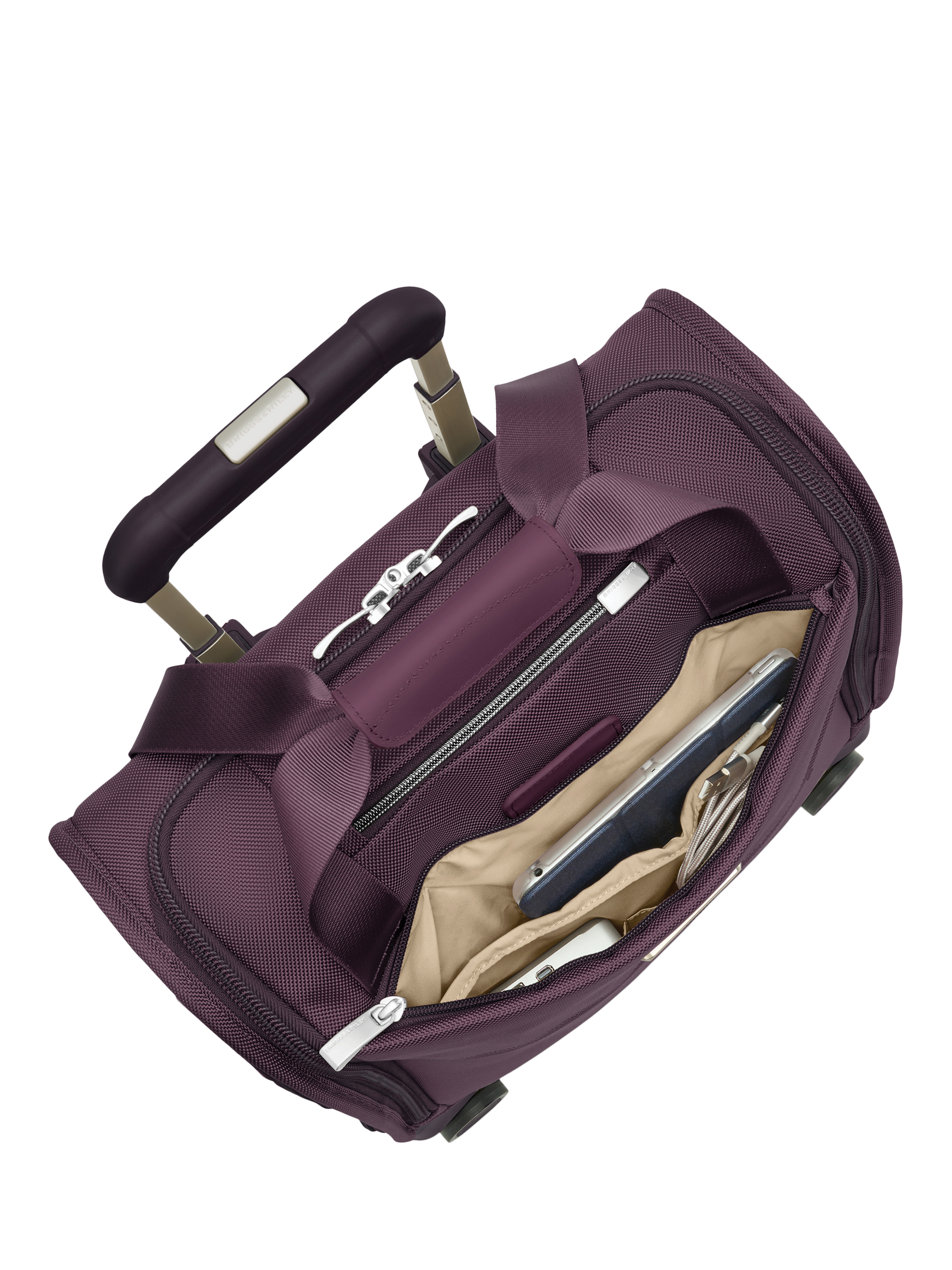 - Keep your belongings in order with a spacious main compartment. Clothes stay beautifully crisp with our revolutionary Outsider® handle design — mounted on the suitcase exterior for a smooth, flat packing surface that reduces wrinkling. Stack securely with other Briggs & Riley luggage for effortless two-in-one transport using our interlocking handle system. Navigate quietly and smoothly with the robust performance of our 360º shock-absorbing spinner wheels.