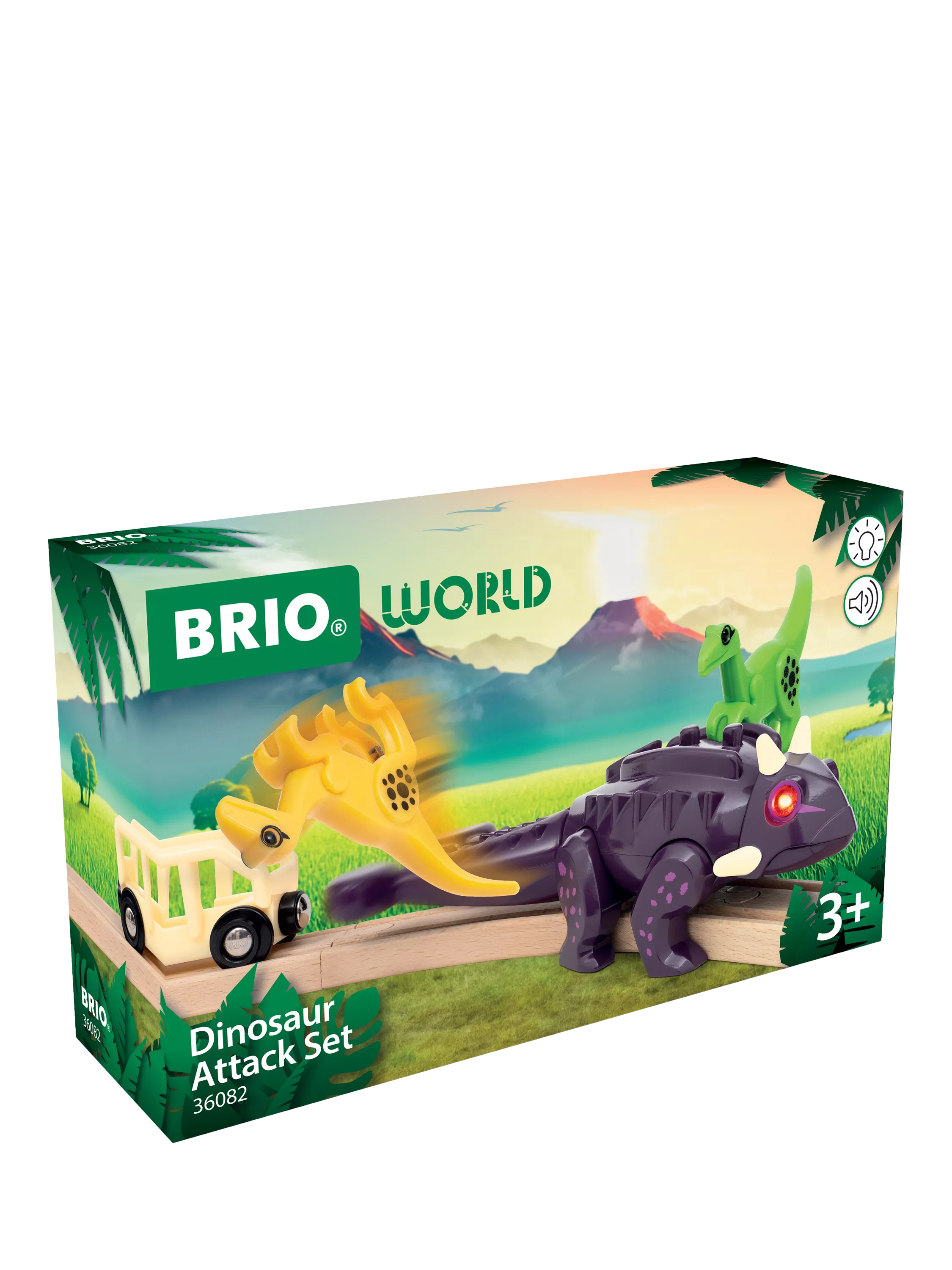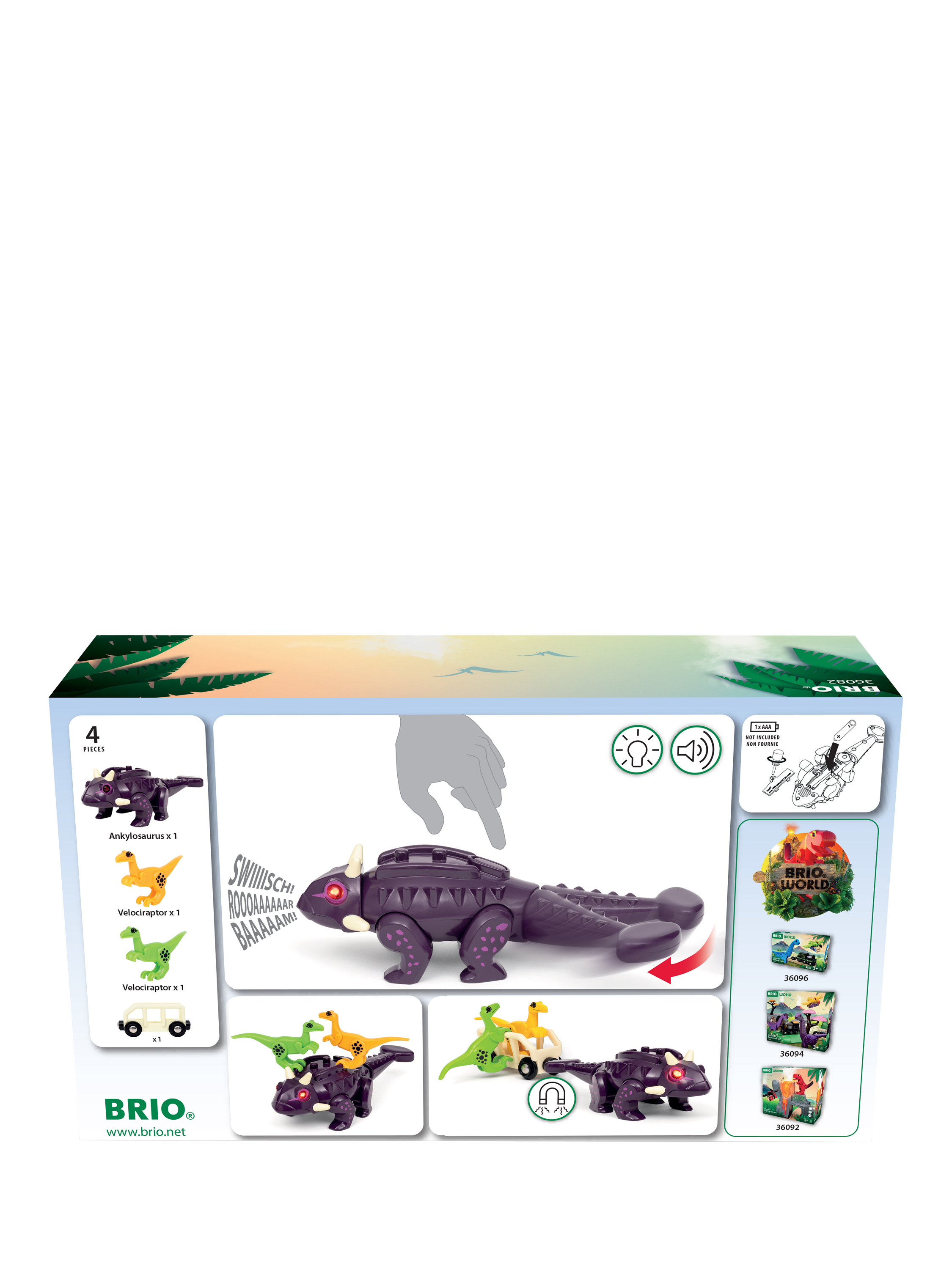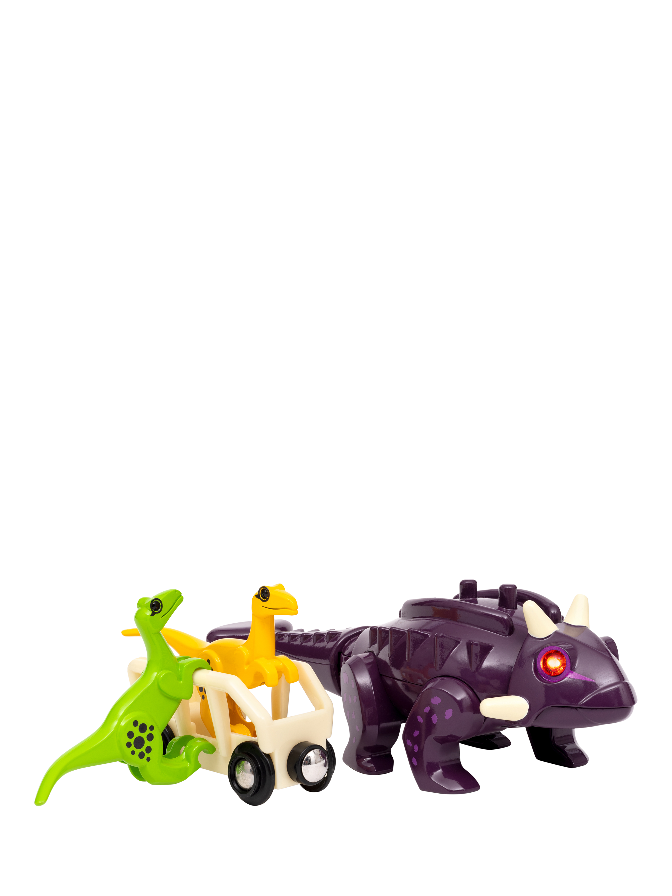 Smash through any obstacle with the 36082 Dinosaur Attack Set. Designed to fit perfectly over BRIO wooden tracks, this mighty dino comes alive with red light-up eyes and motion-activated roaring. With its spring-loaded tail ready to swing, your child can use the Ankylosaur to knock away the two colourful Velociraptor figures included in this playset.