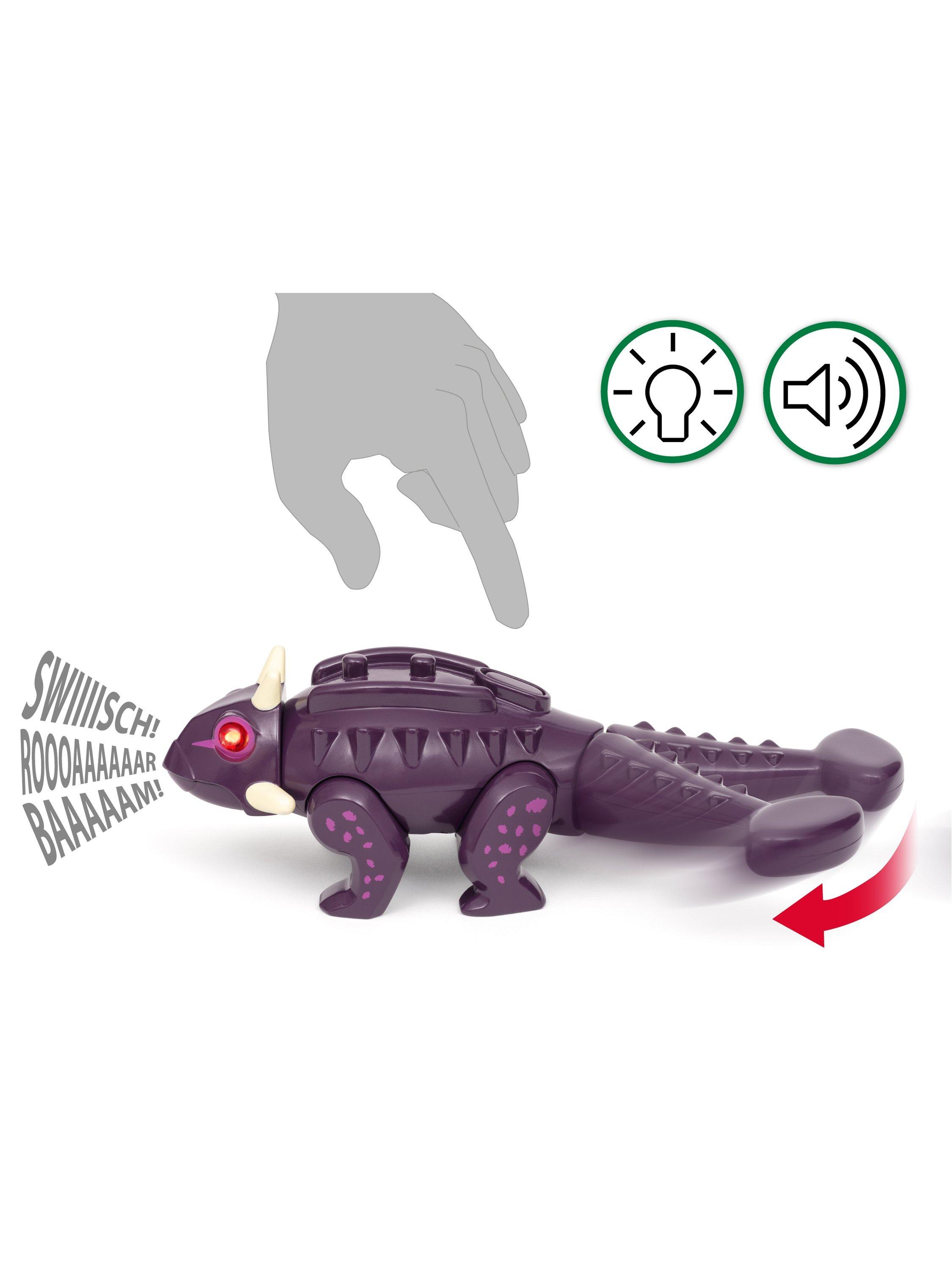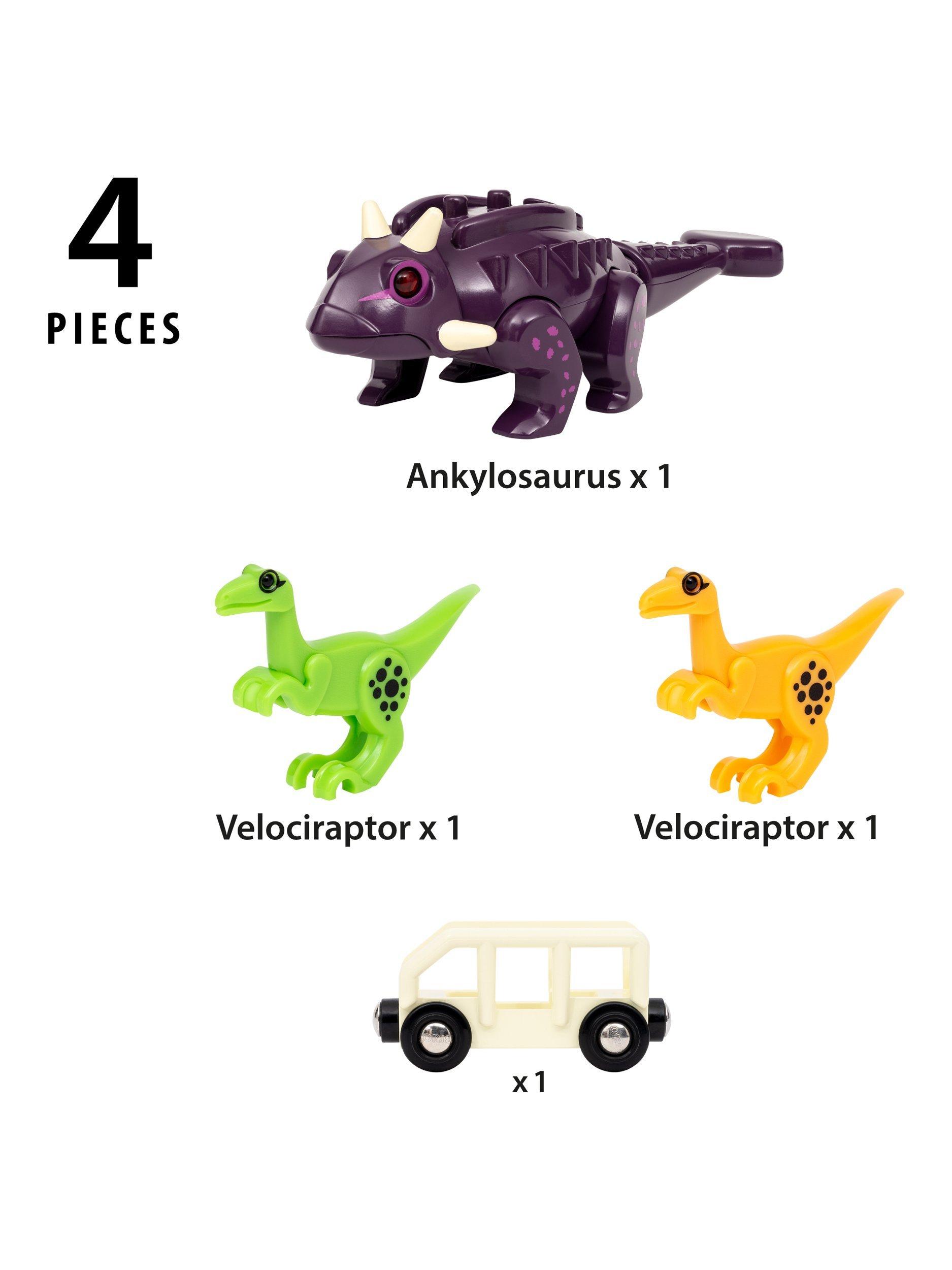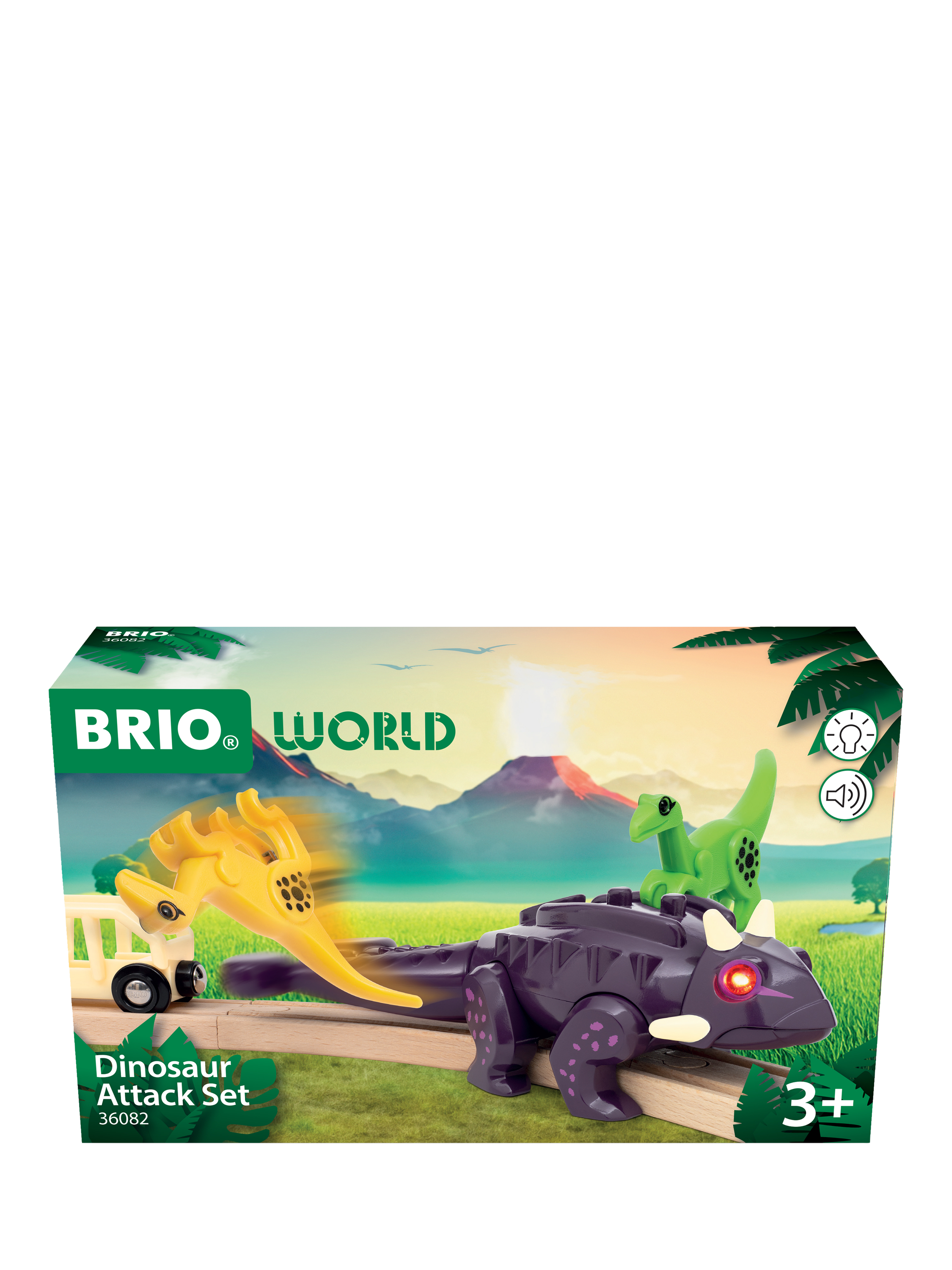 Smash through any obstacle with the 36082 Dinosaur Attack Set. Designed to fit perfectly over BRIO wooden tracks, this mighty dino comes alive with red light-up eyes and motion-activated roaring. With its spring-loaded tail ready to swing, your child can use the Ankylosaur to knock away the two colourful Velociraptor figures included in this playset.