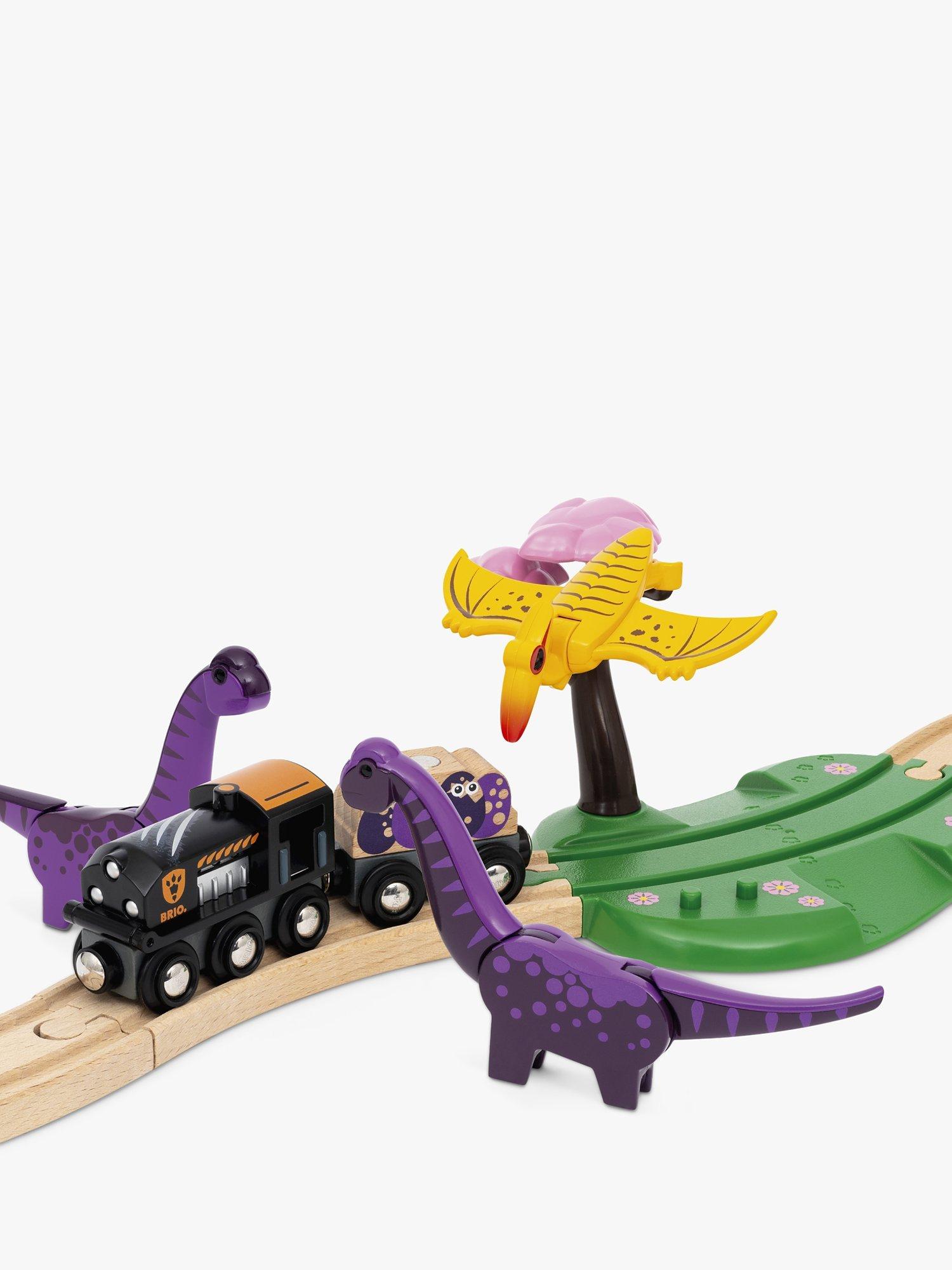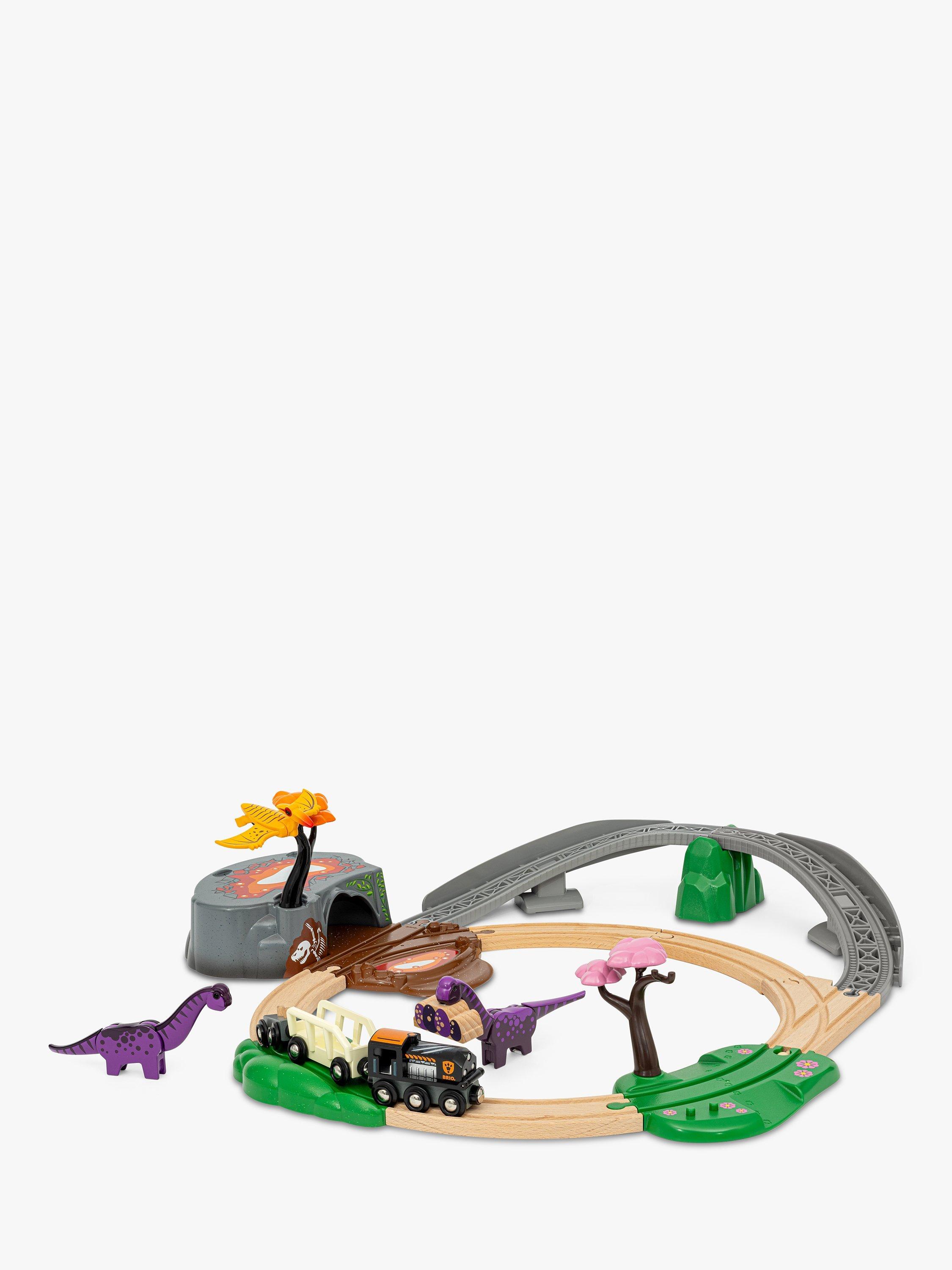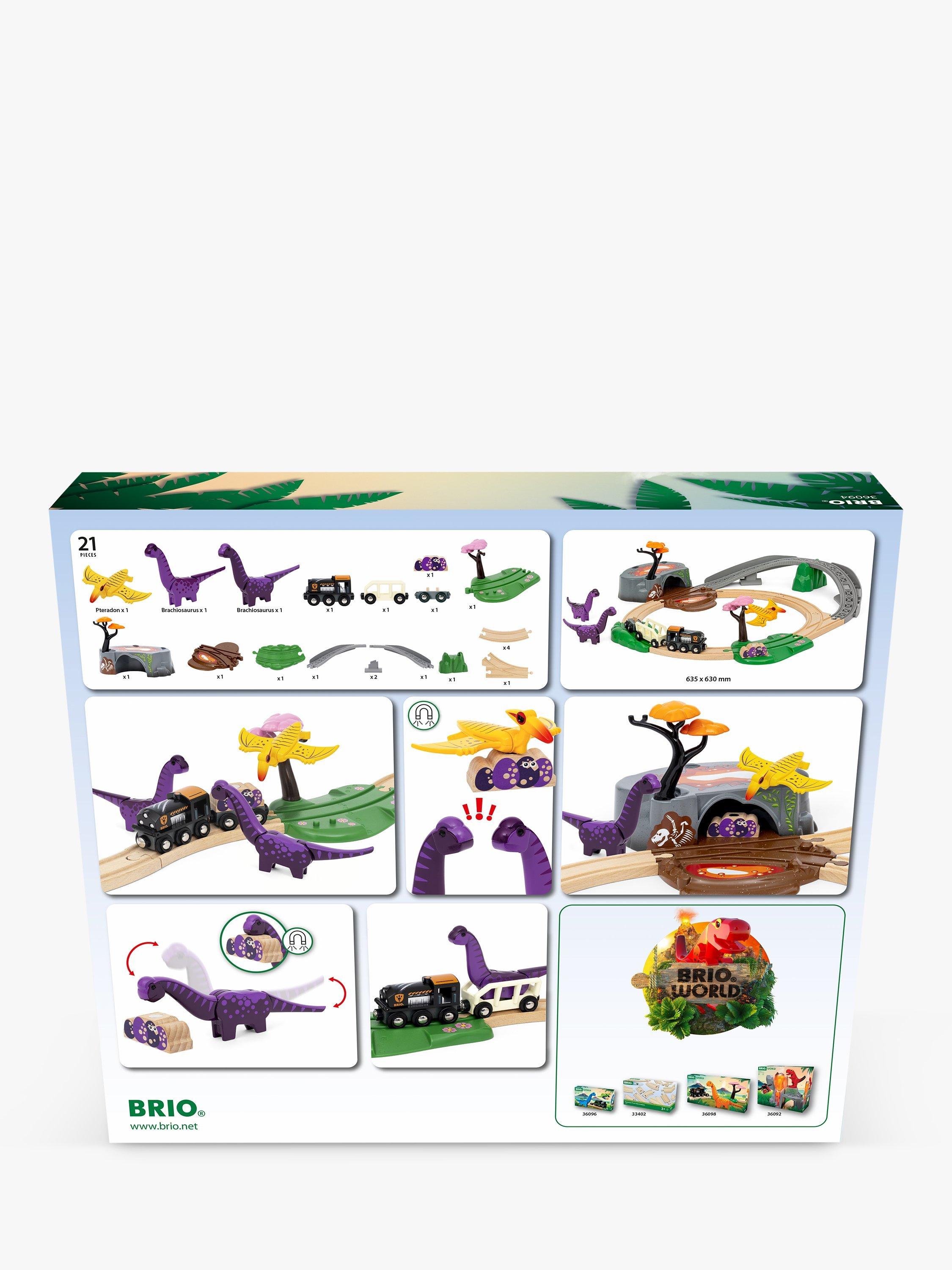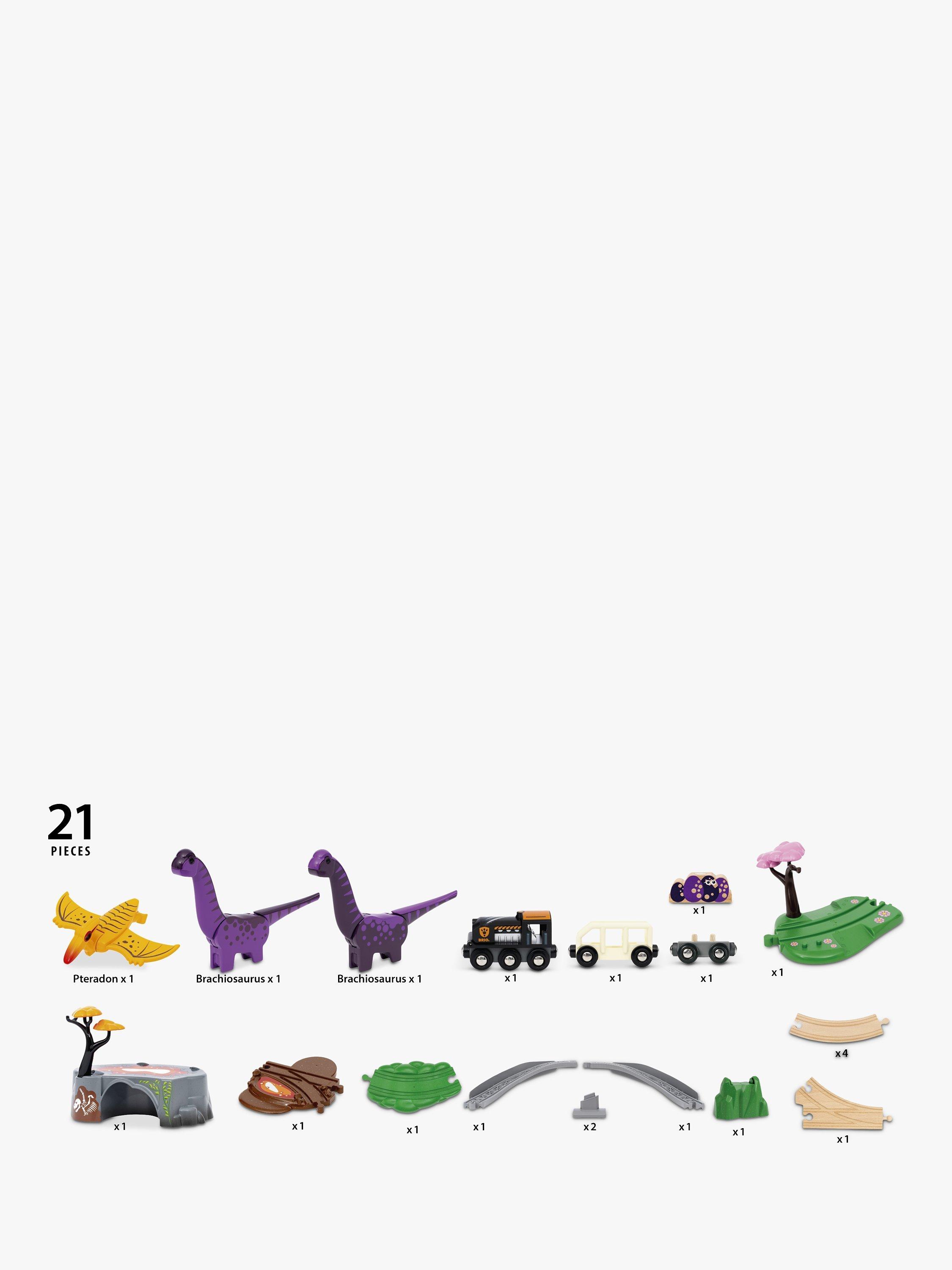 This 21-piece playset includes: a train with two wagons, multiple scenic pieces and three playful dinosaurs, designed with unique moving parts and BRIO magnets so they can interact with the world around them.