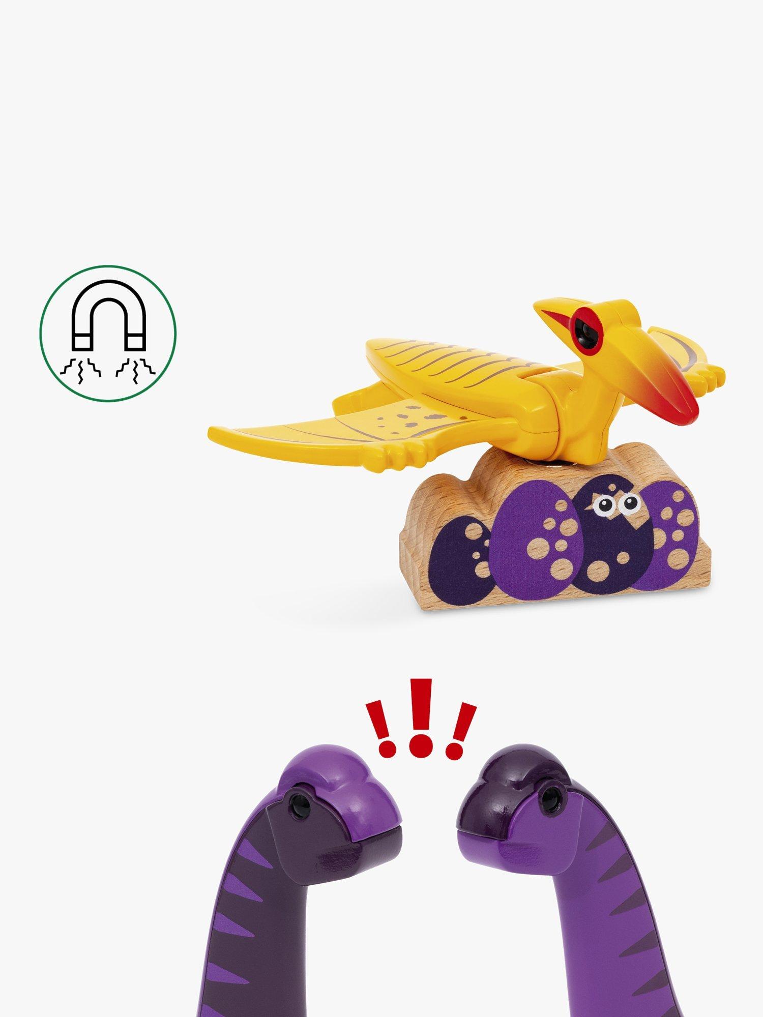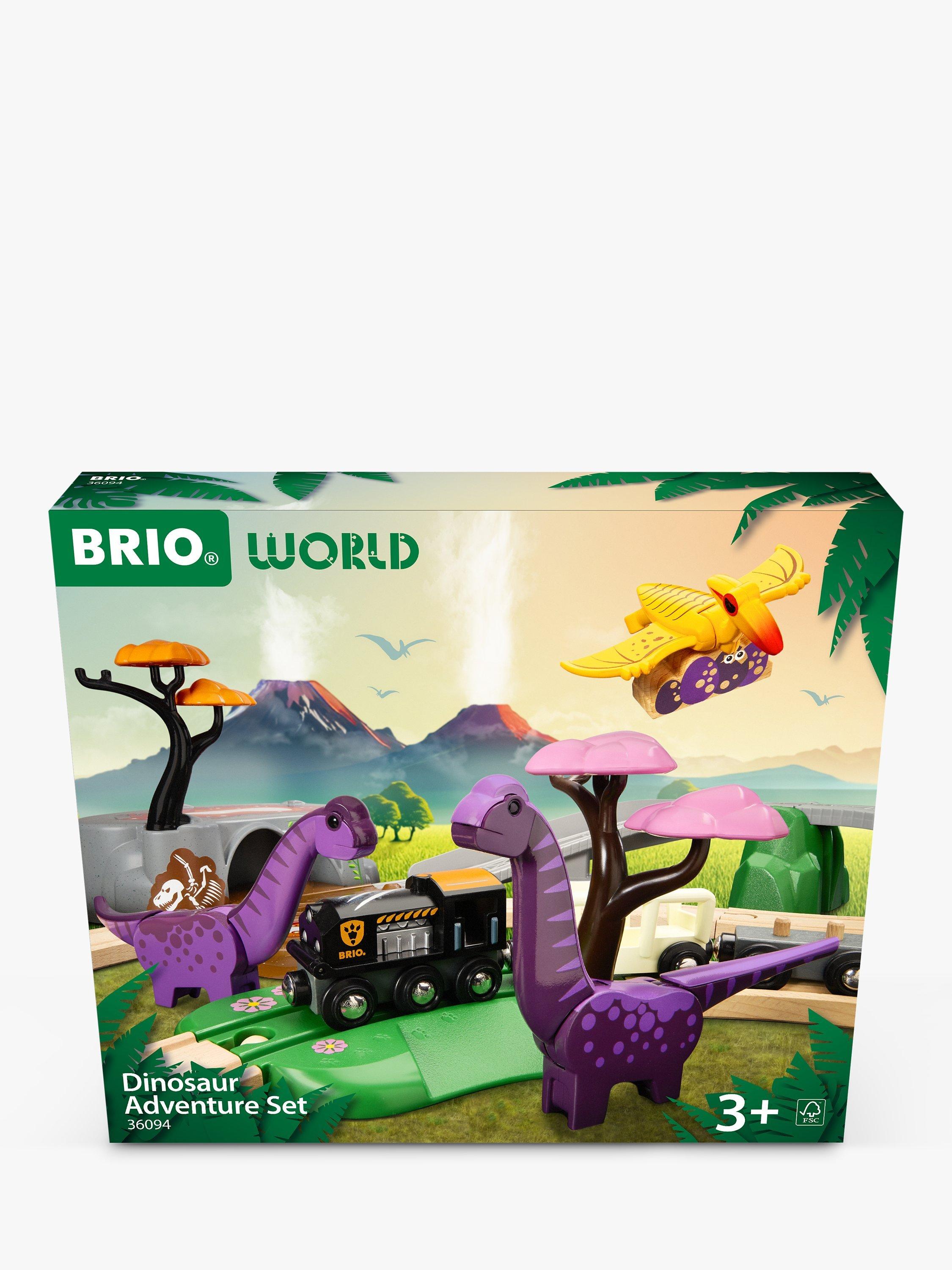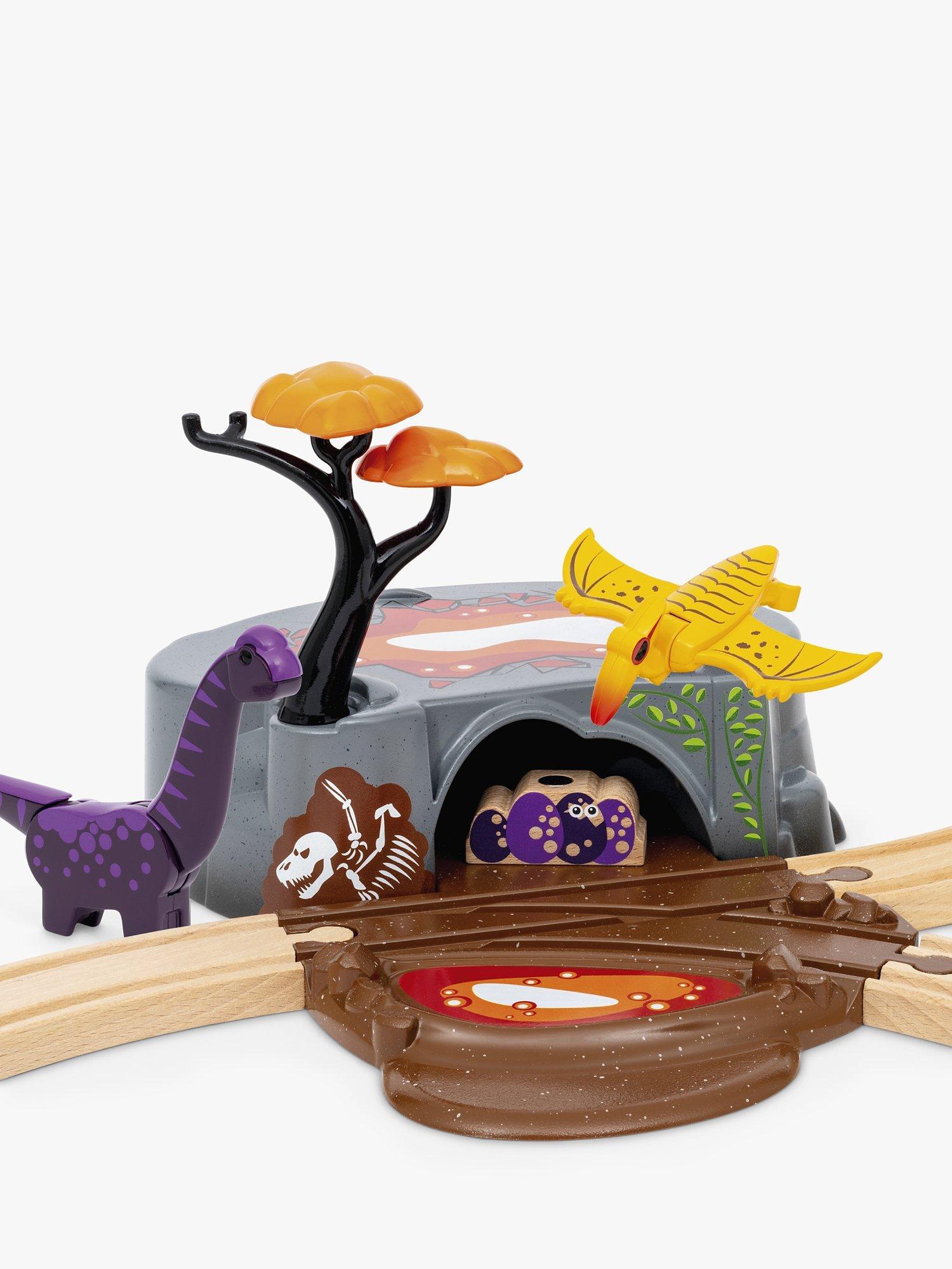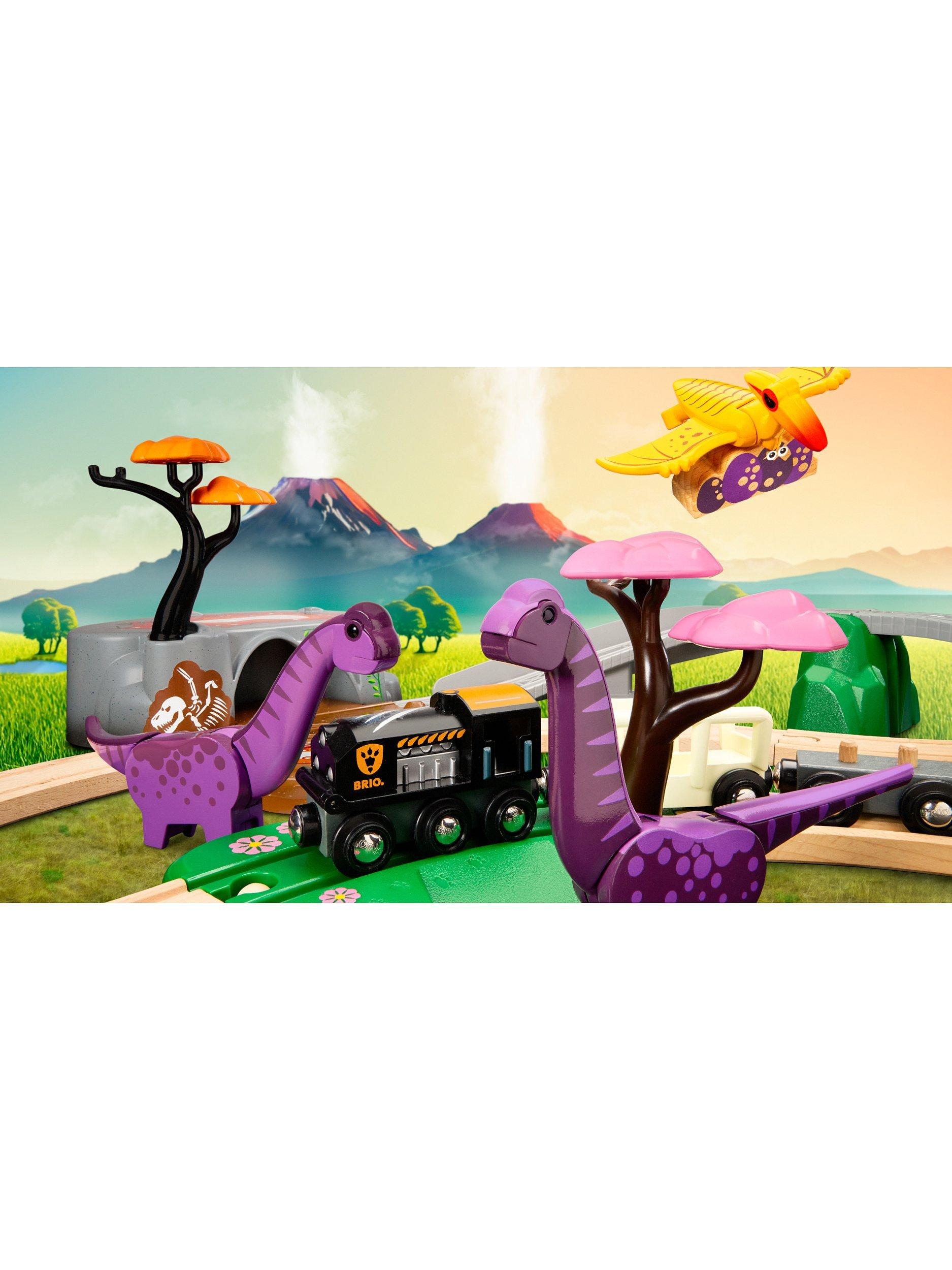 This 21-piece playset includes: a train with two wagons, multiple scenic pieces and three playful dinosaurs, designed with unique moving parts and BRIO magnets so they can interact with the world around them.