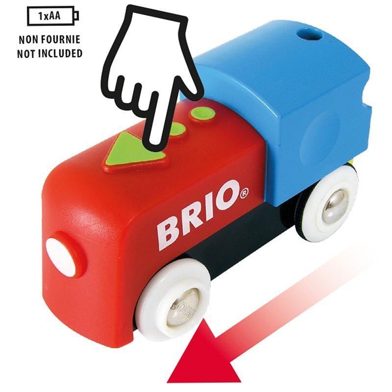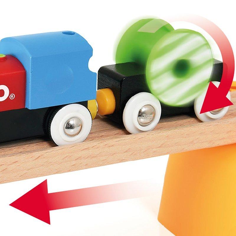The train can be helped along by little hands or push the engine button and watch it journey on its own pulling a spinning load!