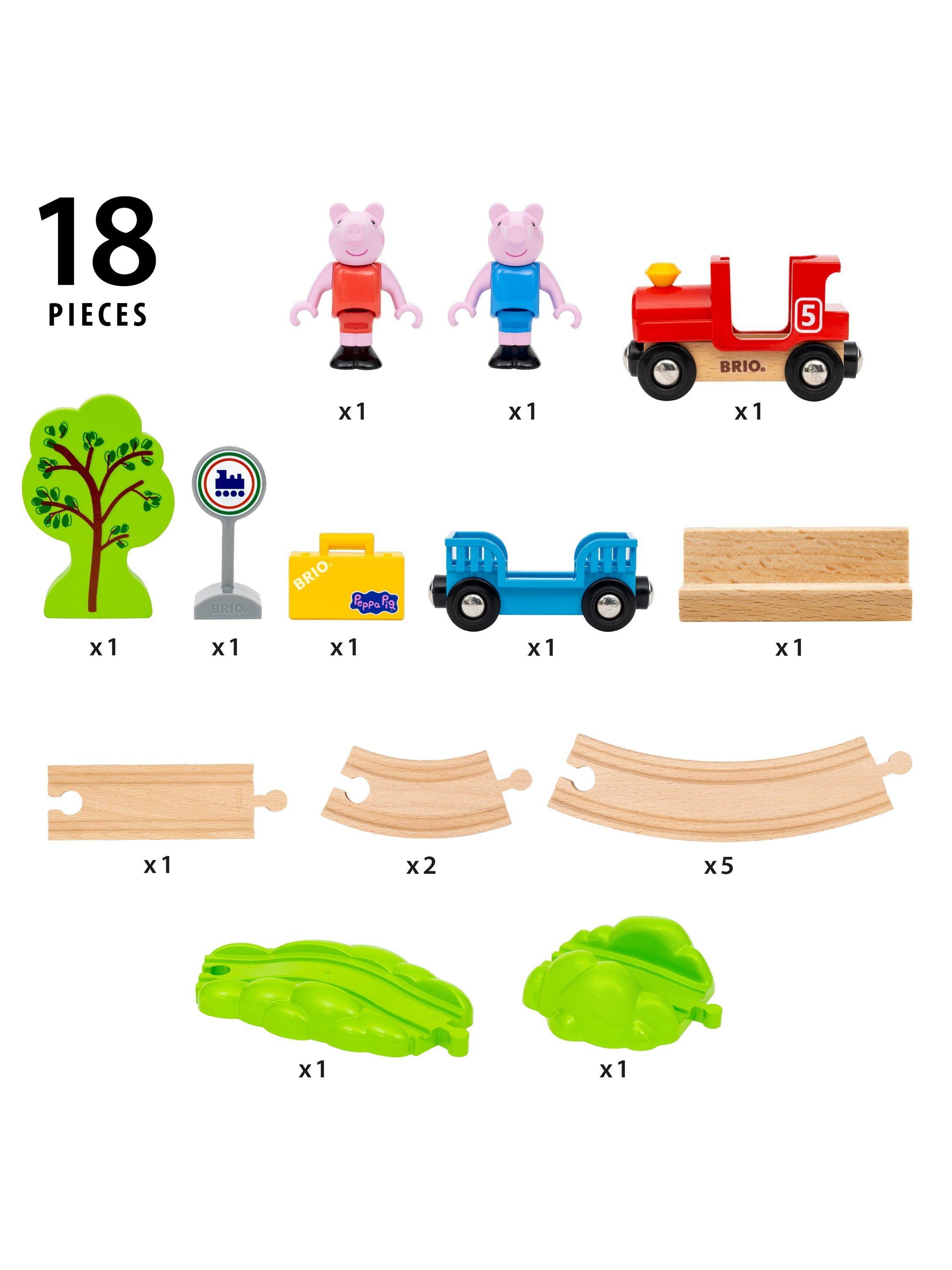 36123 Peppa Pig Train Set includes 18 pieces: 1x Peppa Pig Figure, 1x George Pig Figure, 1x Peppa Pig Engine, 1x Wagon, 1x Sign, 1x Tree, 1x Bench, 1x Suitcase, 1x A1 Track, 5x E Track, 2x E1 Track, 1x Terrain Track, 1x Rocky Bump Track.