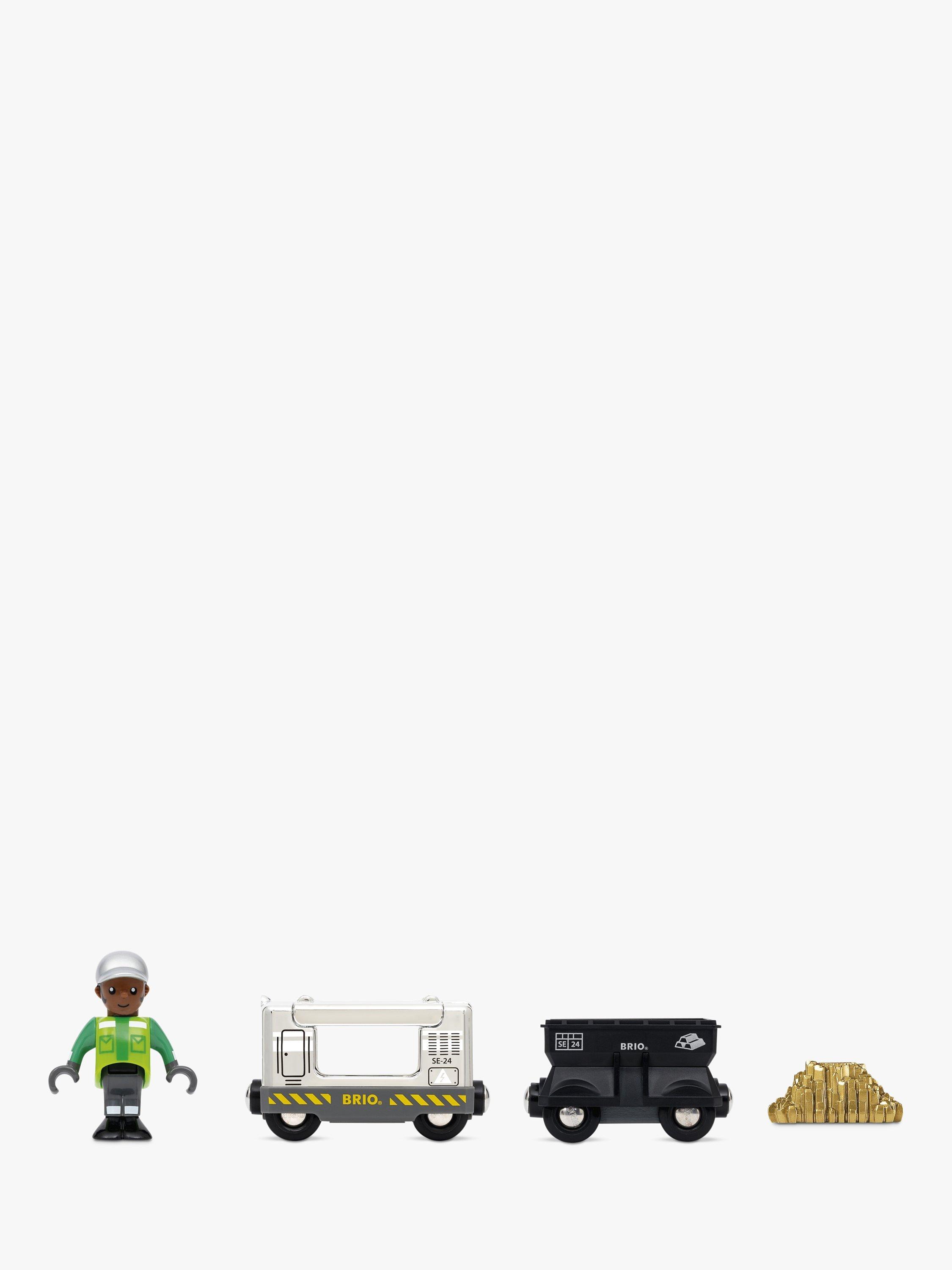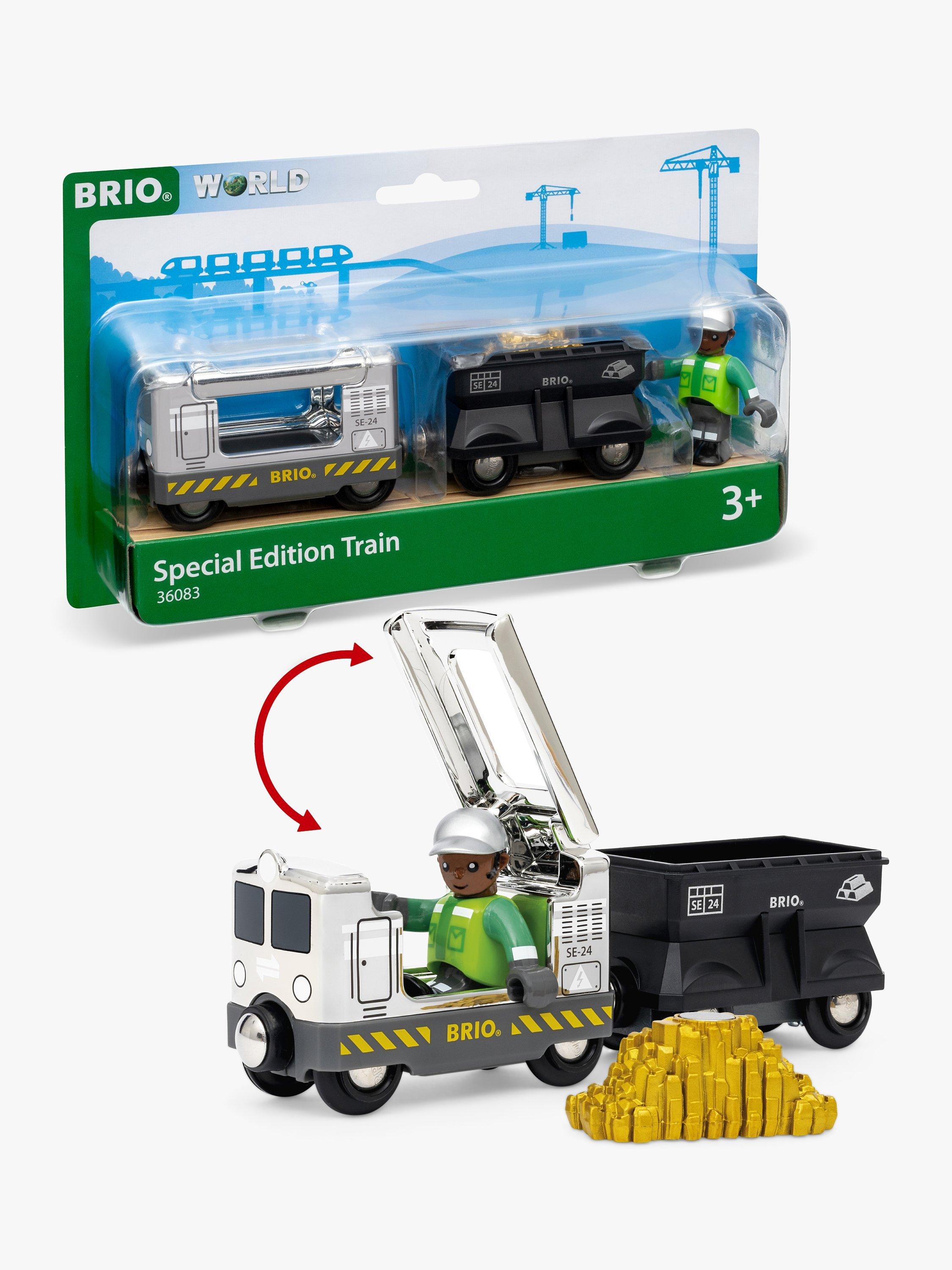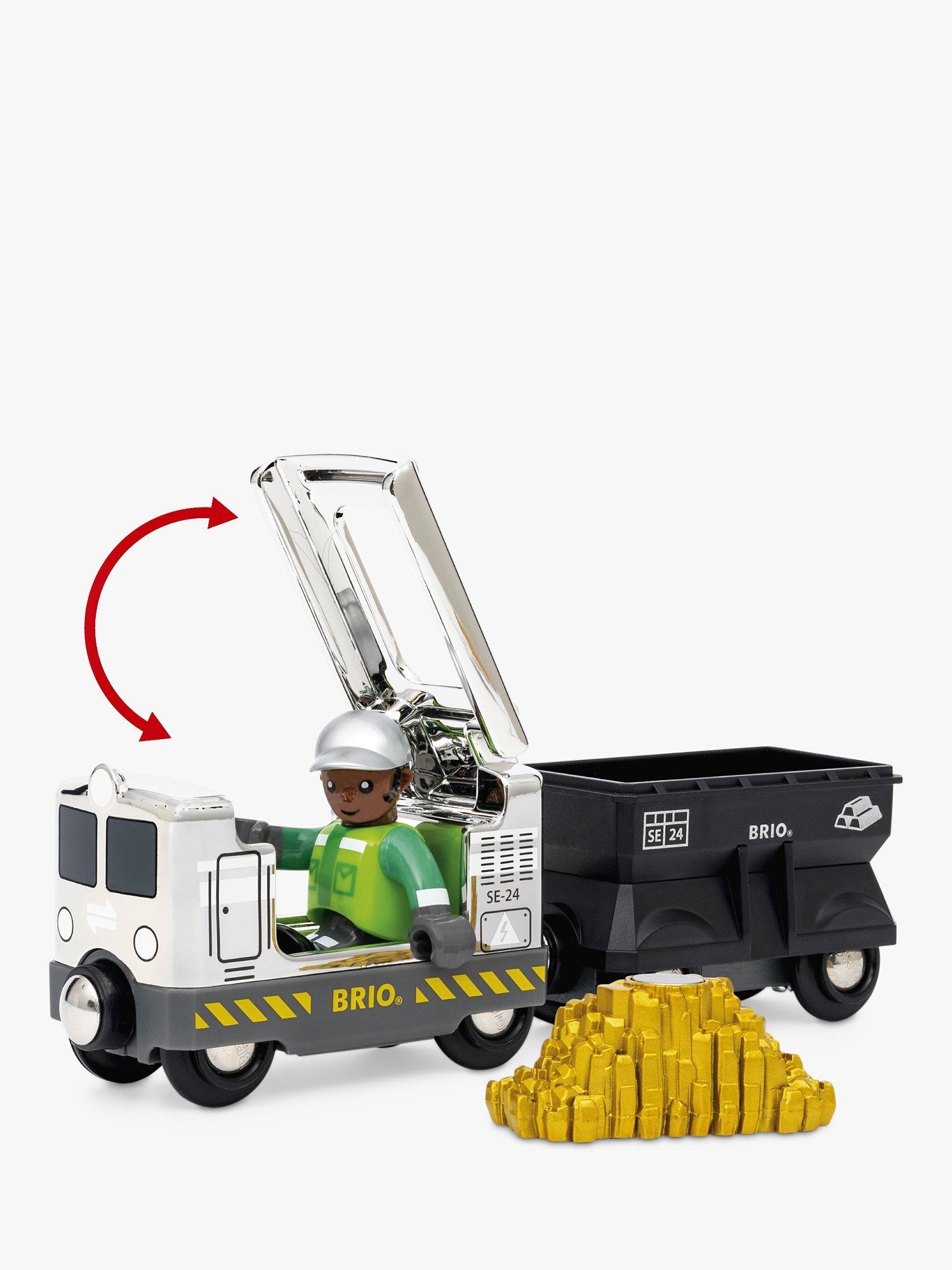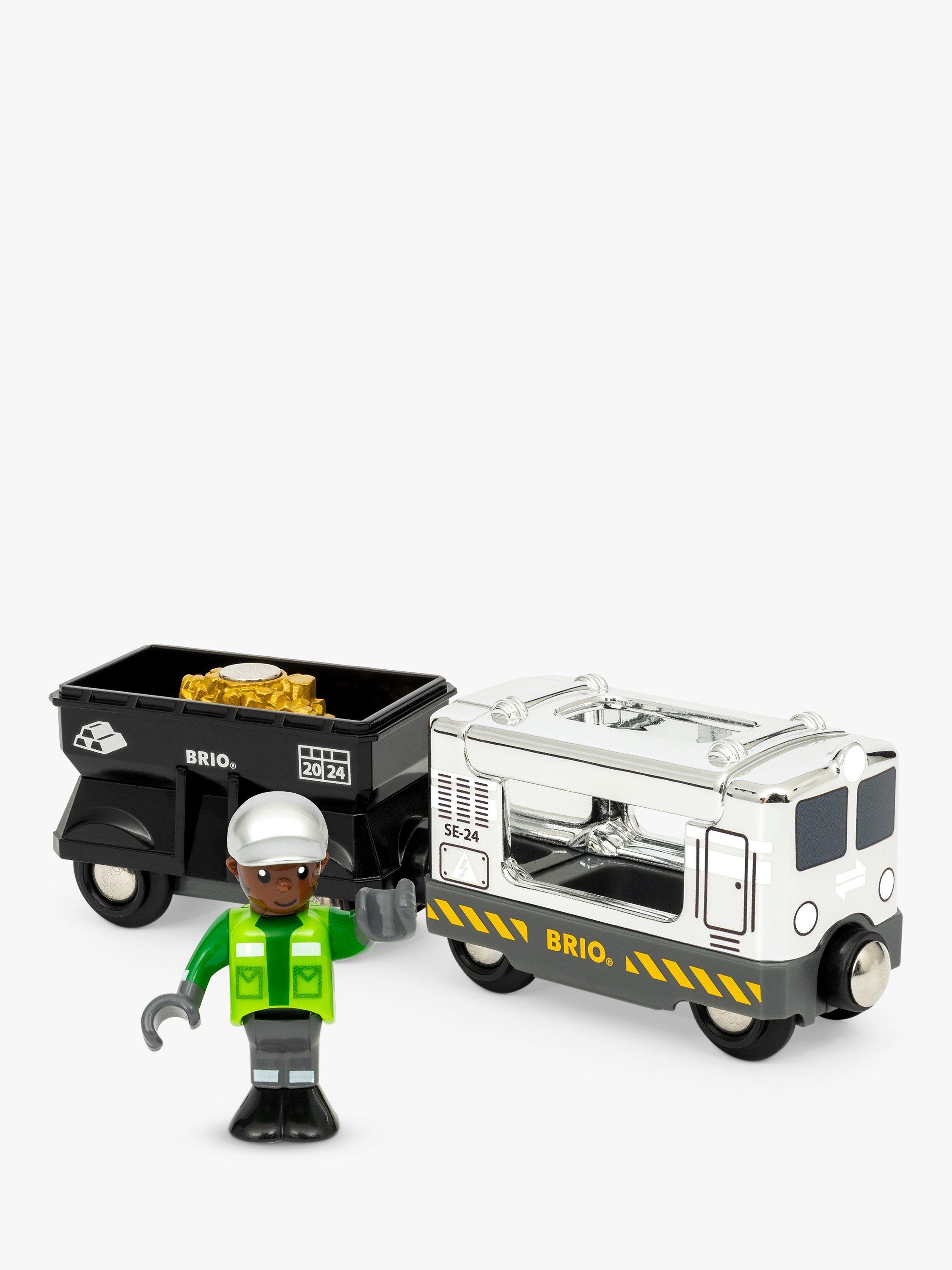 This unique cargo-themed train stands out on the tracks with its stylish silver finish and sturdy black cargo wagon. Pop the roof open and place the driver in the seat before chugging off down the tracks with the big chunk of gold.