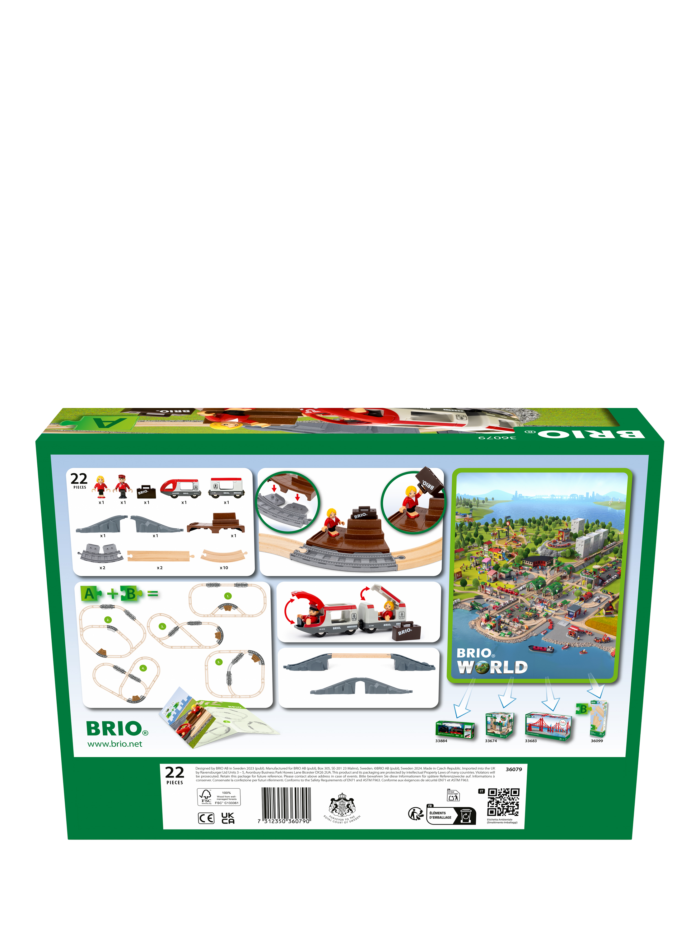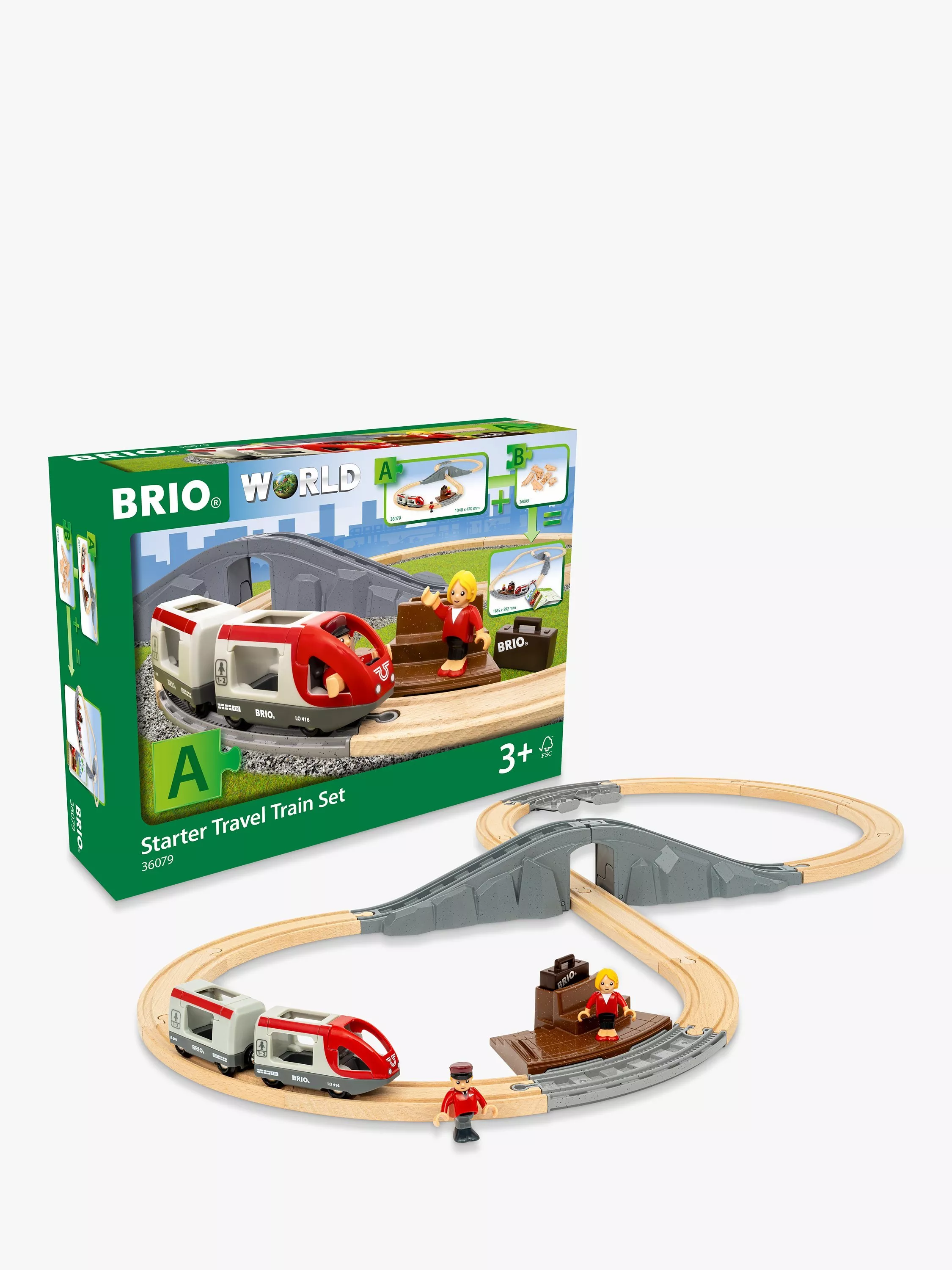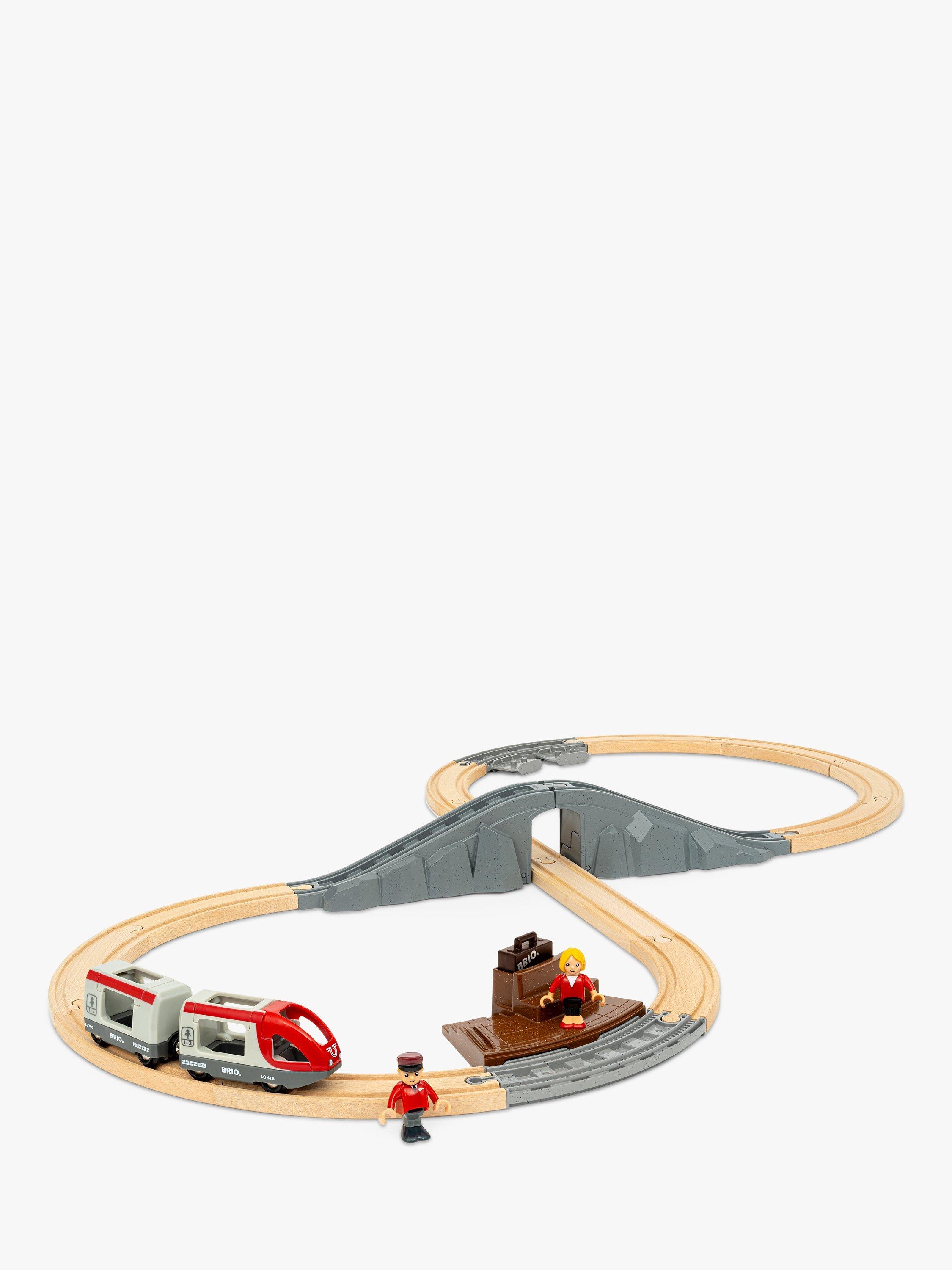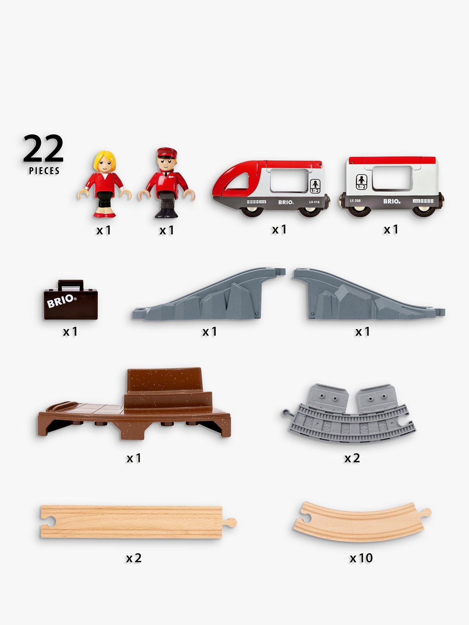 The 22-piece railway set features a classic figure 8 track layout with a tunnel and bridge intersection at its centre and station platform for character play. Place the driver figure at the front of the travel train, pick up the passenger with her luggage waiting at the platform and begin your trip around BRIO’s iconic wooden tracks.