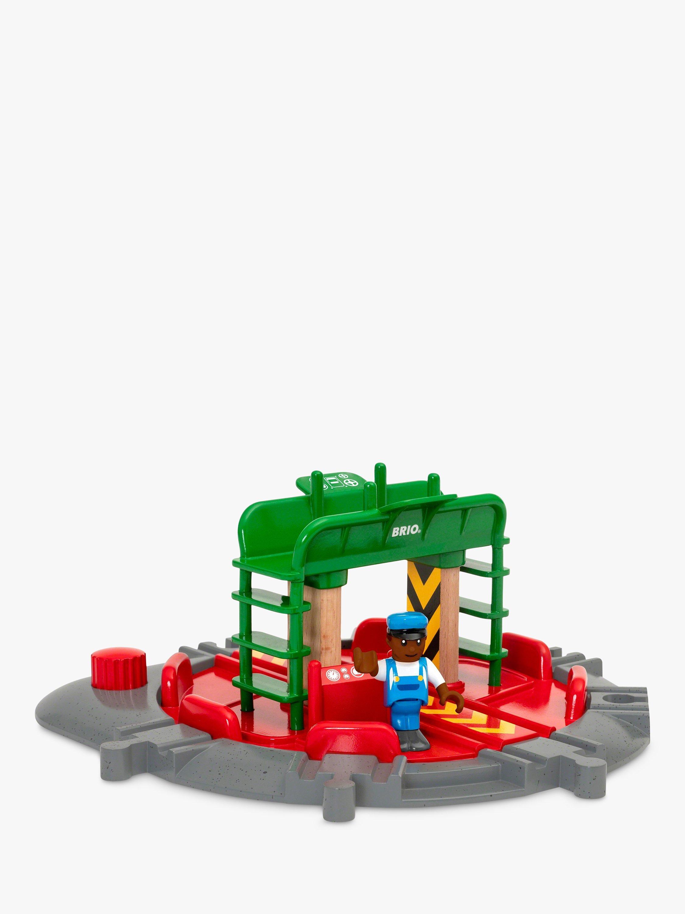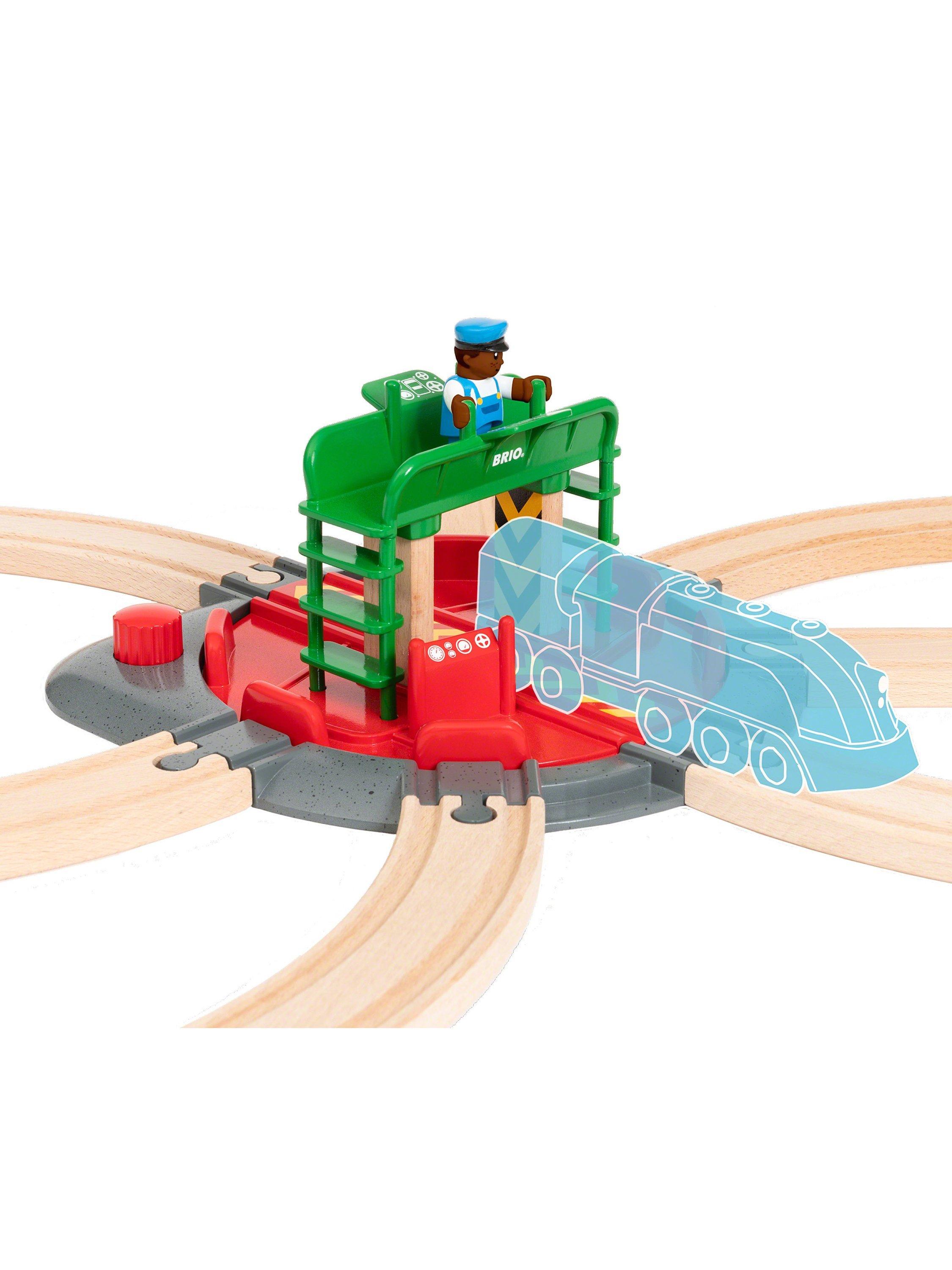 There’s enough space on the turntable to fit any engine from the BRIO World - simply twist the red knob and watch the whole central unit rotate and click into position. Also included is a train engineer figure to work the turntable from his two-level station.