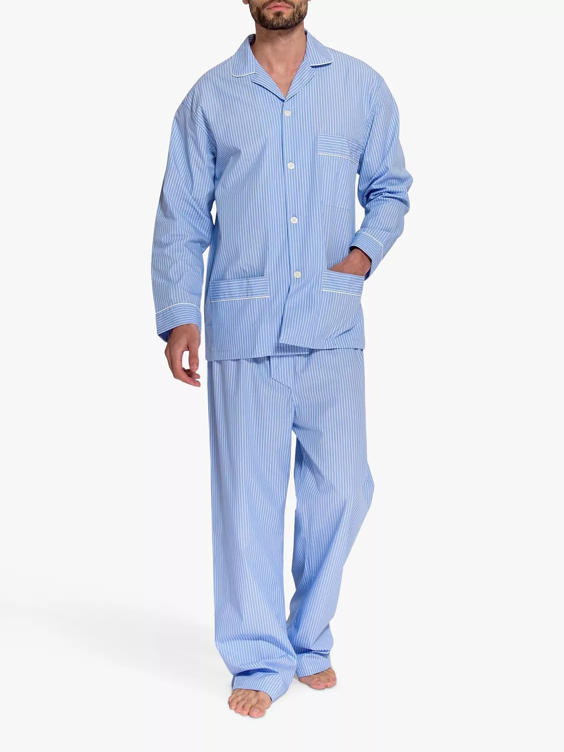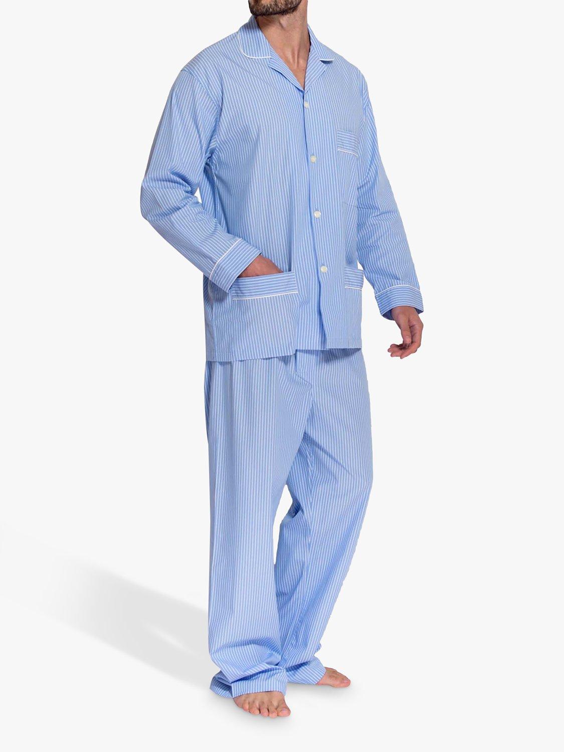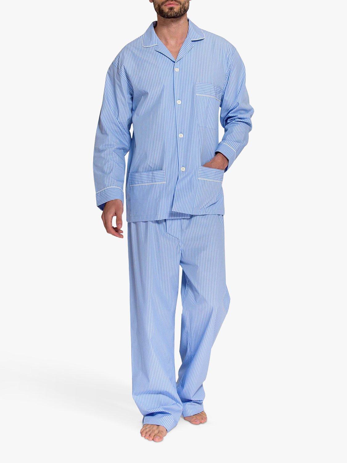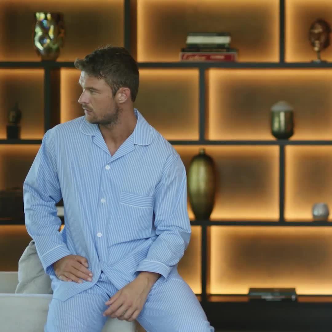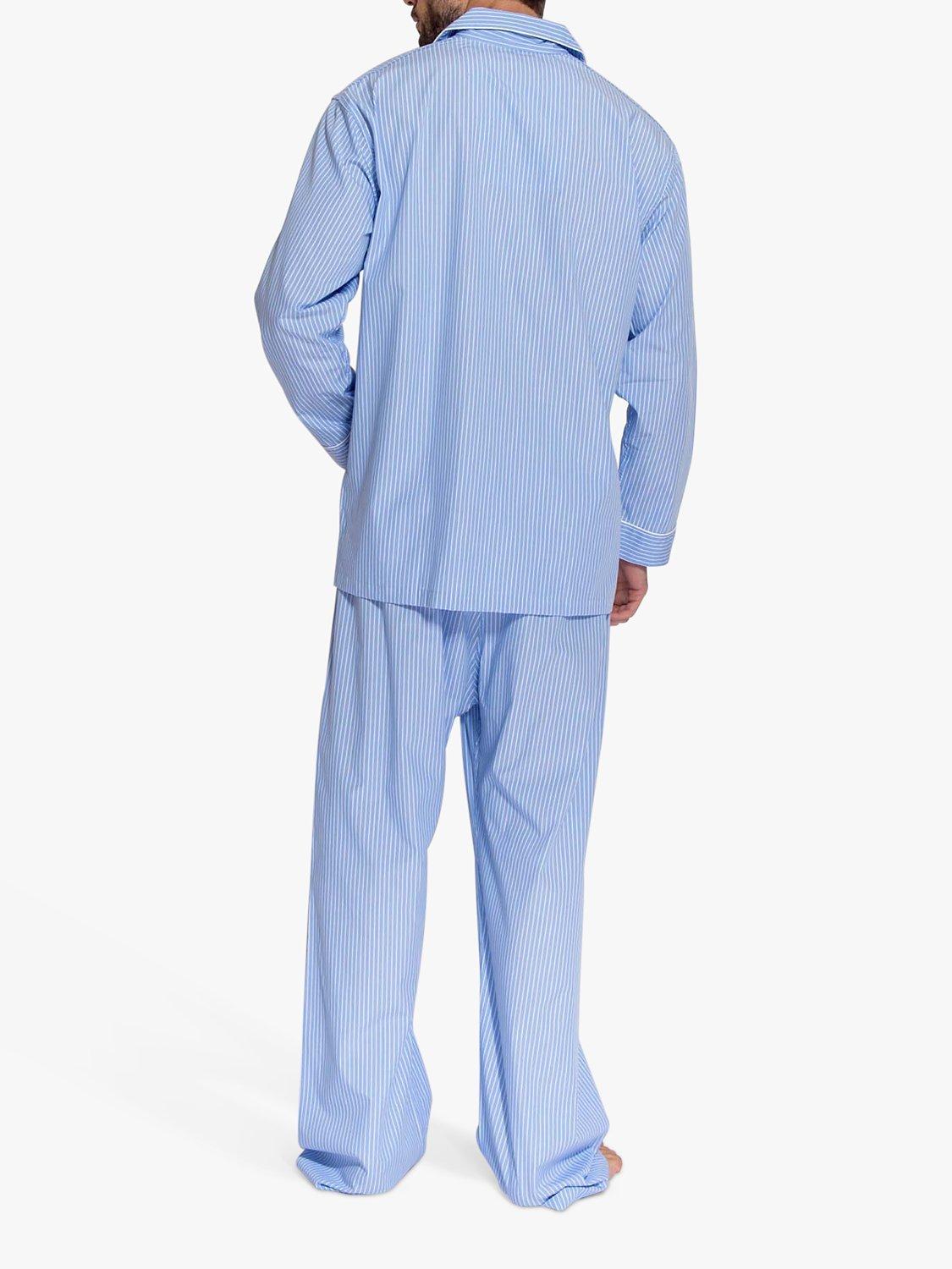 Pyjamas for year-round comfort. Crafted from beautifully crisp cotton that's naturally breathable, they'll keep you warm in winter and fresh in summer. Designed with a timeless striped pattern, the shirt is elevated with contrast piping detail and features three pockets. The trousers have a hidden button on the fly and soft elastic waistband. Shirt length: 30"/76cm. Trousers: fit leg up to 32"/81cm.