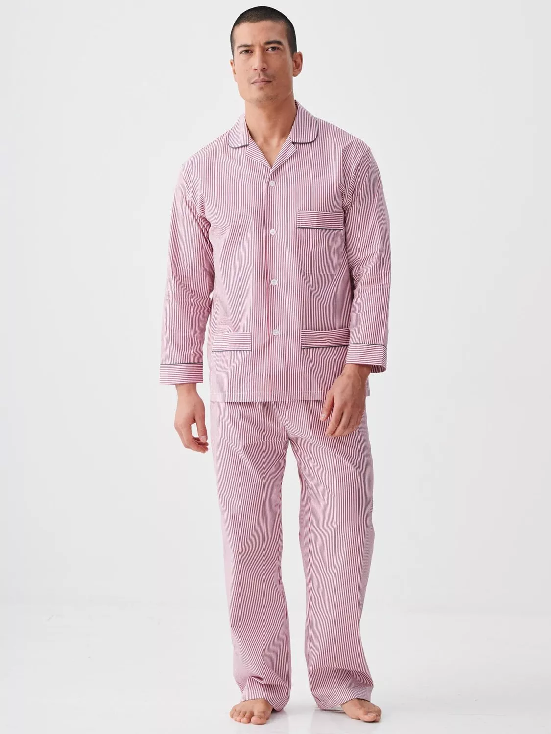 Pyjamas for year-round comfort. Crafted from beautifully crisp cotton that's naturally breathable, they'll keep you warm in winter and fresh in summer. Designed with a timeless striped pattern, the shirt is elevated with contrast piping detail and features three pockets. The trousers have a hidden button on the fly and soft elastic waistband. Shirt length: 30"/76cm. Trousers: fit leg up to 32"/81cm.